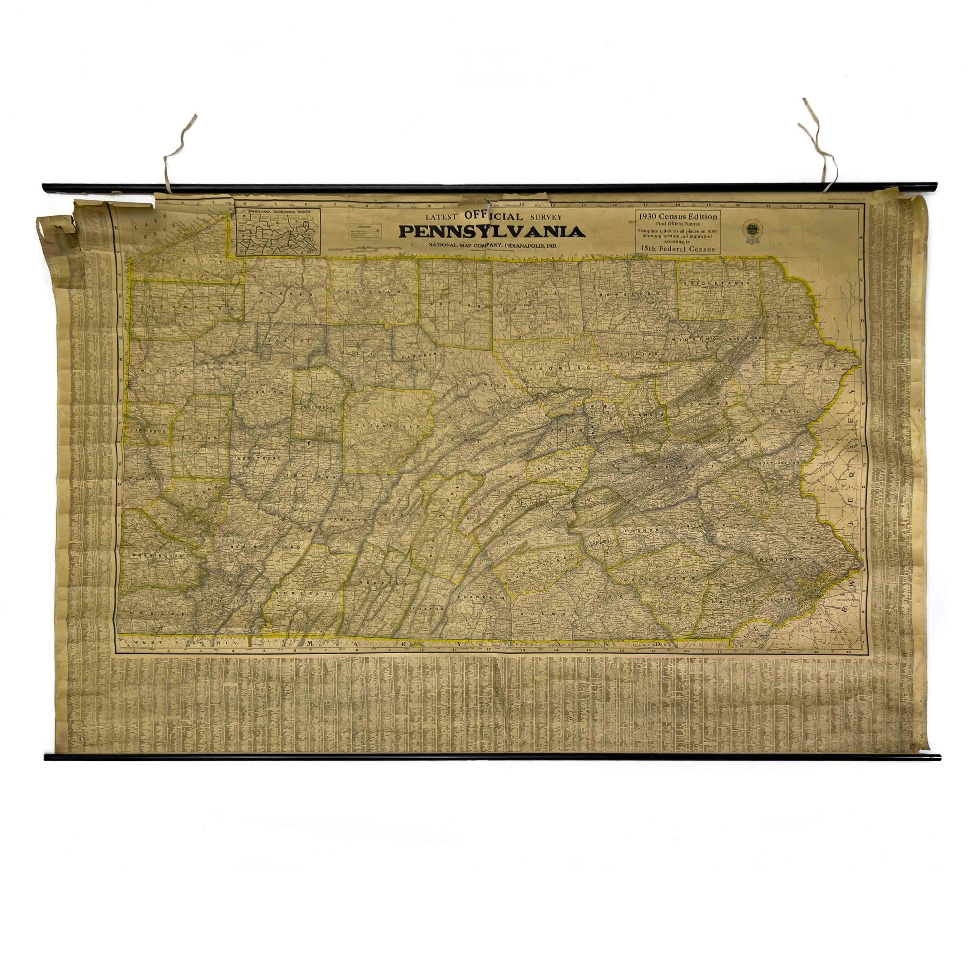 Map of the offical survey of Pennsylvania from the 1930 census, on spring shade roller, published National Map Company, Indianapolis, IND.