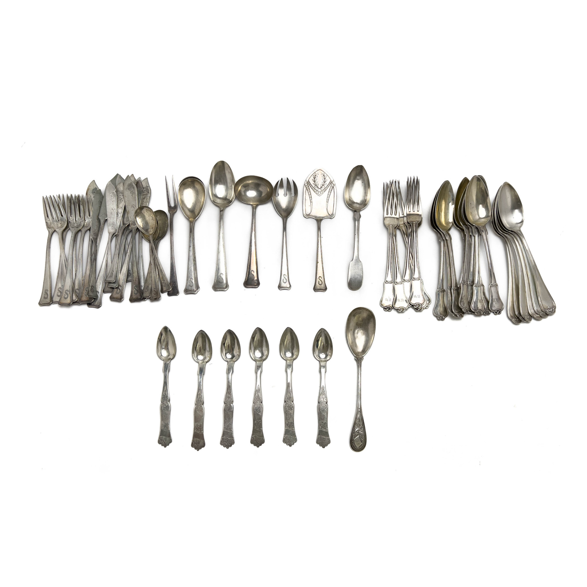 Comprising partial flatware sets, including knives, forks, spoons, and some serving pieces