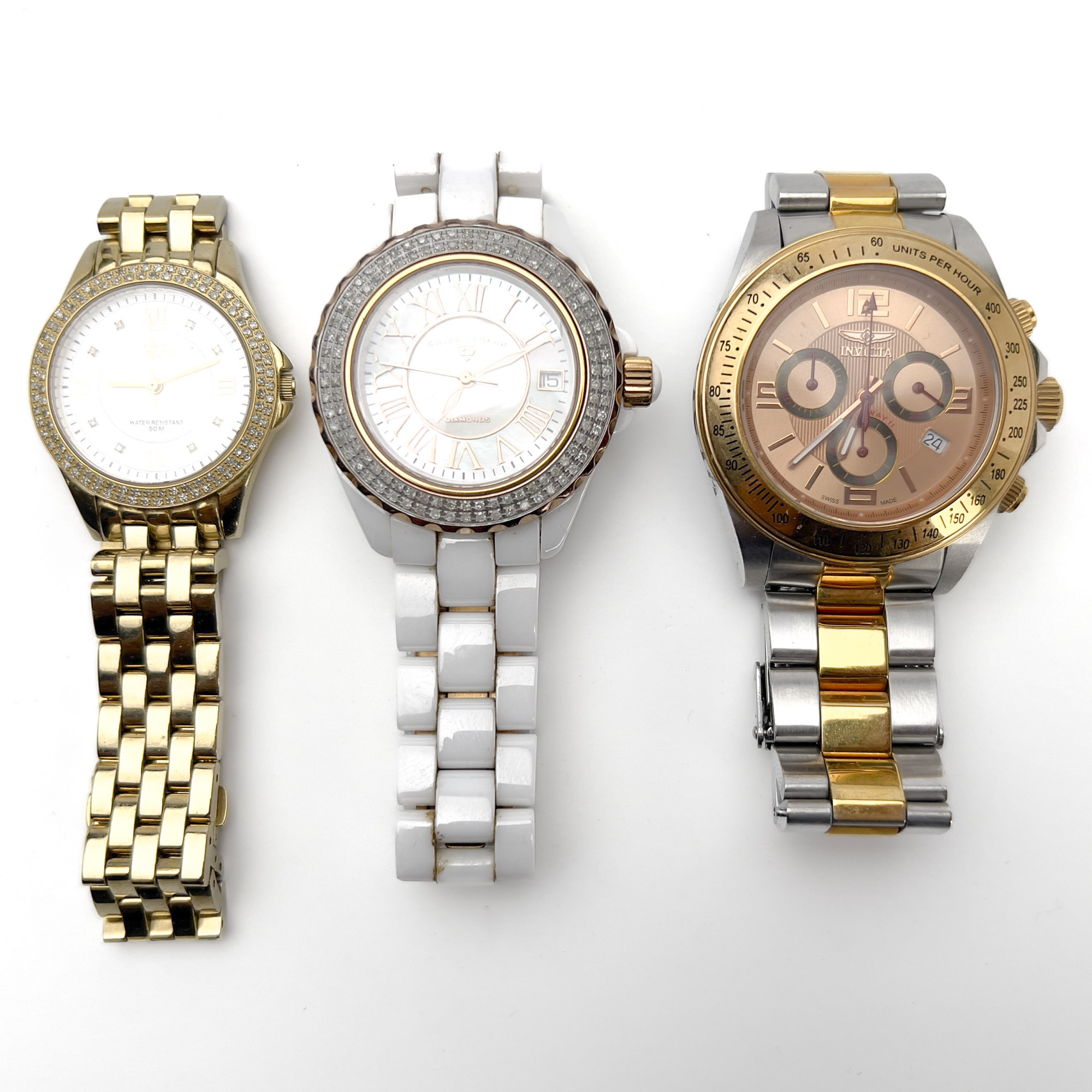 overall good condition, sold as is, Adee Kaye automatic operational at time of cataloging, three Invictas with quartz movement assumed working, need batteries.