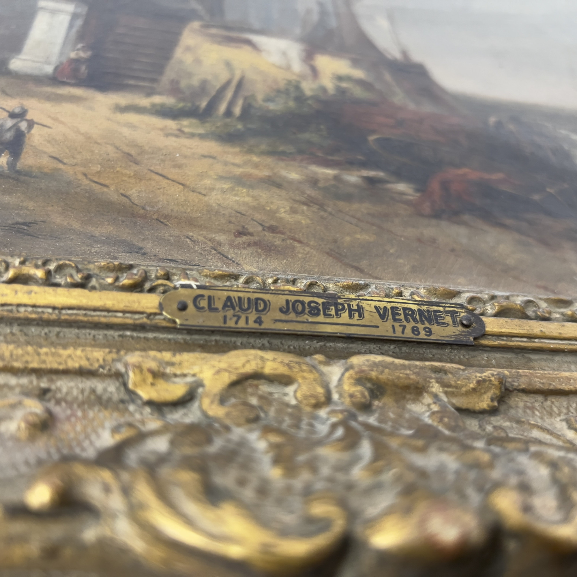A painting of an 18th century European Seaside village, with a Claude-Joseph Vernet plaque