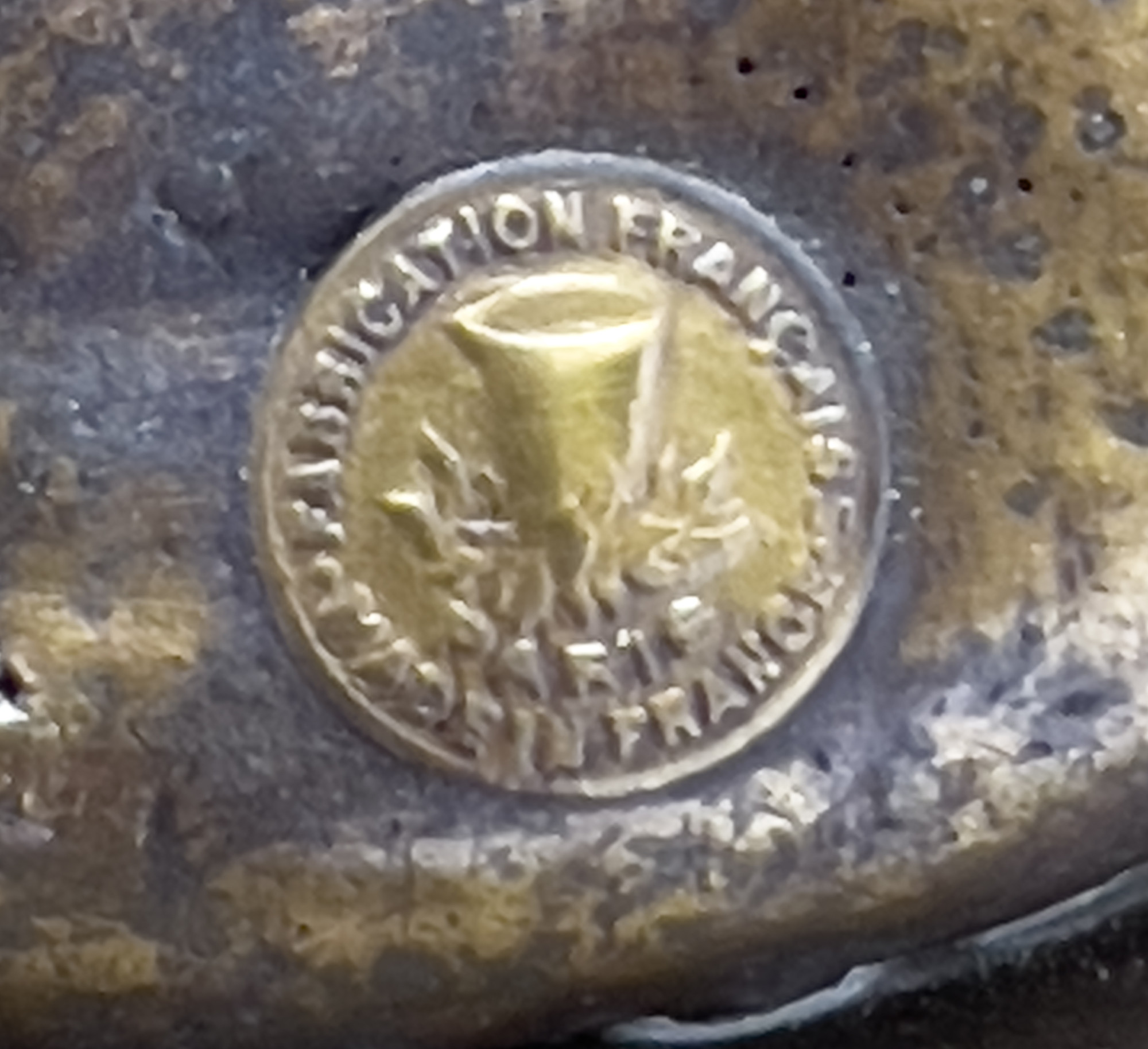 Bronze patinated white metal sculpture, mounted as a single light lamp, with made in France plaque toward base, with cast signature verso