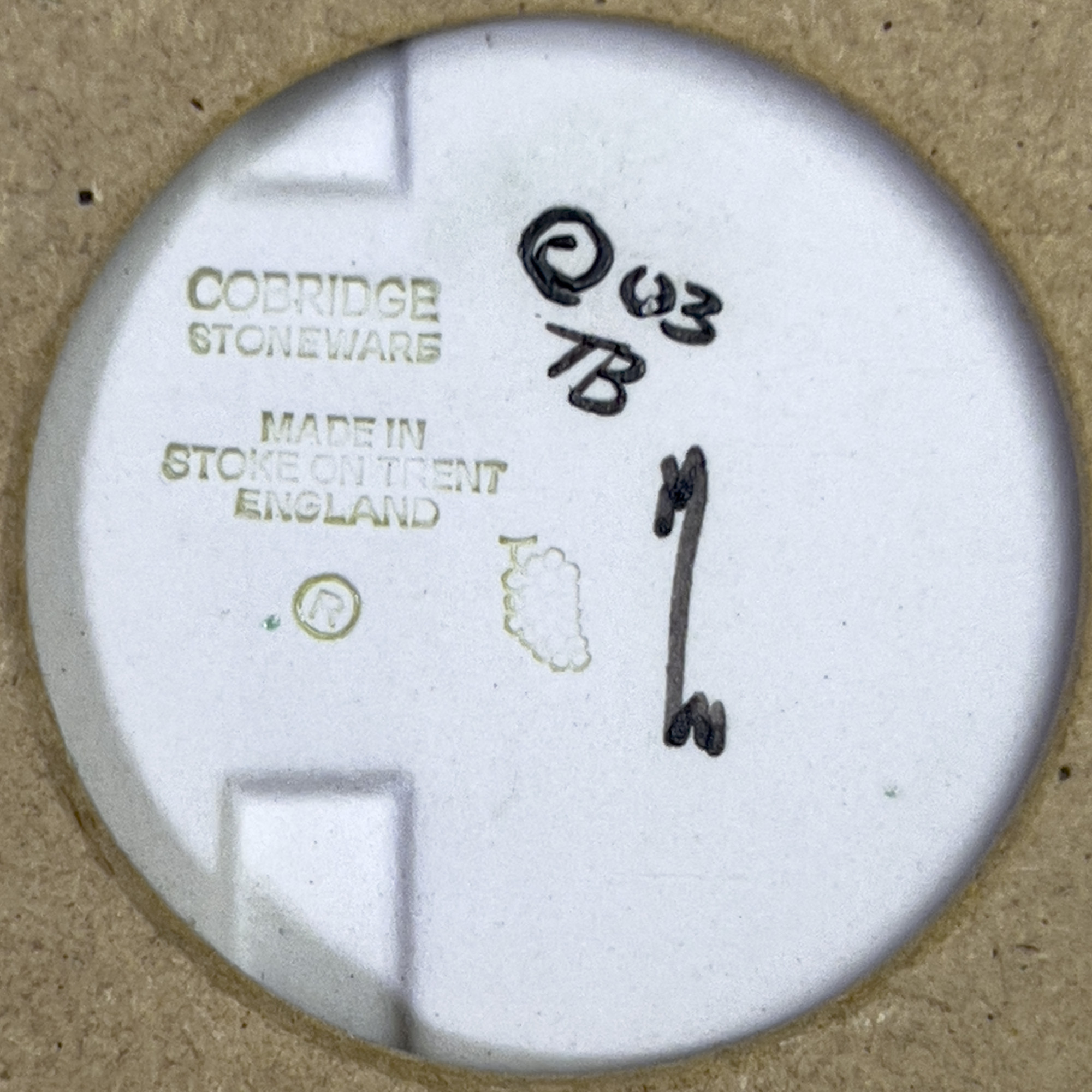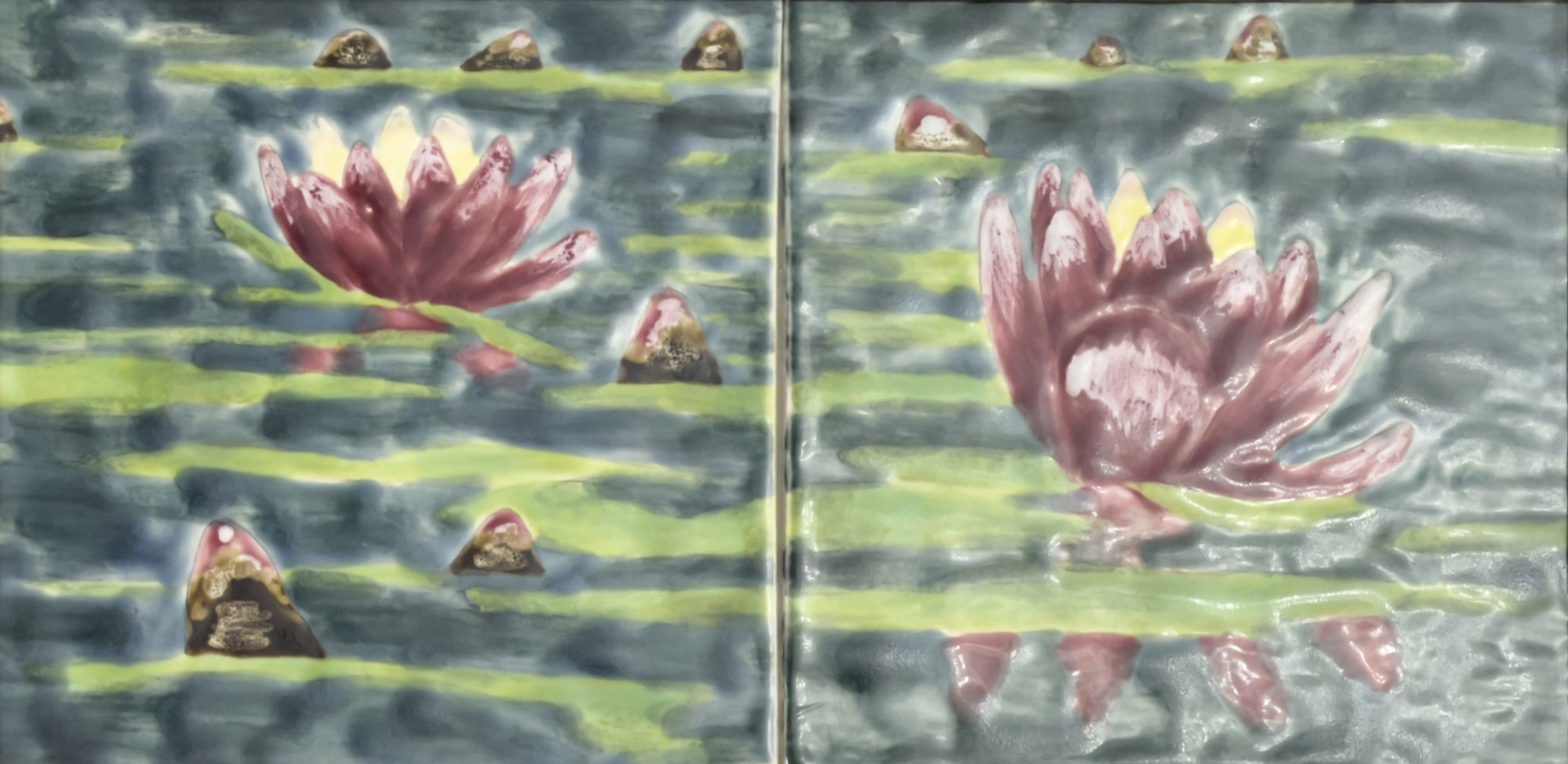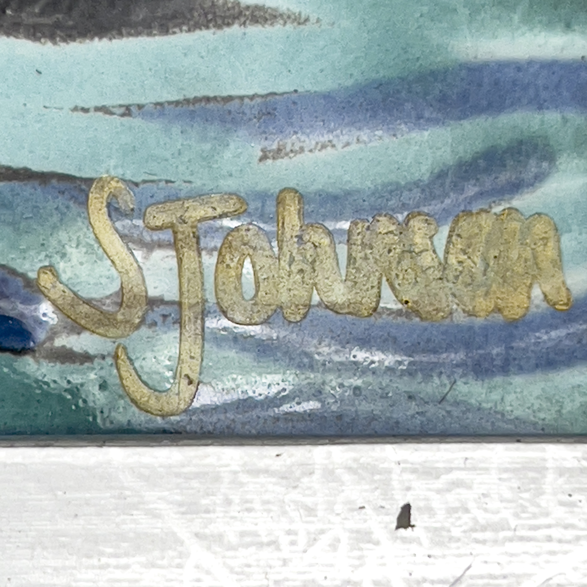 Comprising two tiles by Anita Harris, featuring landscapes, one tile of a dog by Sarah Ewin, one tile of a sailboat signed S. Johnson, and one tile featuring water lilies