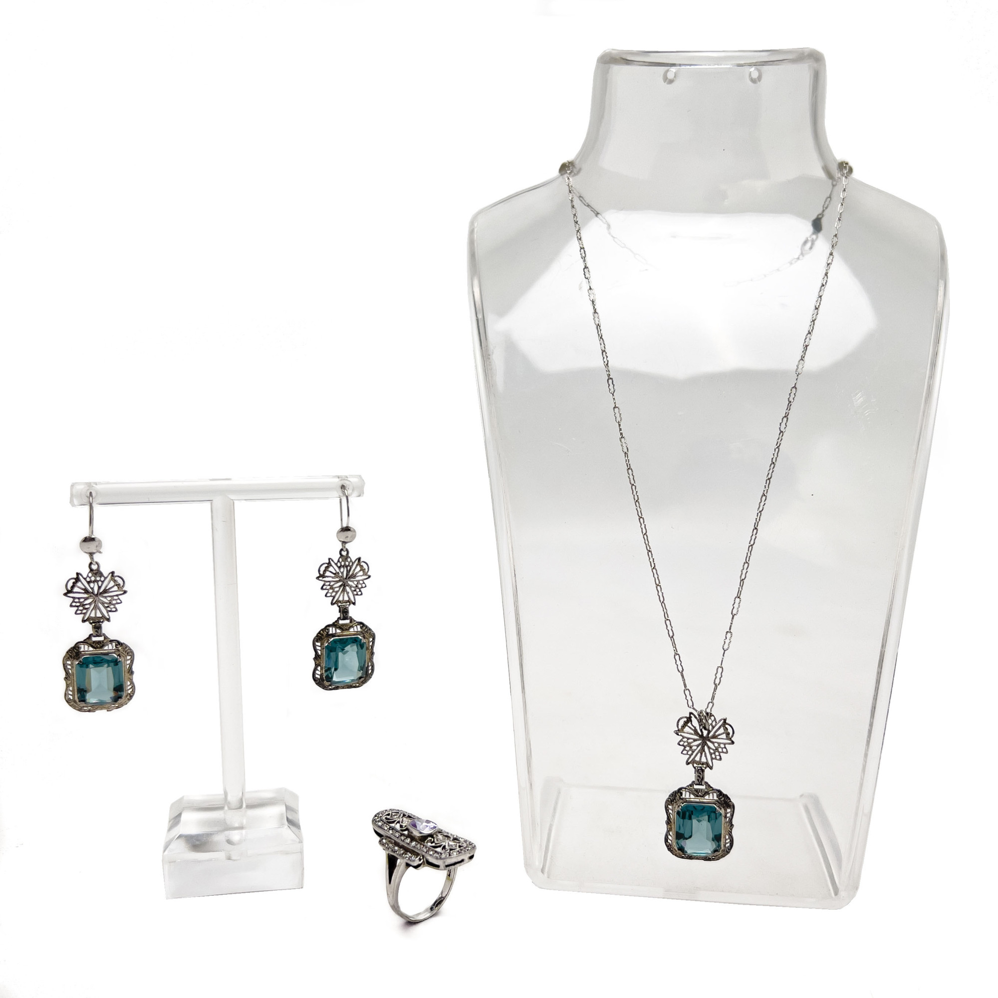Aquamarine Earrings and Necklace Set and Amethyst Ring, Set in Silver
