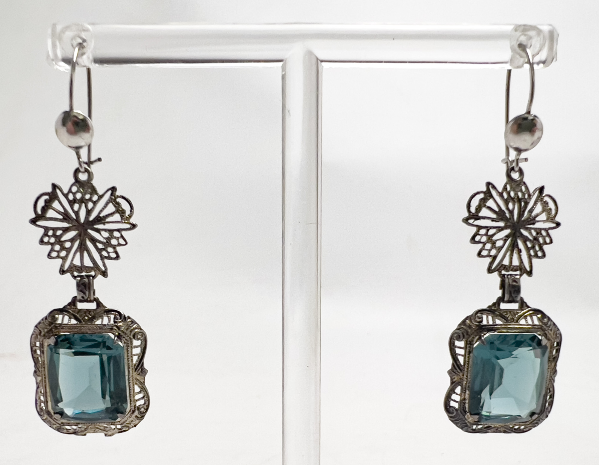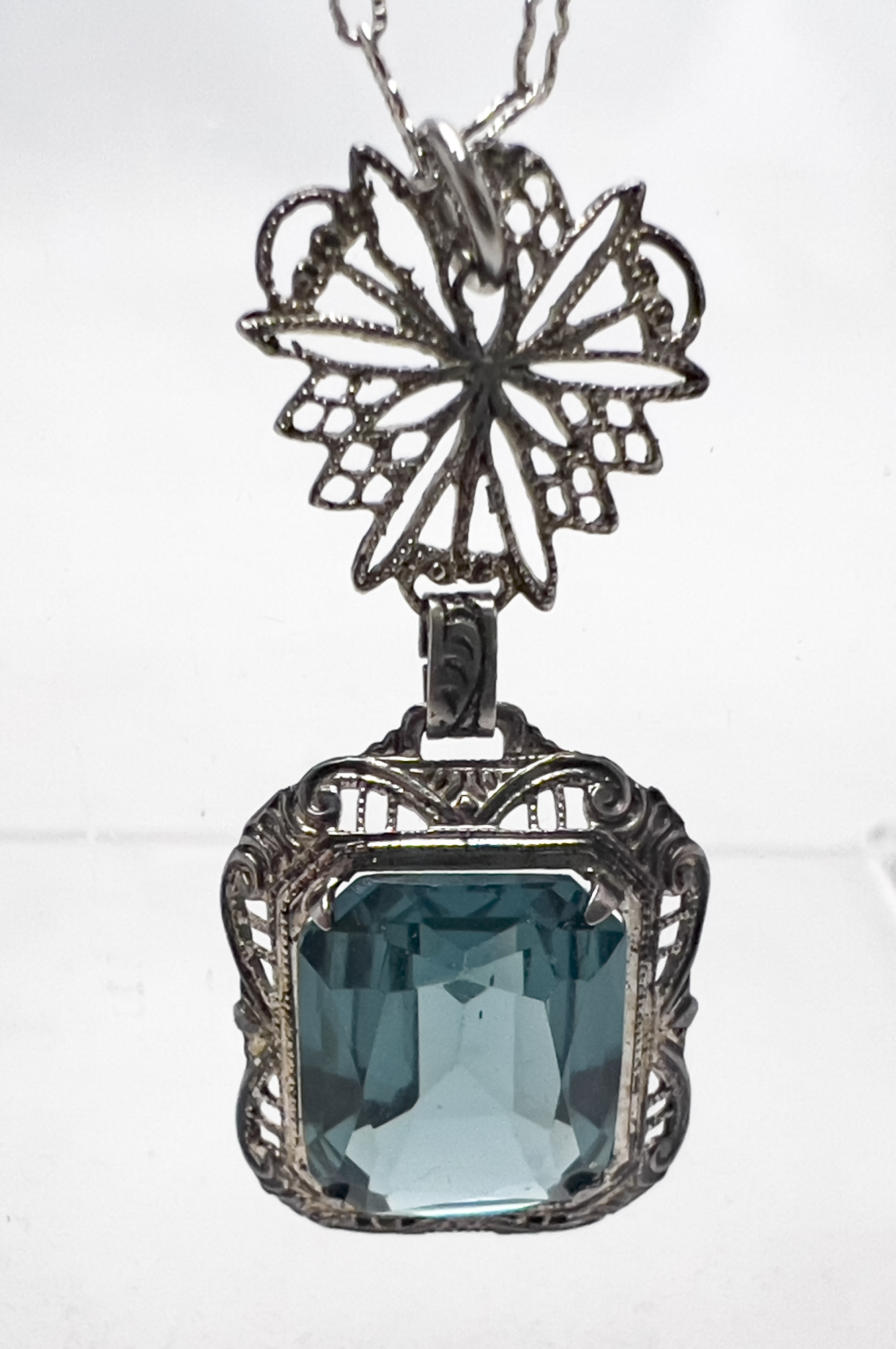 Comprising aquamarine earrings and necklace set in silver, earrings with posts stamped for 14K white gold, pendant on sterling silver chain