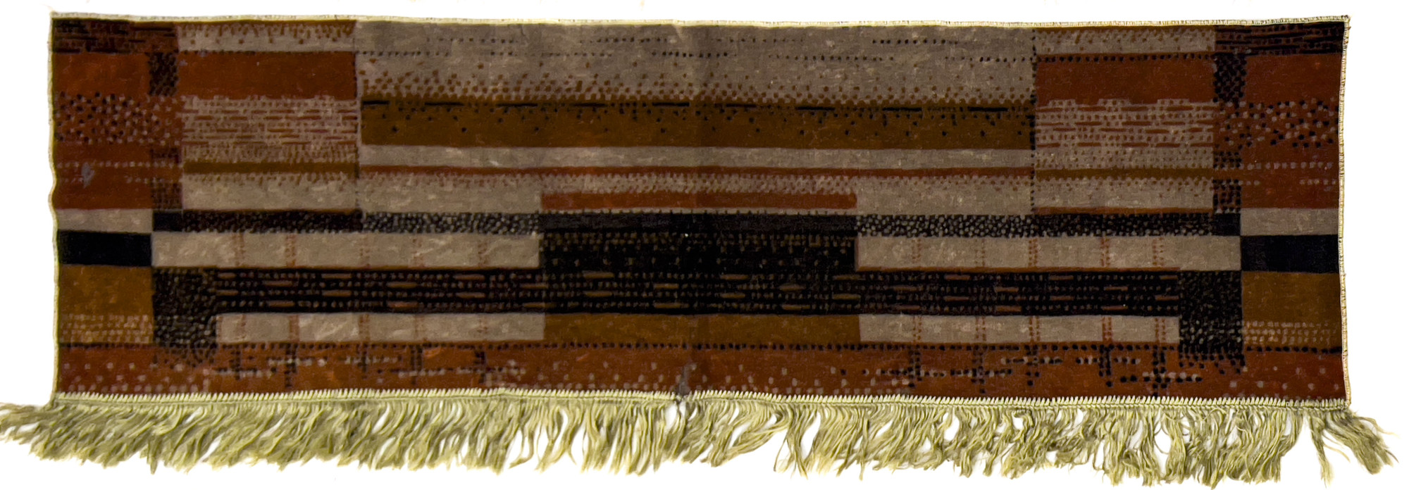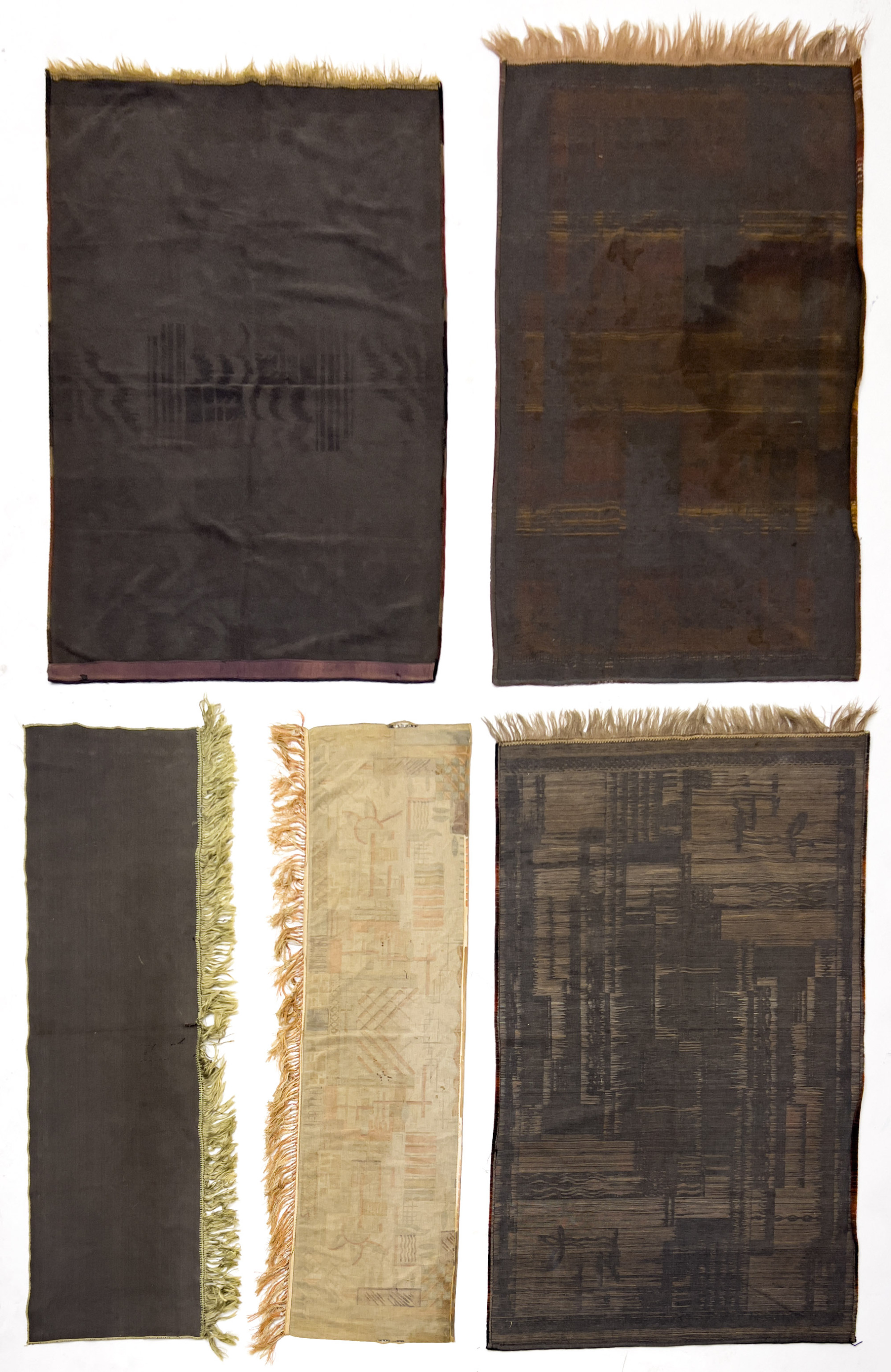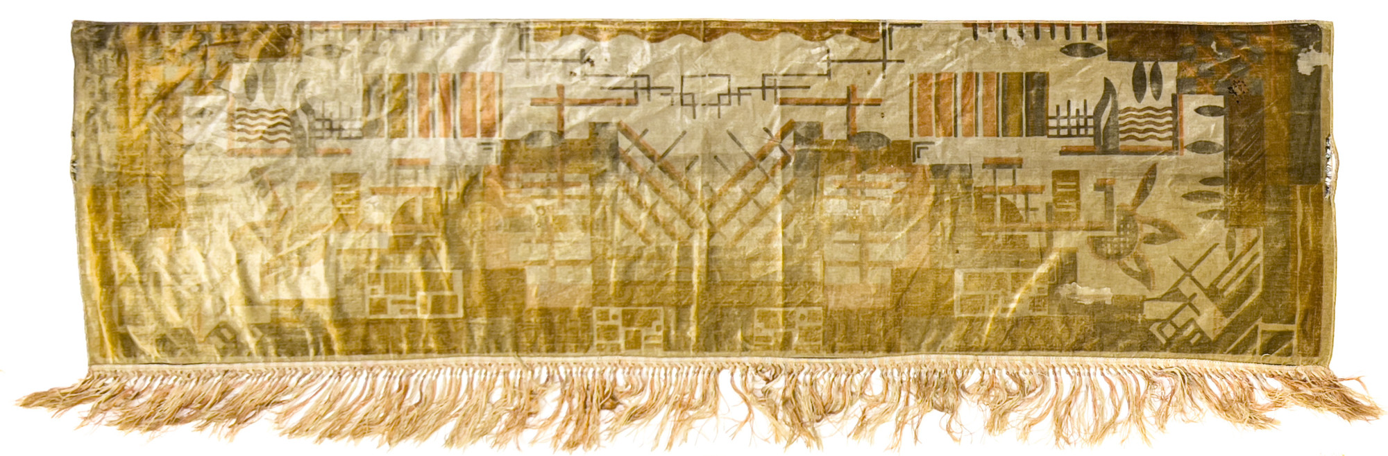 Comprising 5 art deco fabric pieces, one fitted as a curtain, all with fringe attached to one end, one mohair