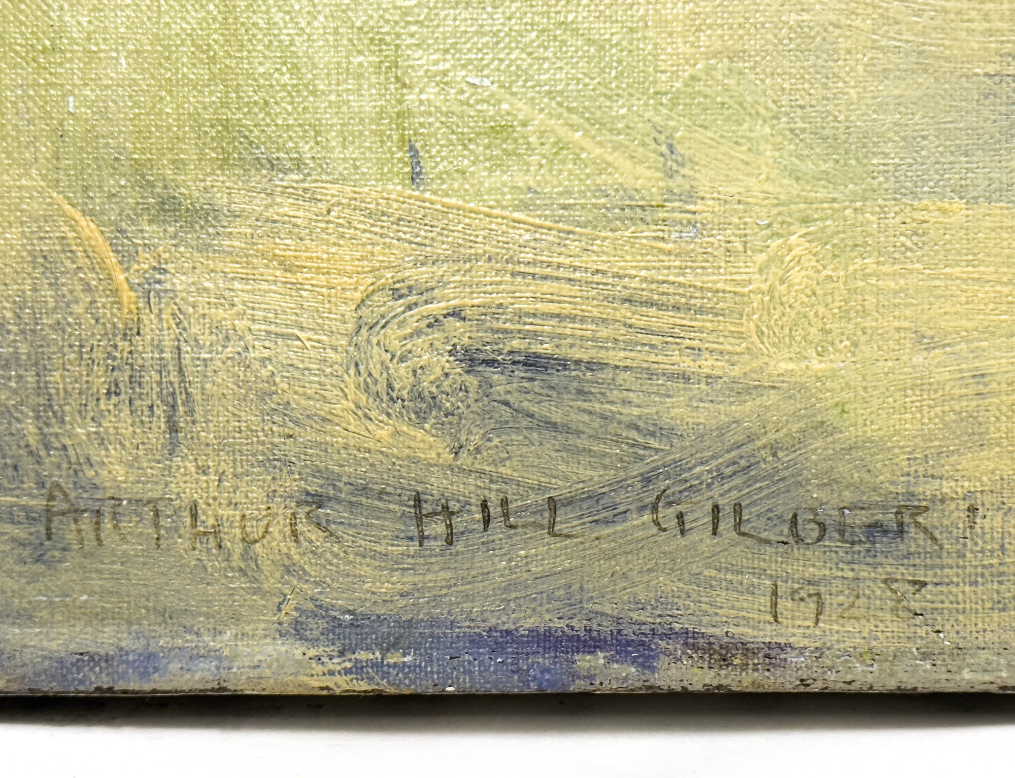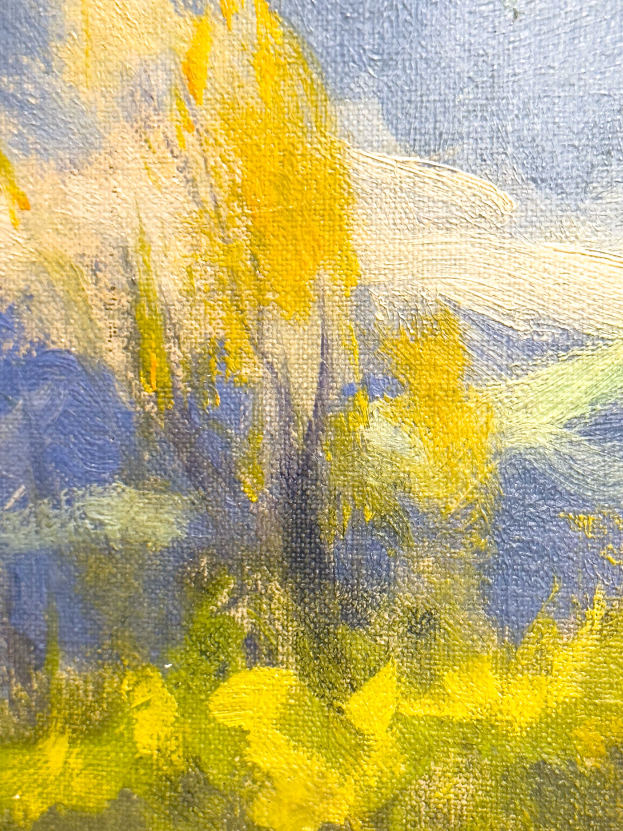 overall good condition, canvas is lined, some craquelure in the thicker paint, some inpainting in the sky