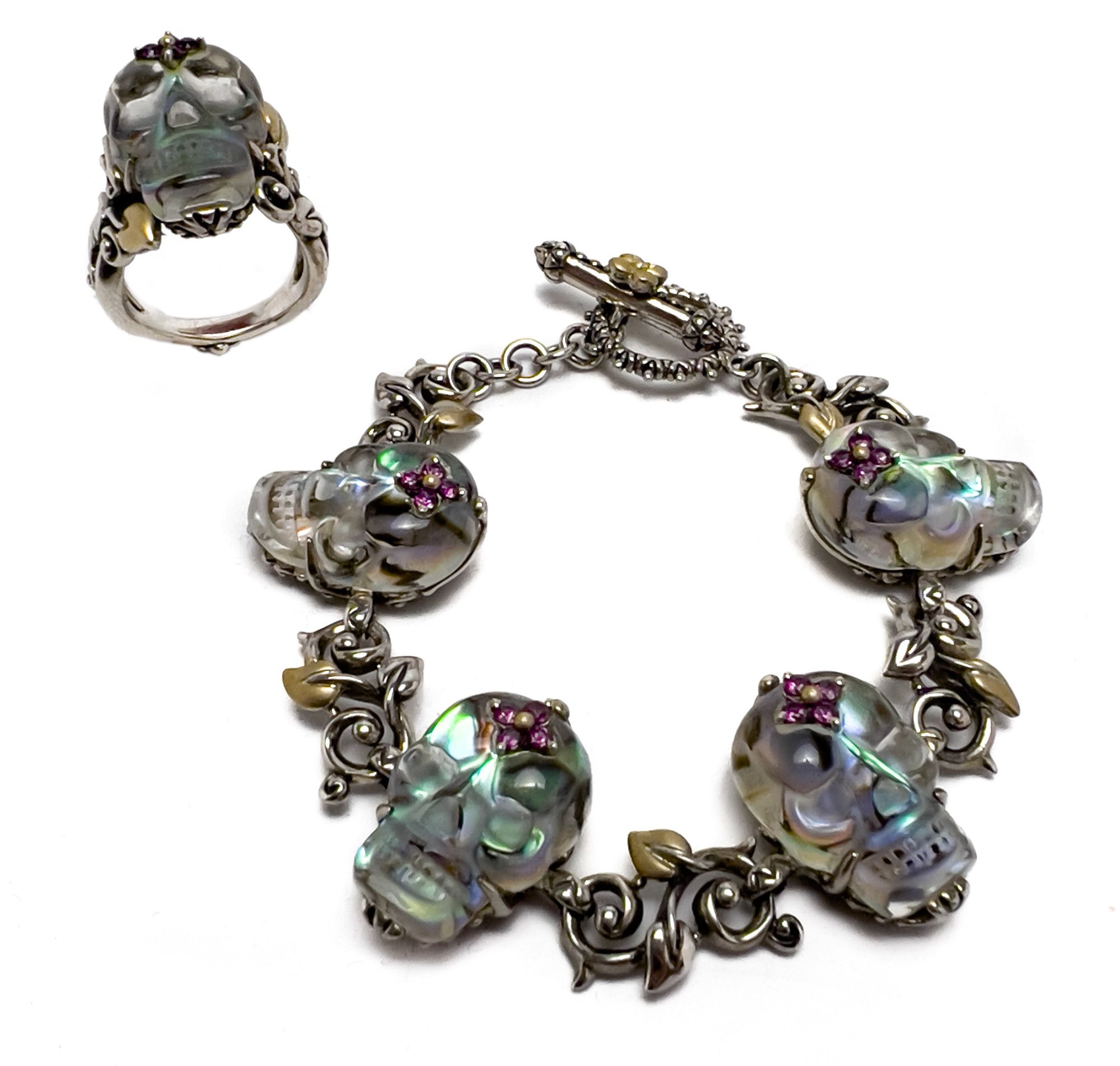 Sterling and 18K Gold Abalone Skull Ring and Bracelet