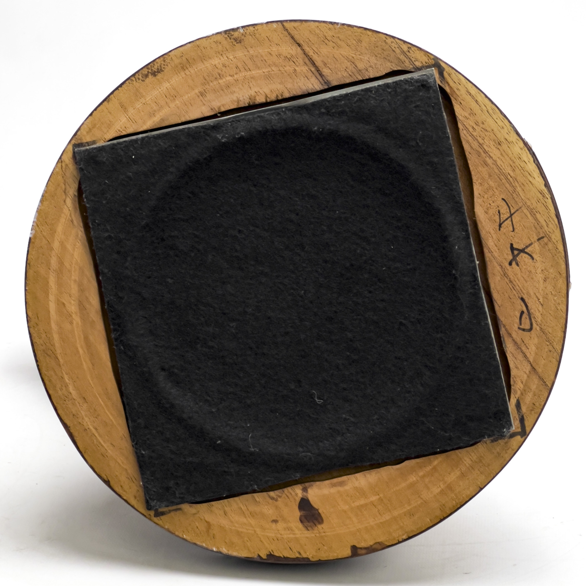 Bronze sculpture with applied patina, on circular stone and wood swivel base