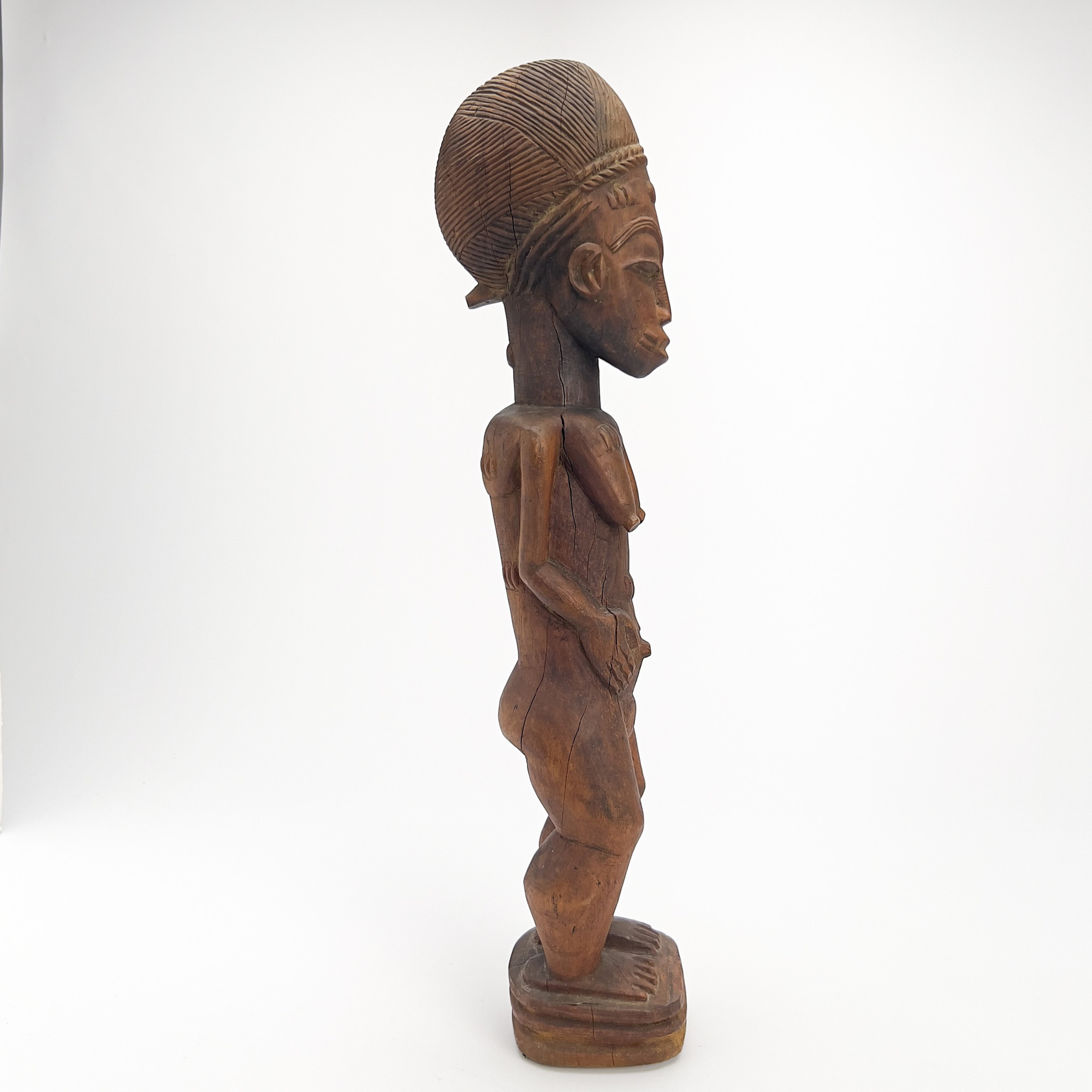 overall good condition, with areas of wood splitting, and two velcro strips adhered to bottom of base