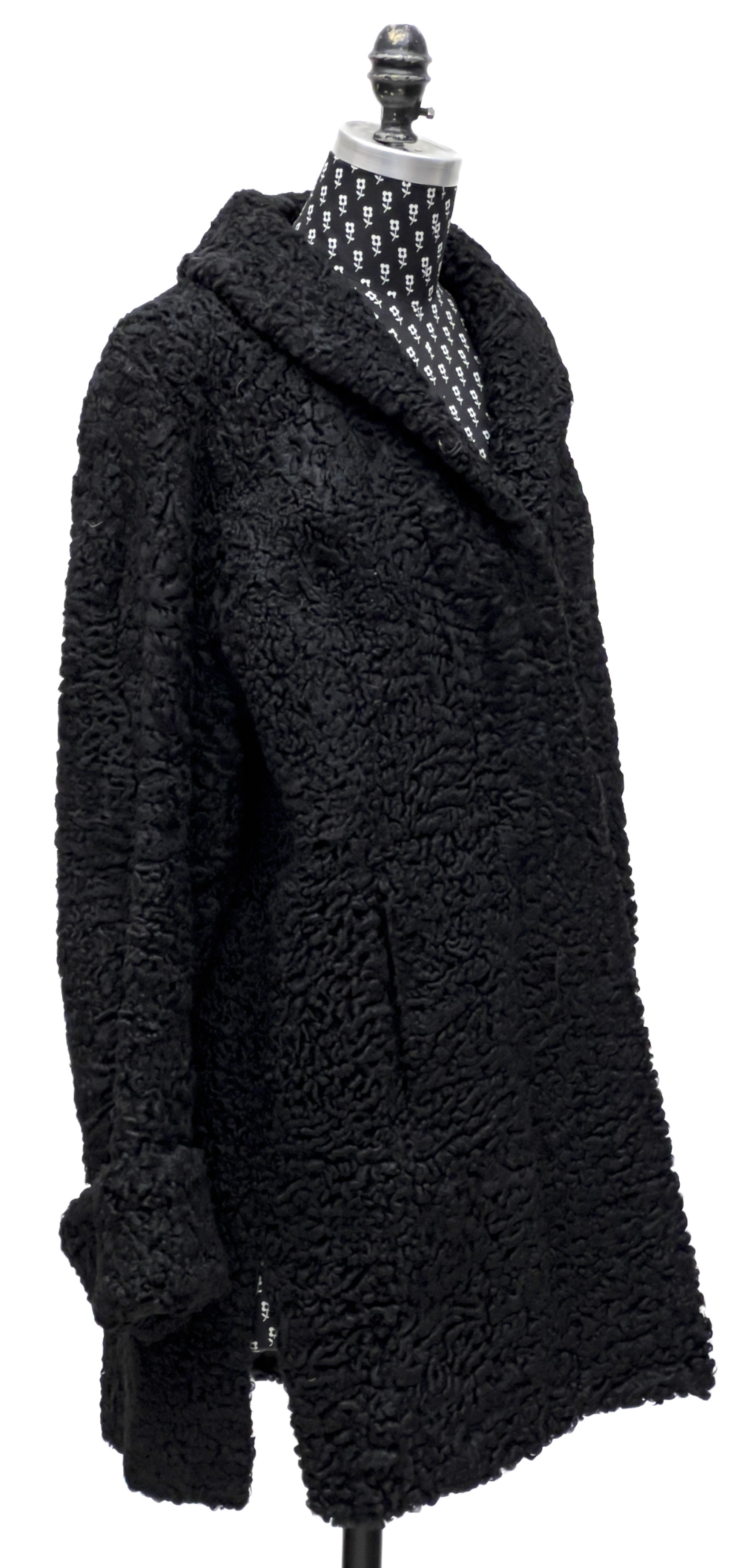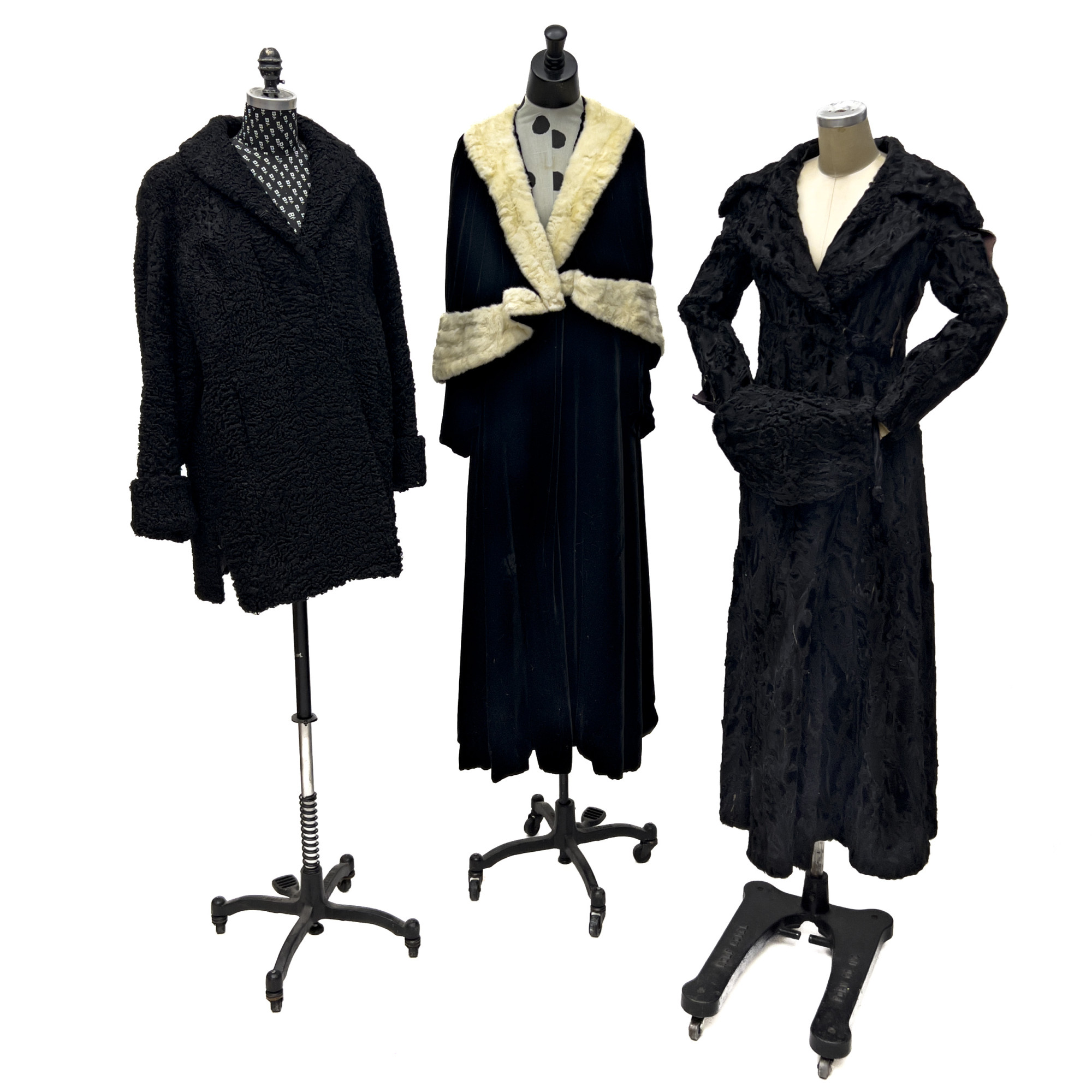 Comprising a long velvet coat with fur trim, long black fur coat with muff, and black fur coat with silk lining