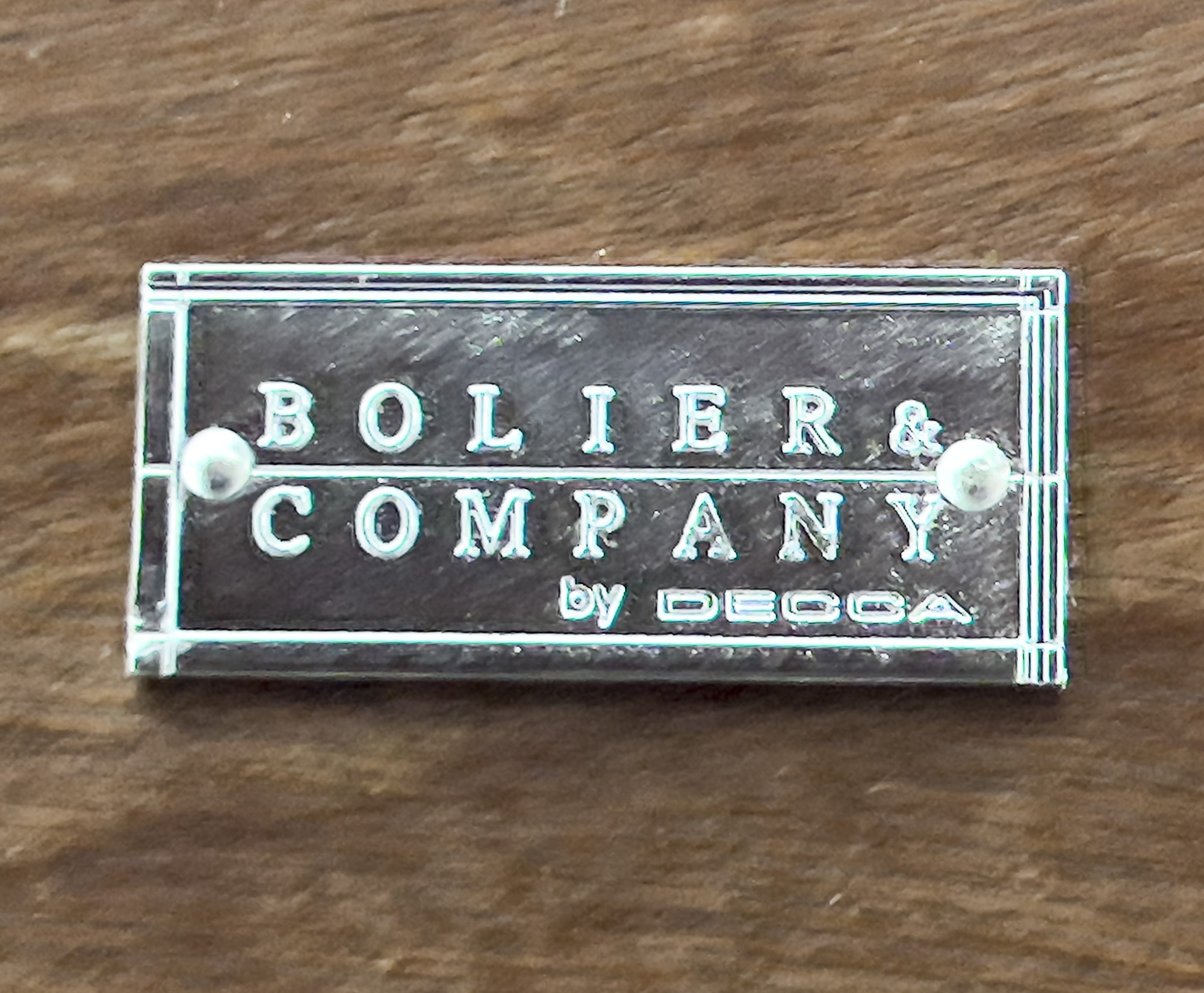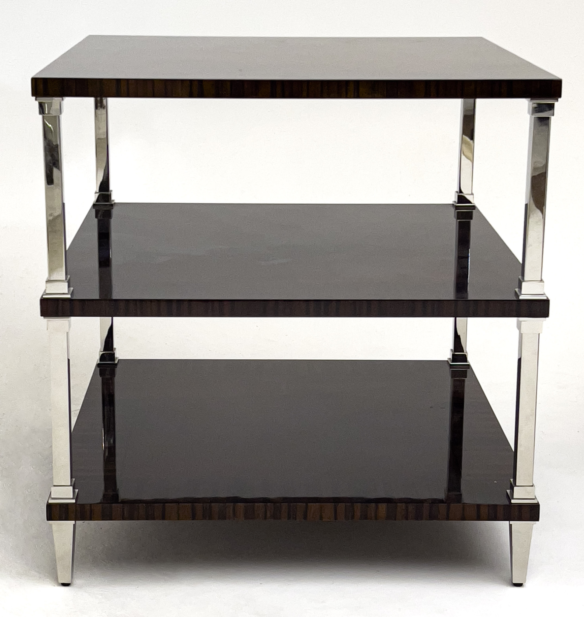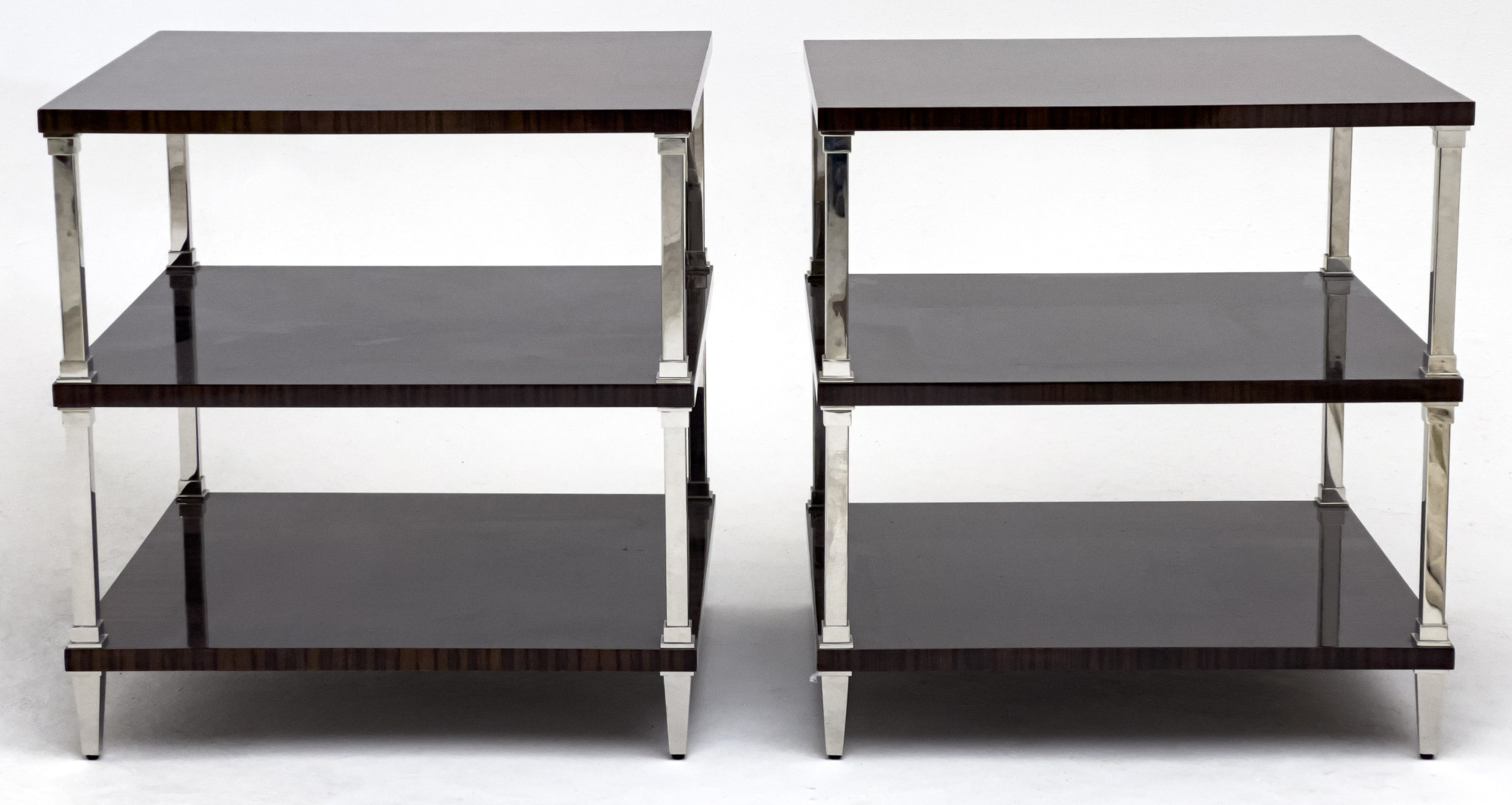 Pair of tiered tables by Bolier and Company for Decca Home Furniture, each having swirl mahogany tops with macassar ebony border, polished stainless steel posts