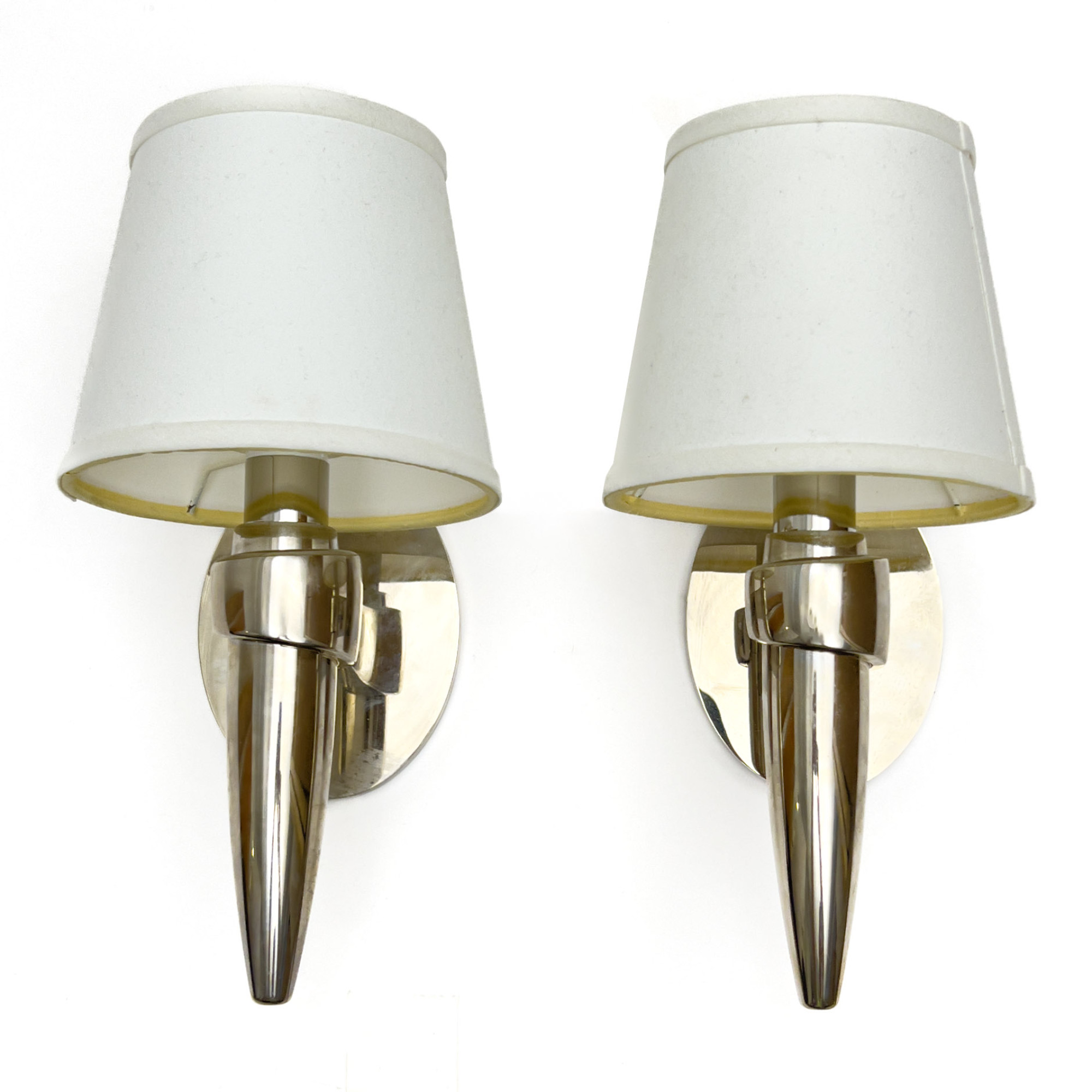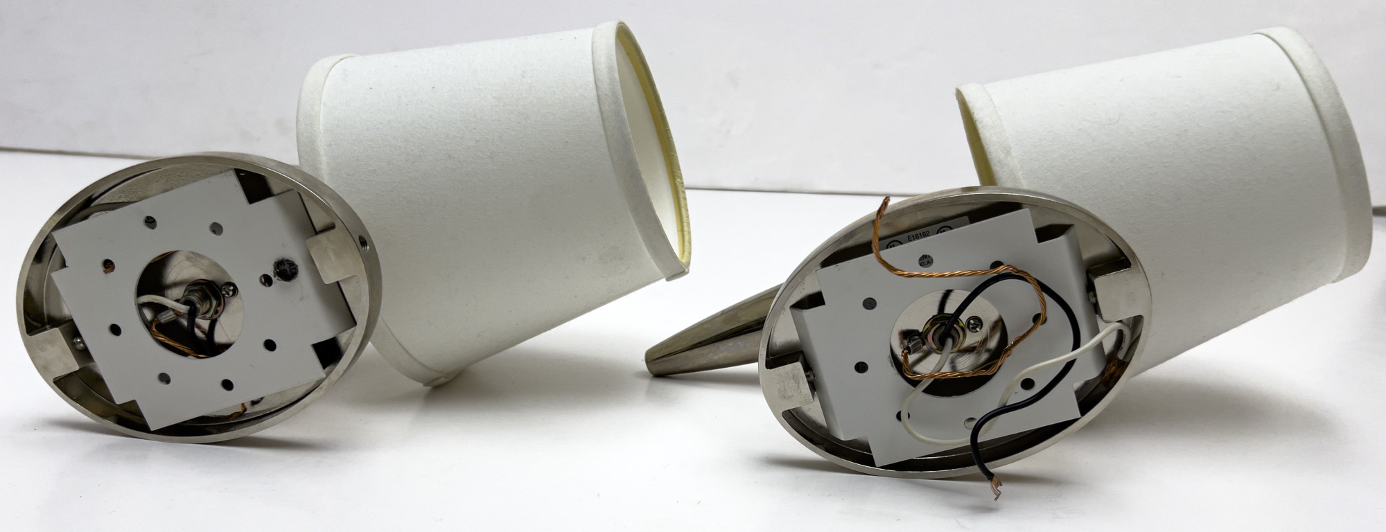 Two steel wall sconces with linen lampshades