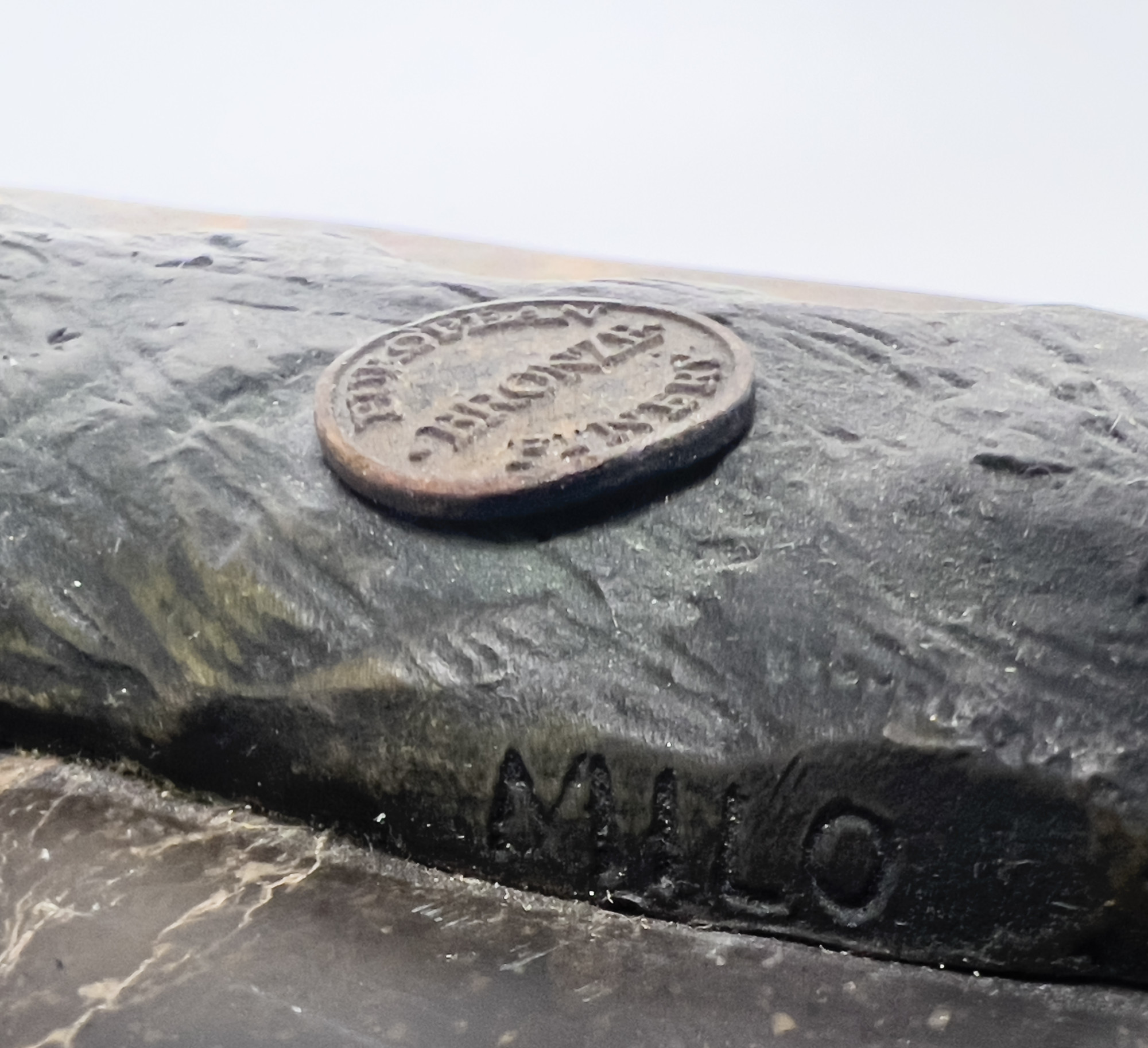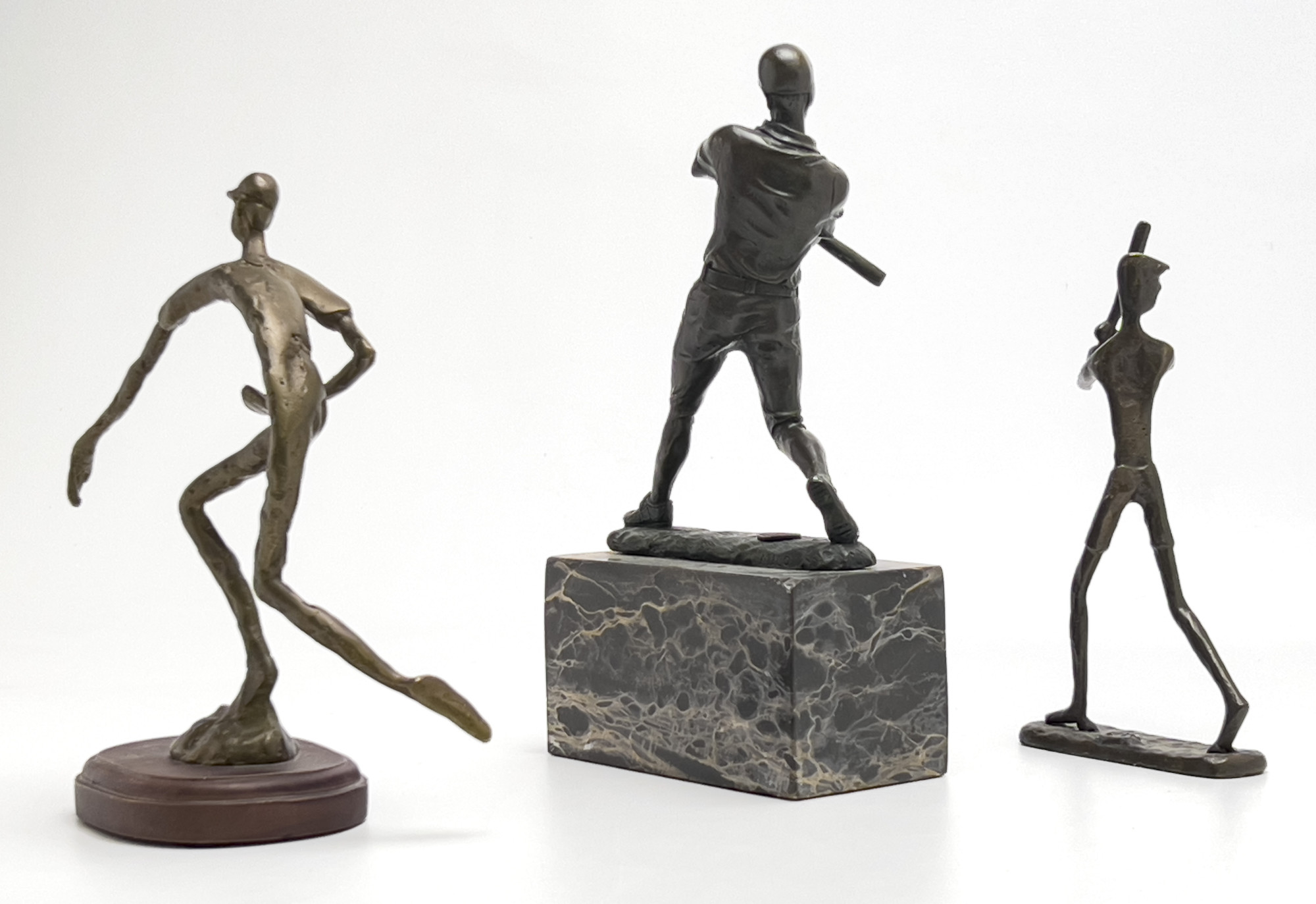 comprised of one bronze baseball player by Milo resting on granite base and two bronze baseball players by an unknown artist