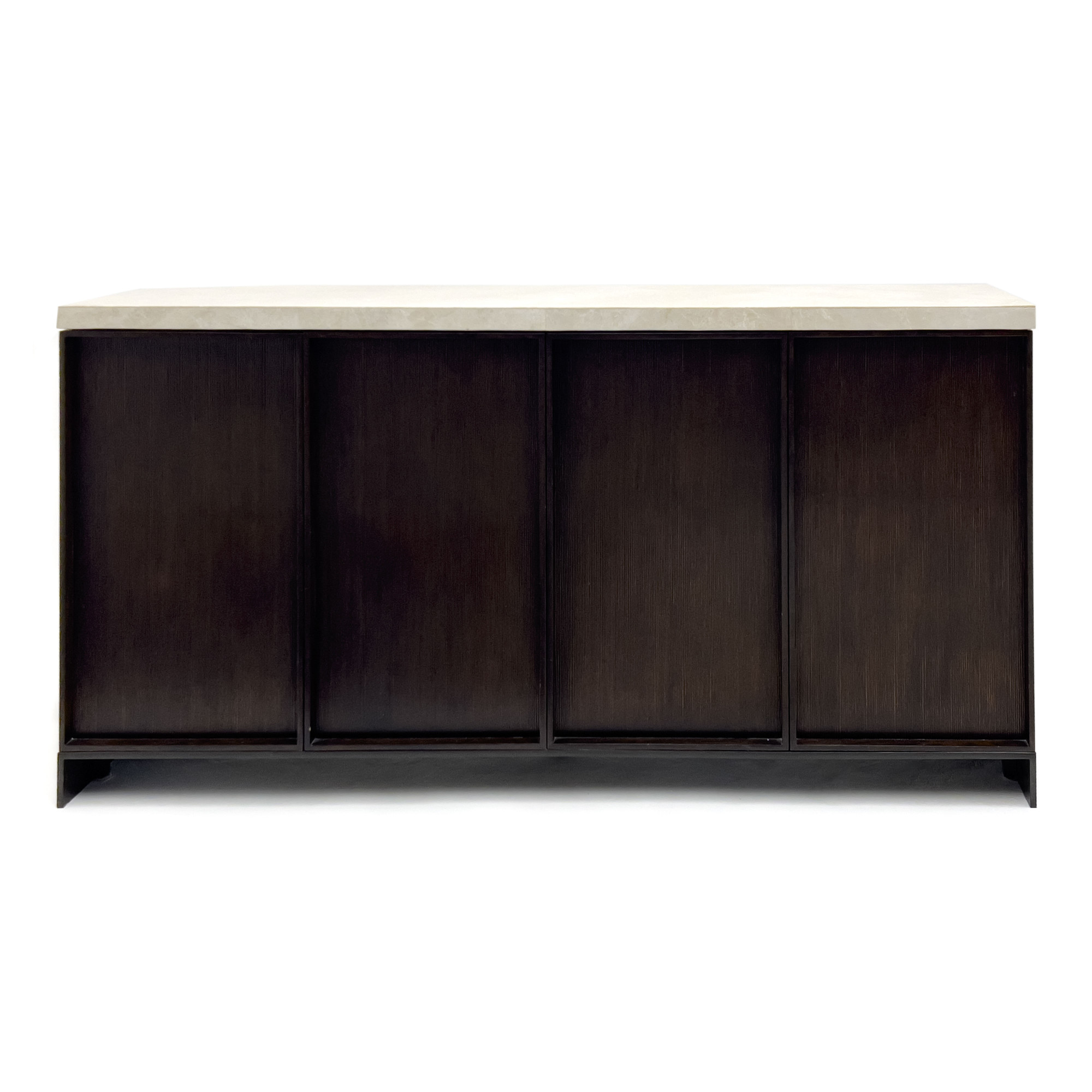 Four door stone top dining credenza, two door opening onto two interior shelves, each center door pulls out to reveal large storage space