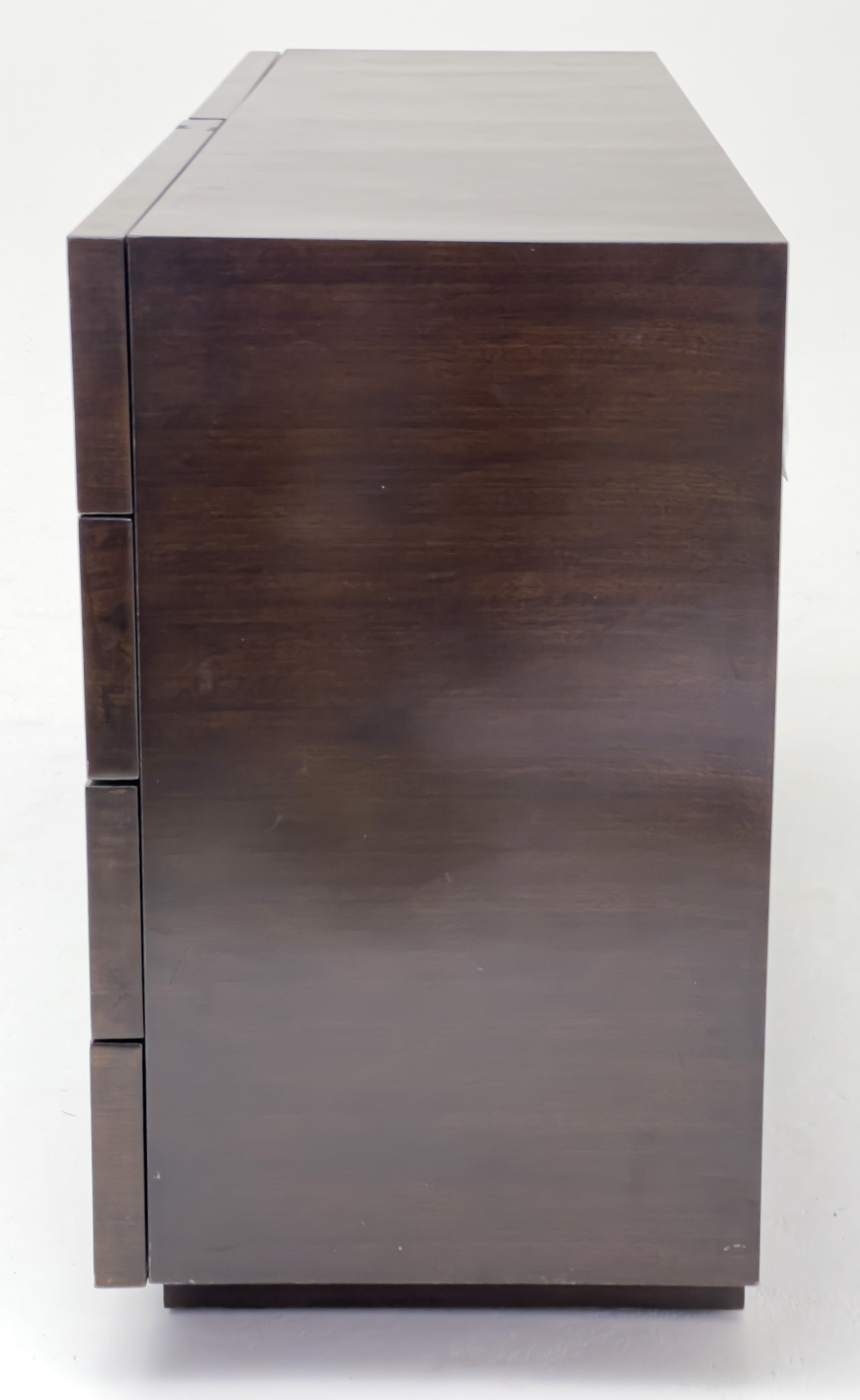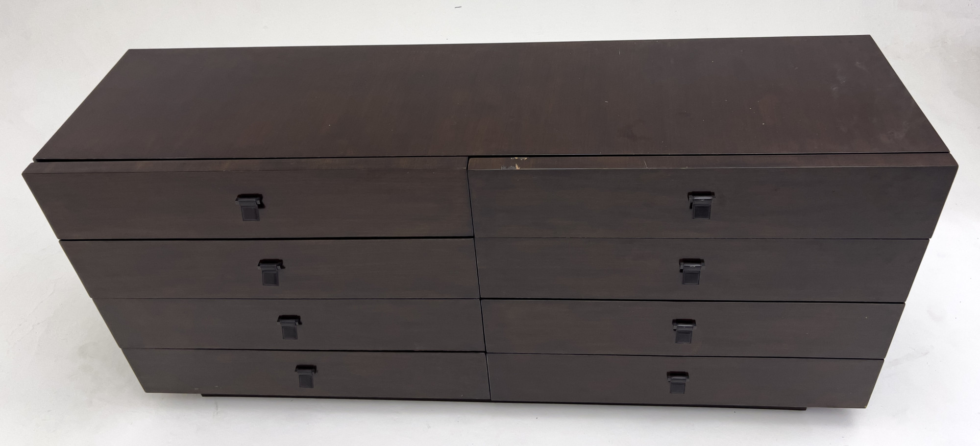 Mahogany veneer eight drawer dresser, each with leather pull, raised on pedestal base
