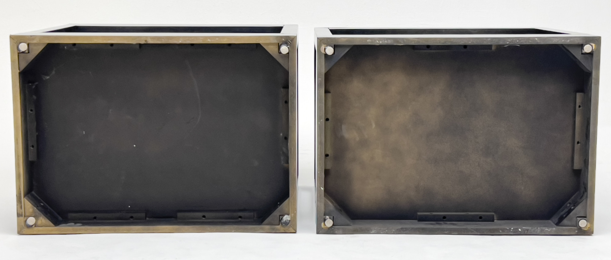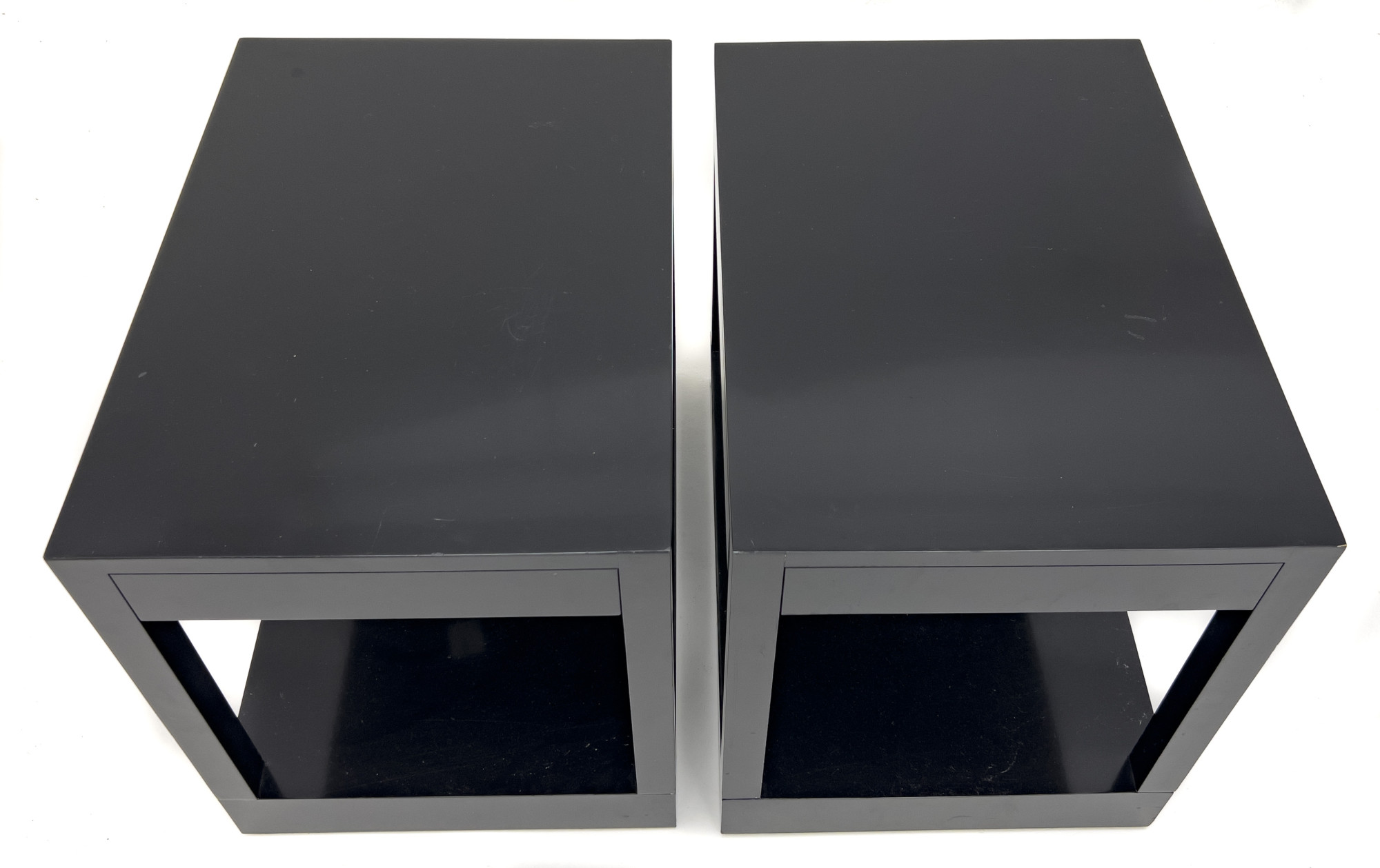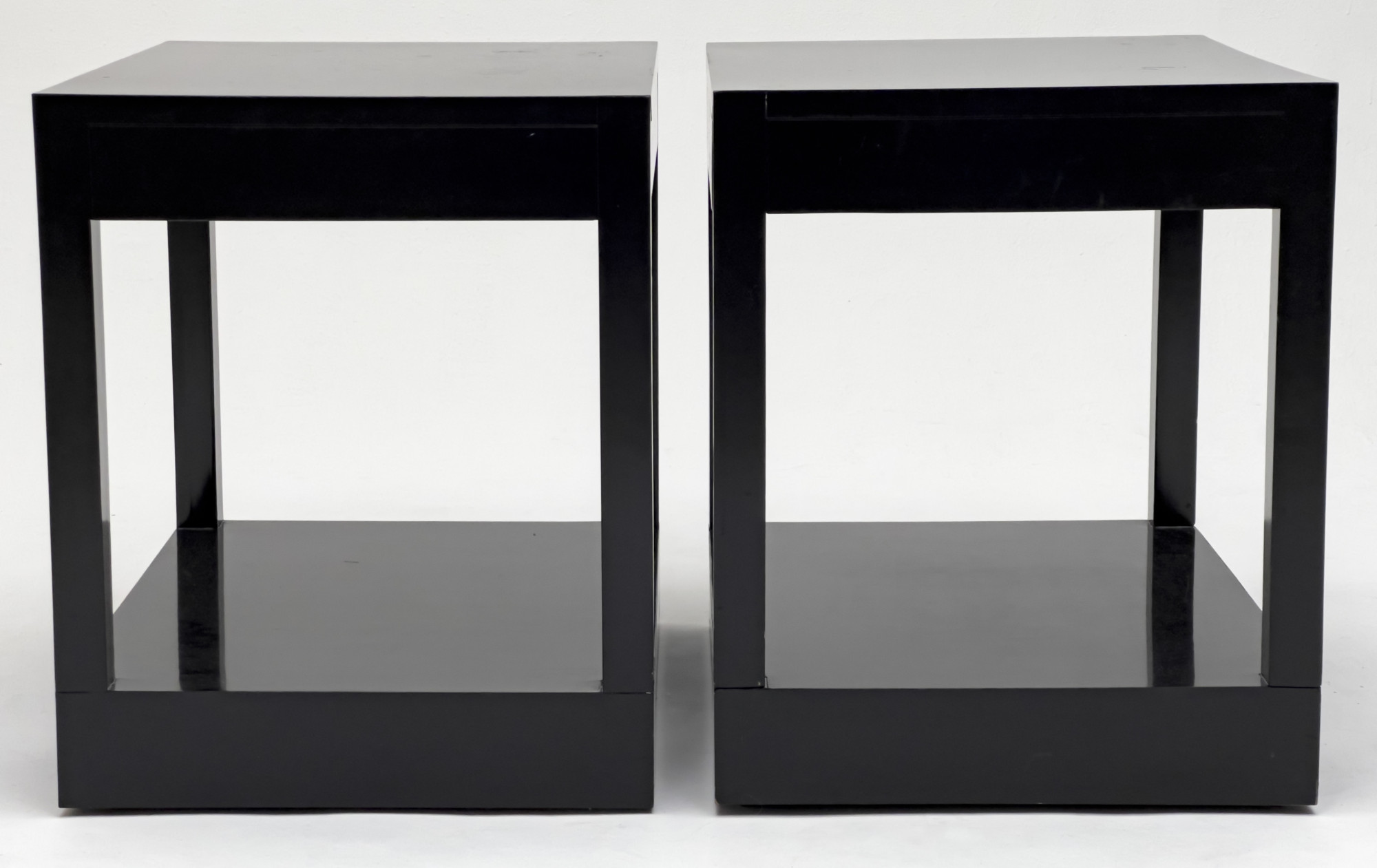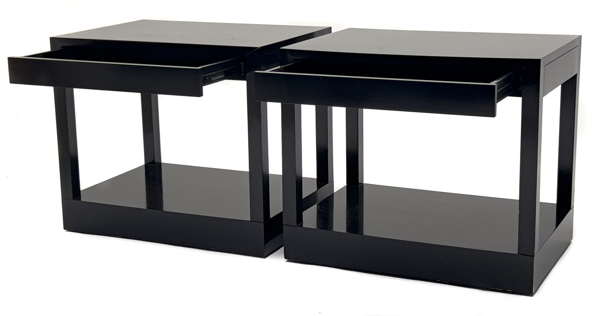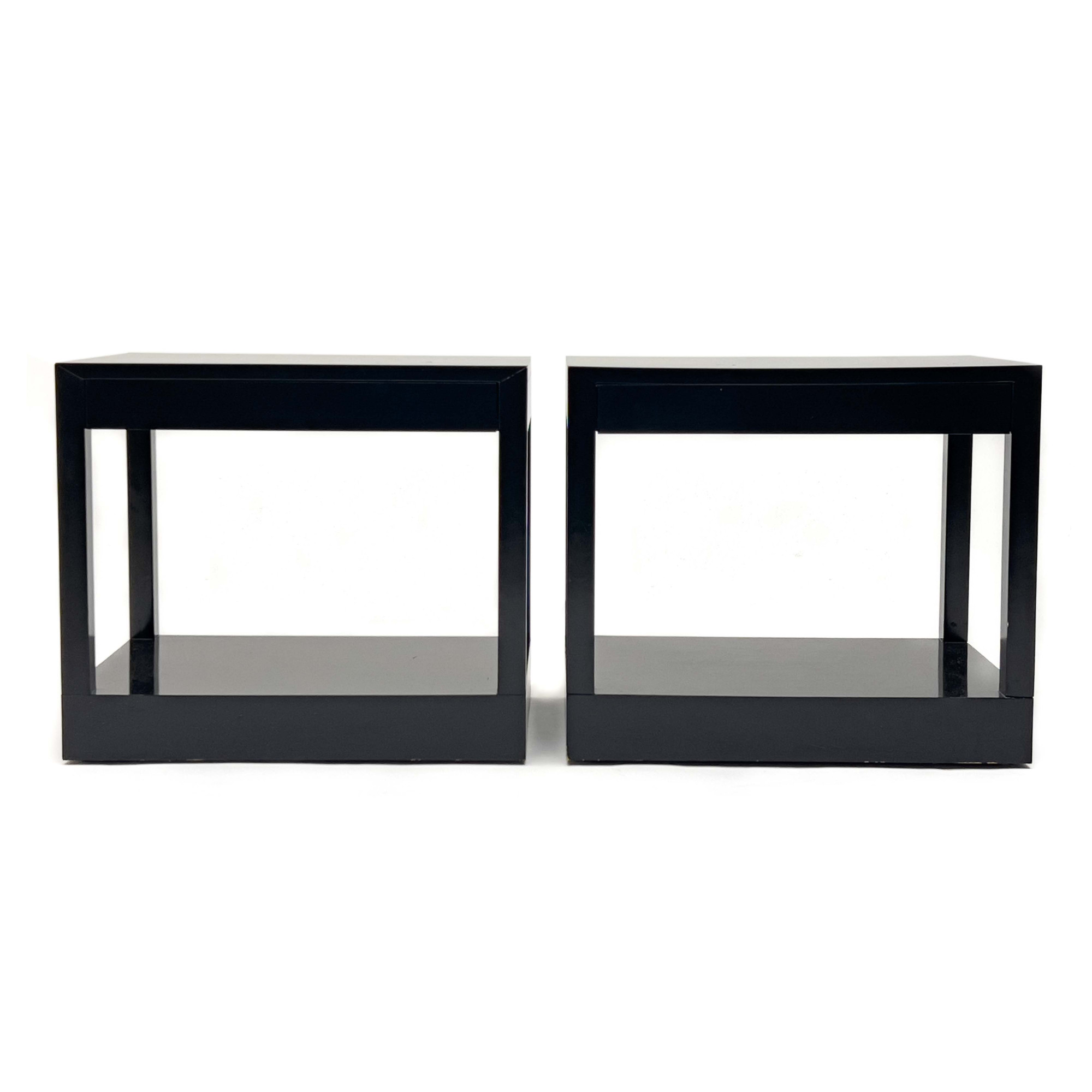 Pair of black lacquer bed side tables, each fitted with single slim drawer