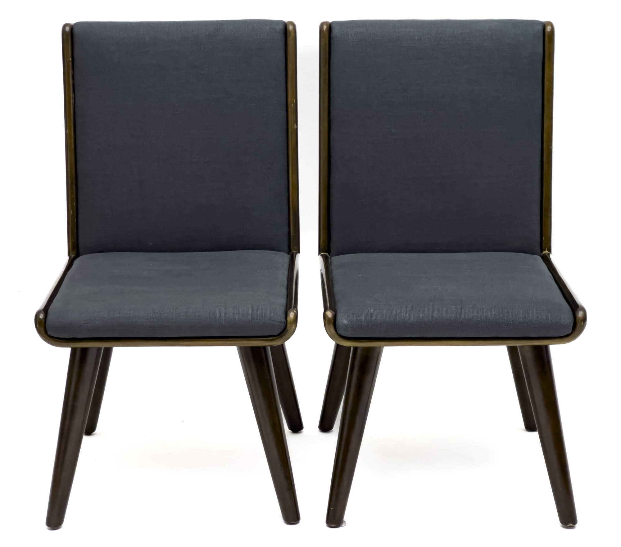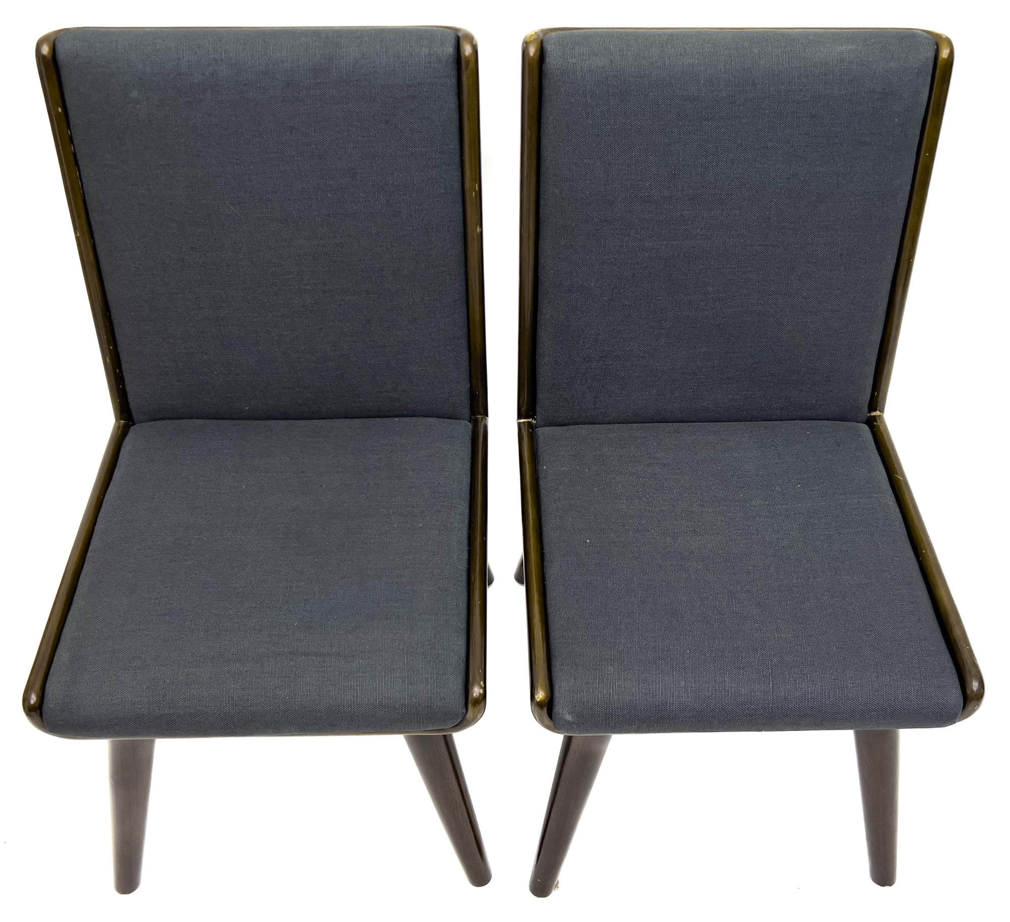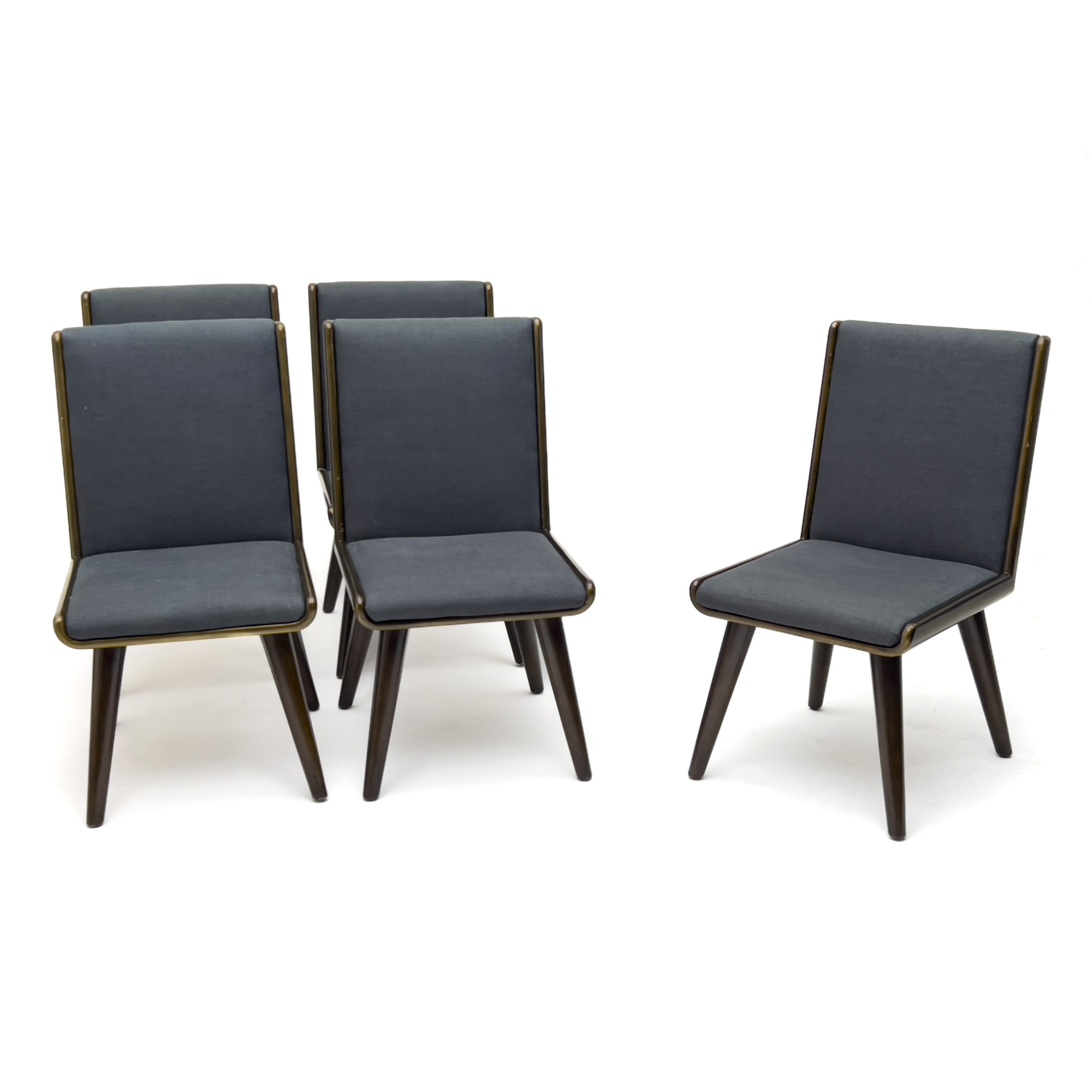 Group of five chairs each with upholstered seat and back raised on four splayed and tapered legs