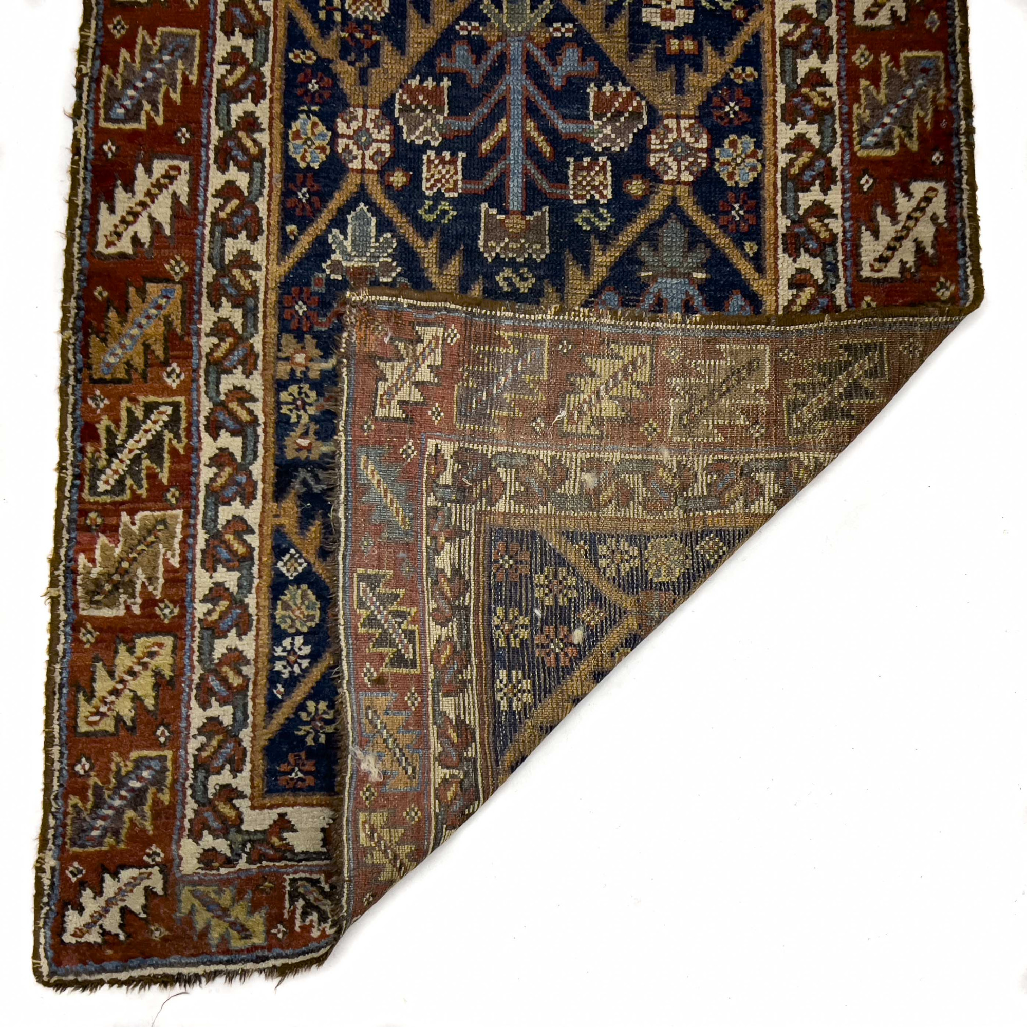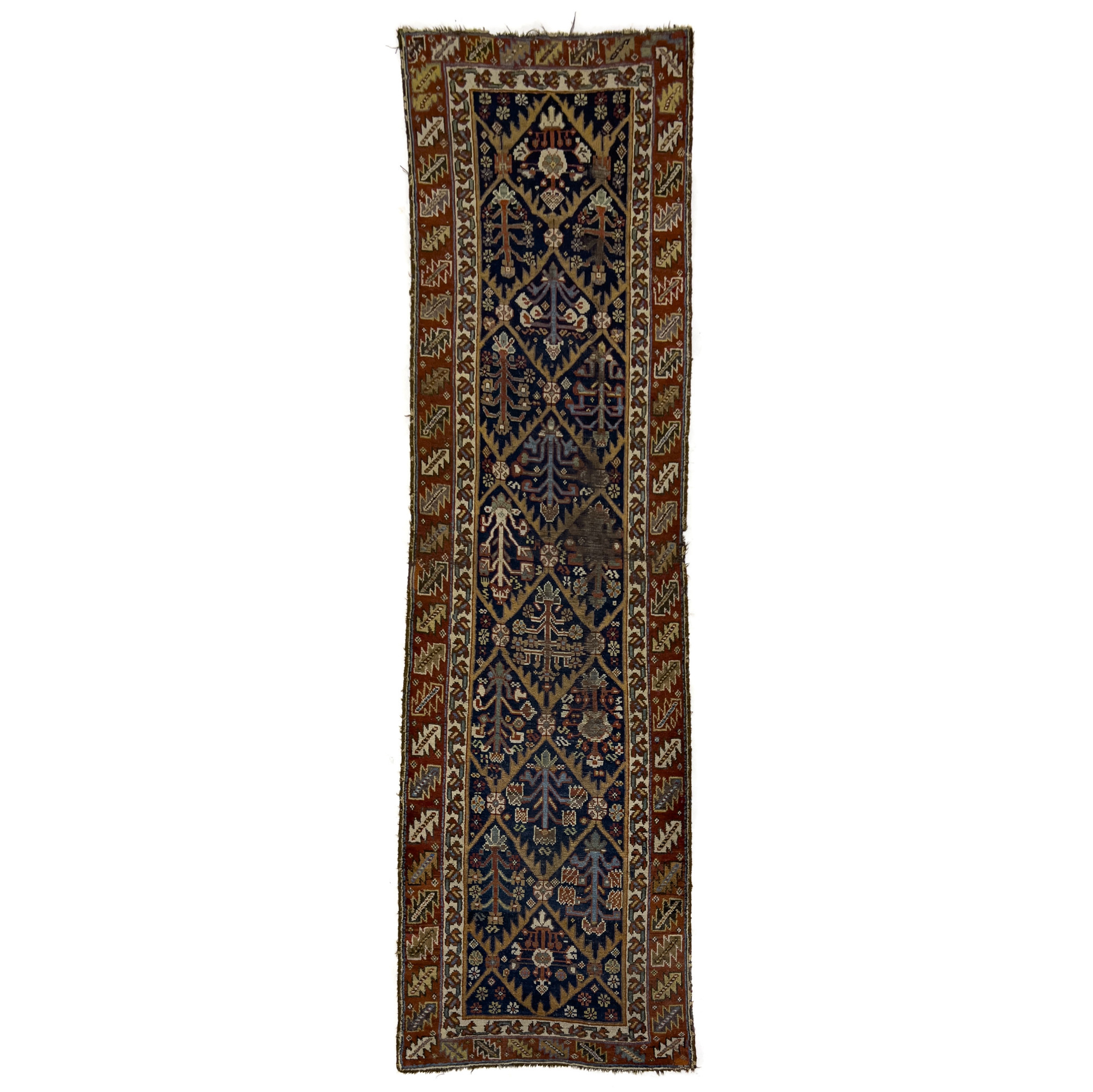 Hand knotted Caucasian runner, with navy ground covered by flowering plants and serrated leaves, within a slant leaf primary border and ivory floral border guard