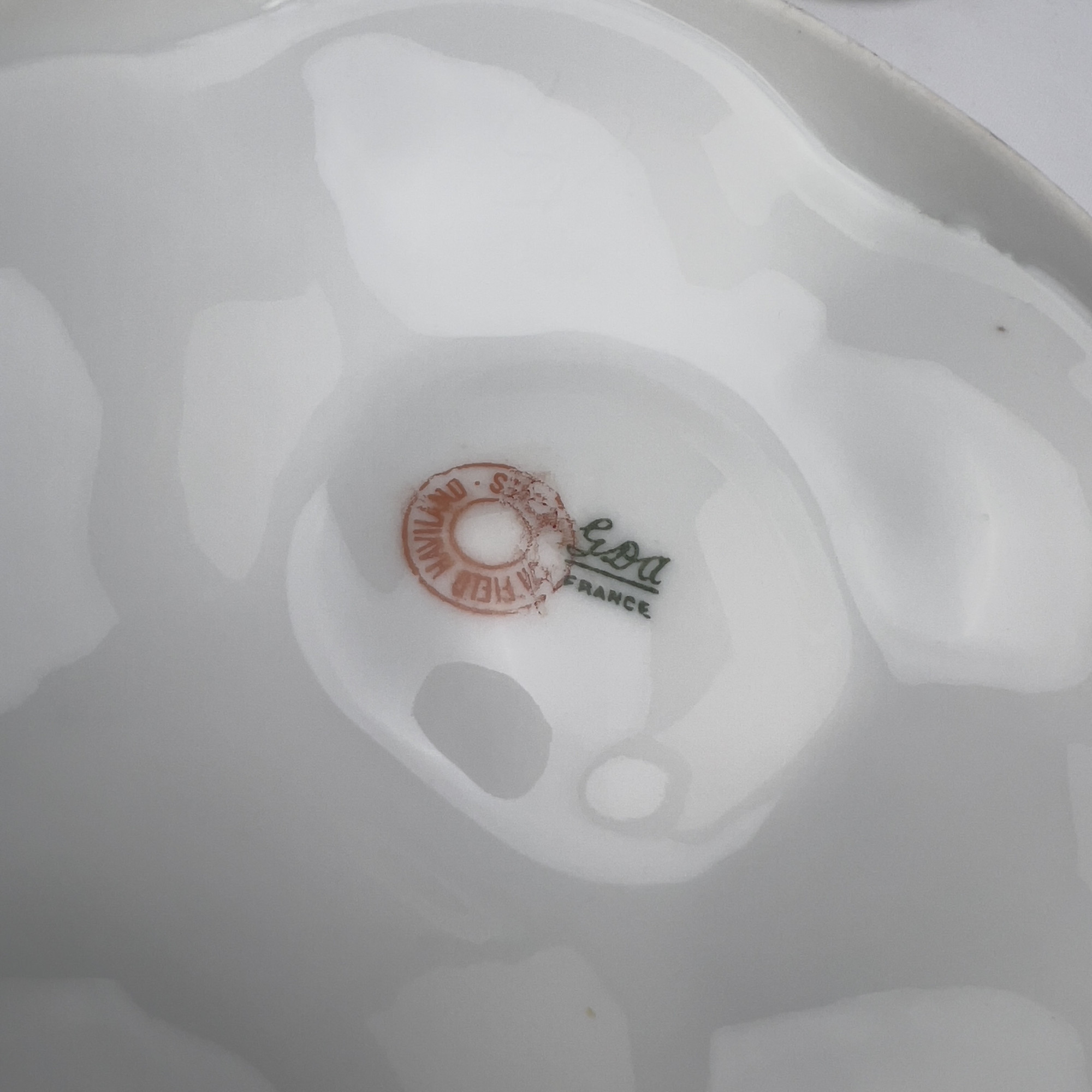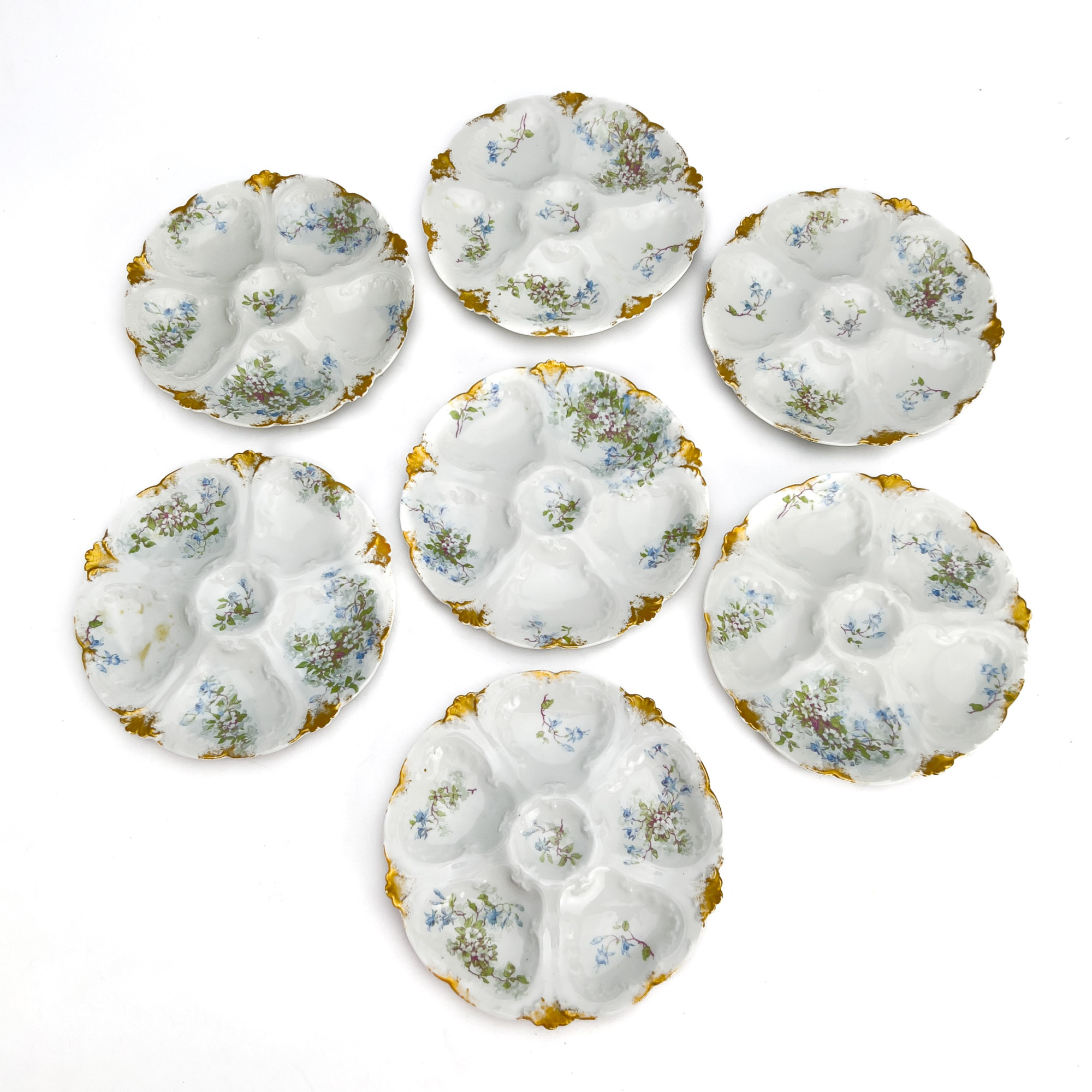 Comprising twelve porcelain oyster plates made by Charles Field Haviland, Limoges France. Features five oyster wells and a sauce well to center, decorated with blue and green floral elements and brushed with gold accents