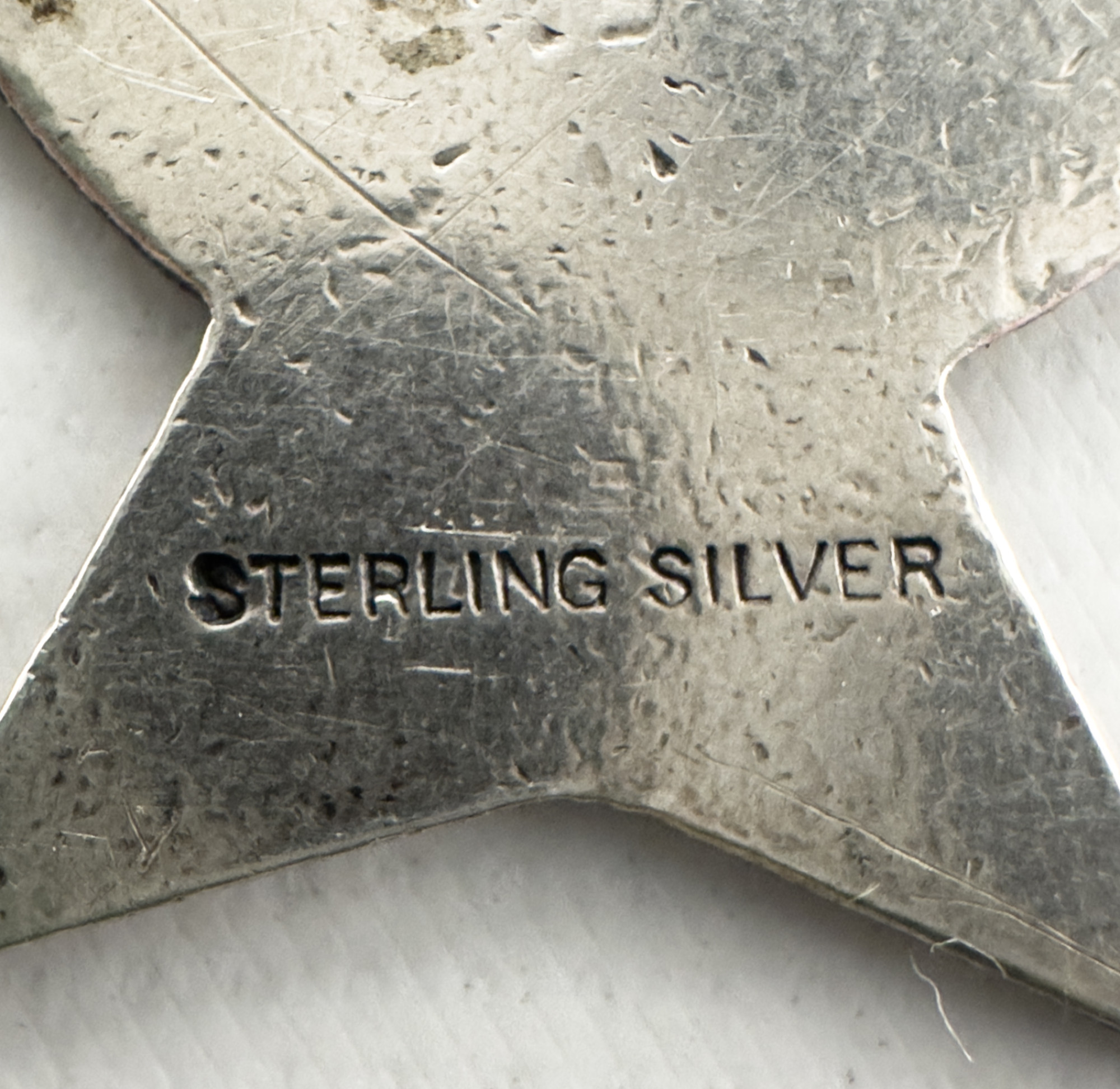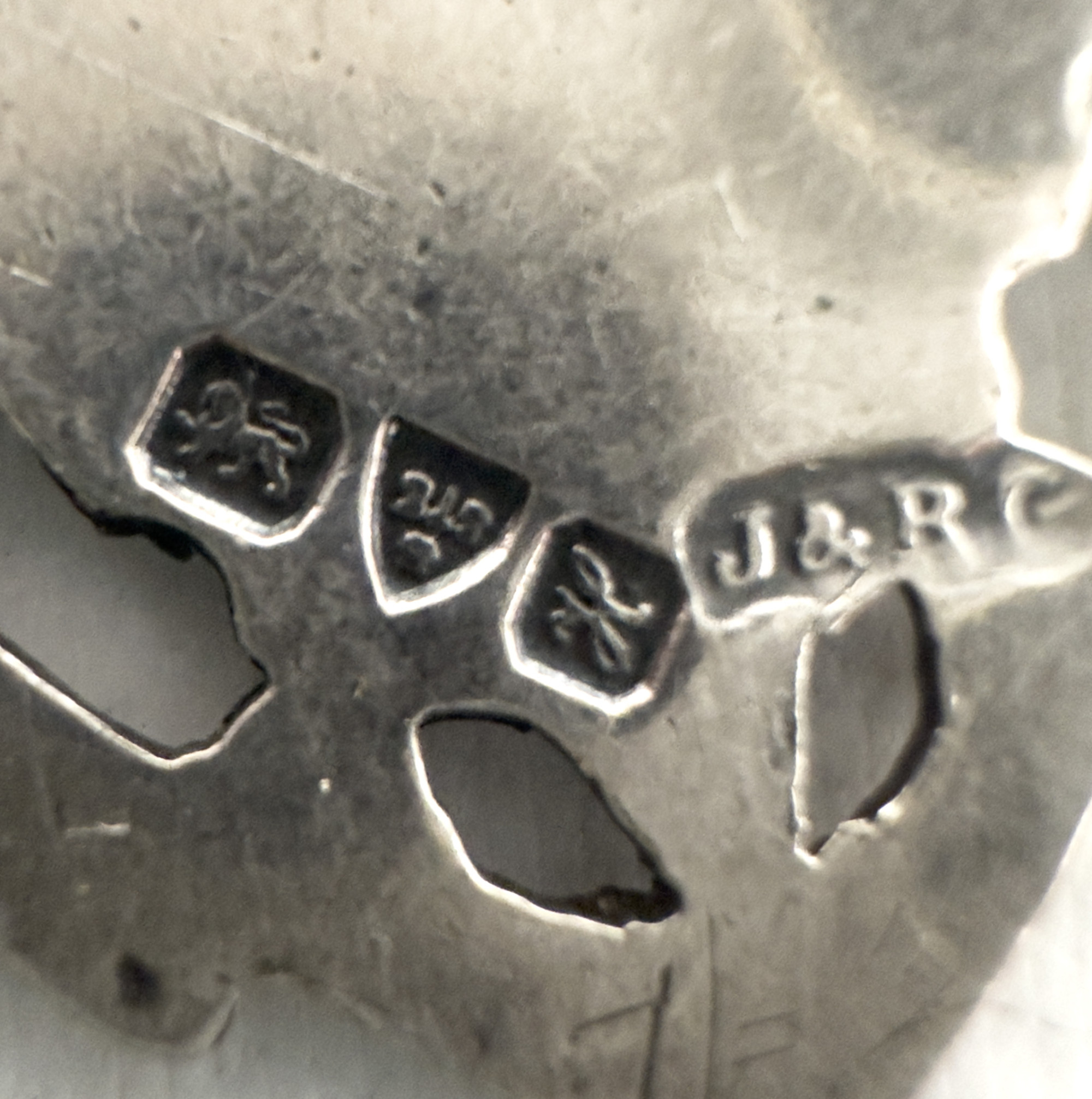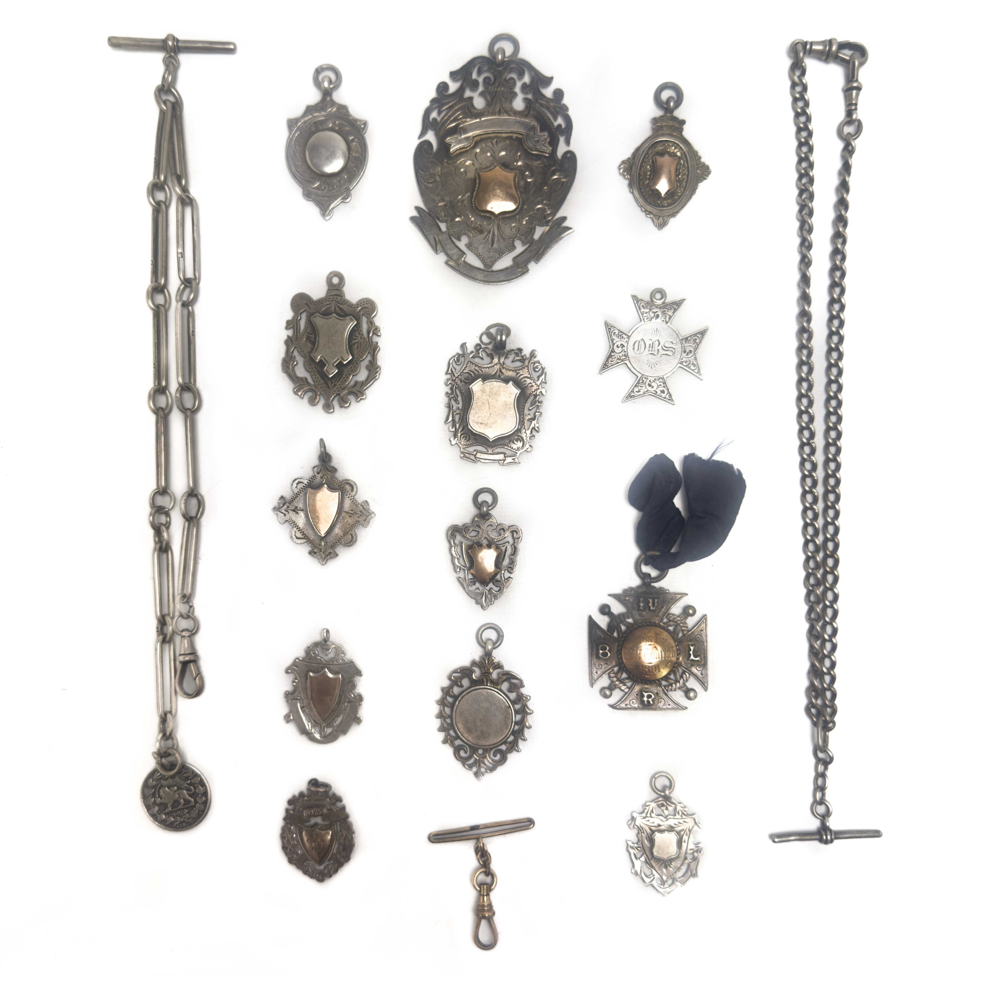 Comprising 13 sterling silver charms of various sizes, two sterling silver Albert watch chains, and gold tone metal watch chain holder