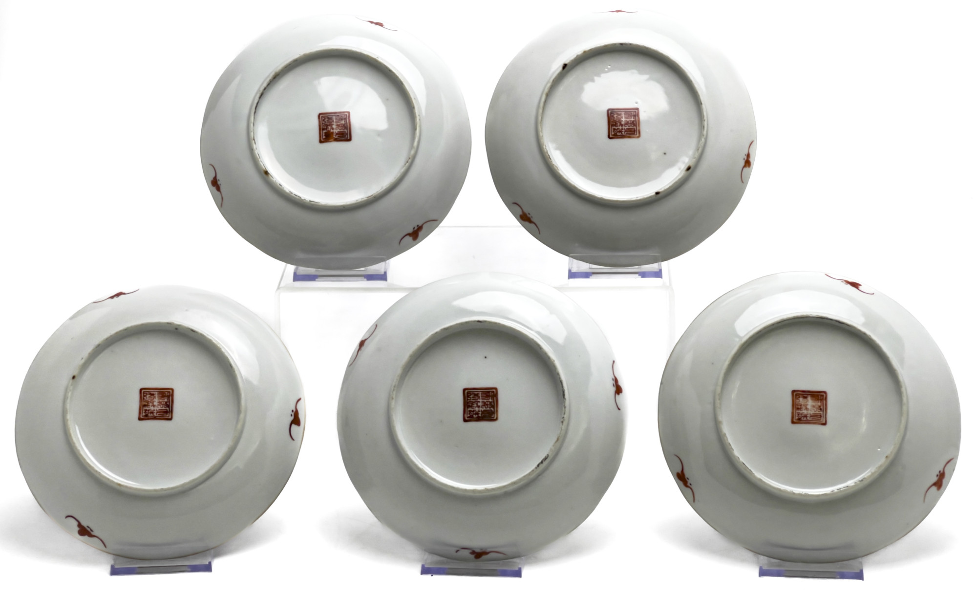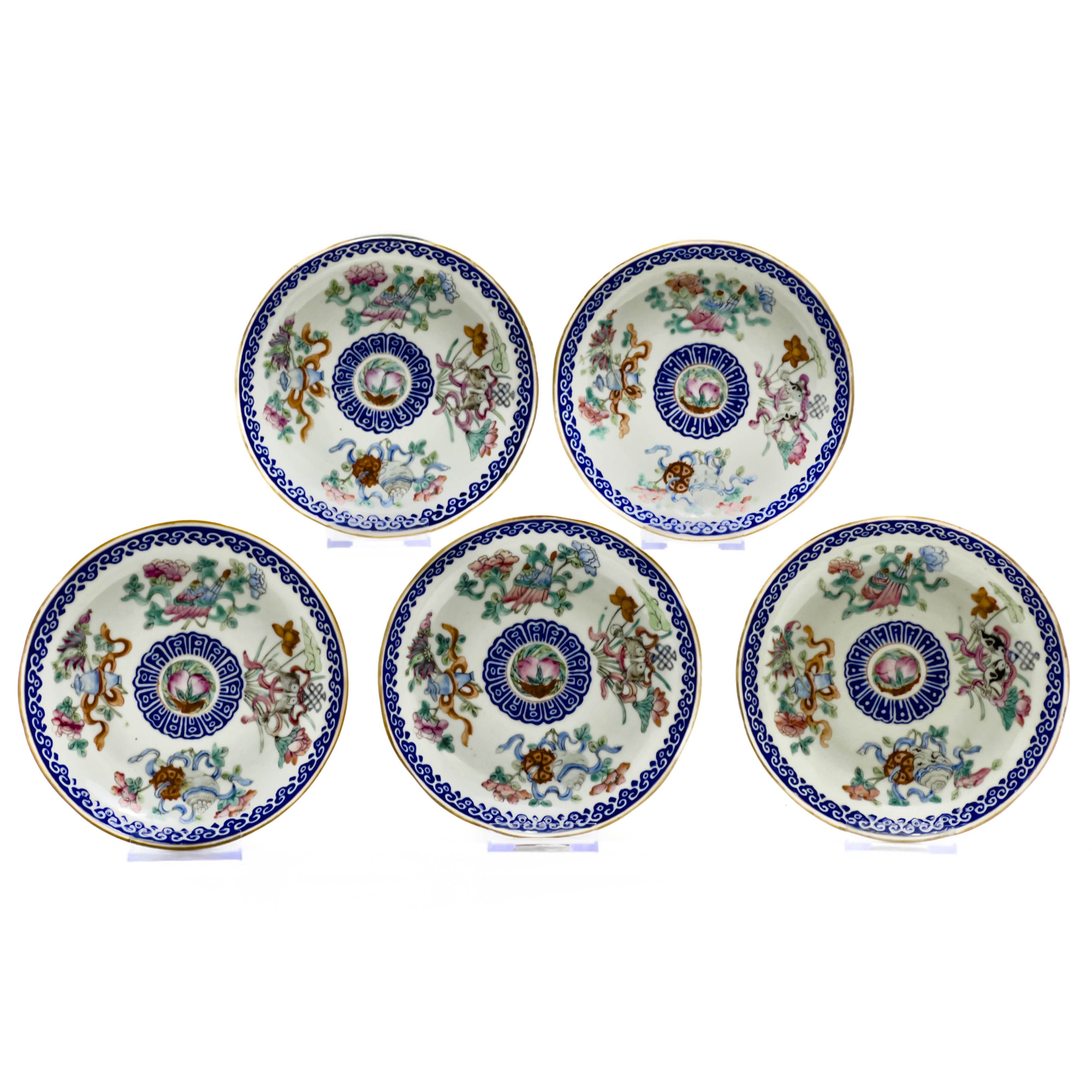 comprising five Famille Rose plates with overglaze decoration of floral designs gilt edge