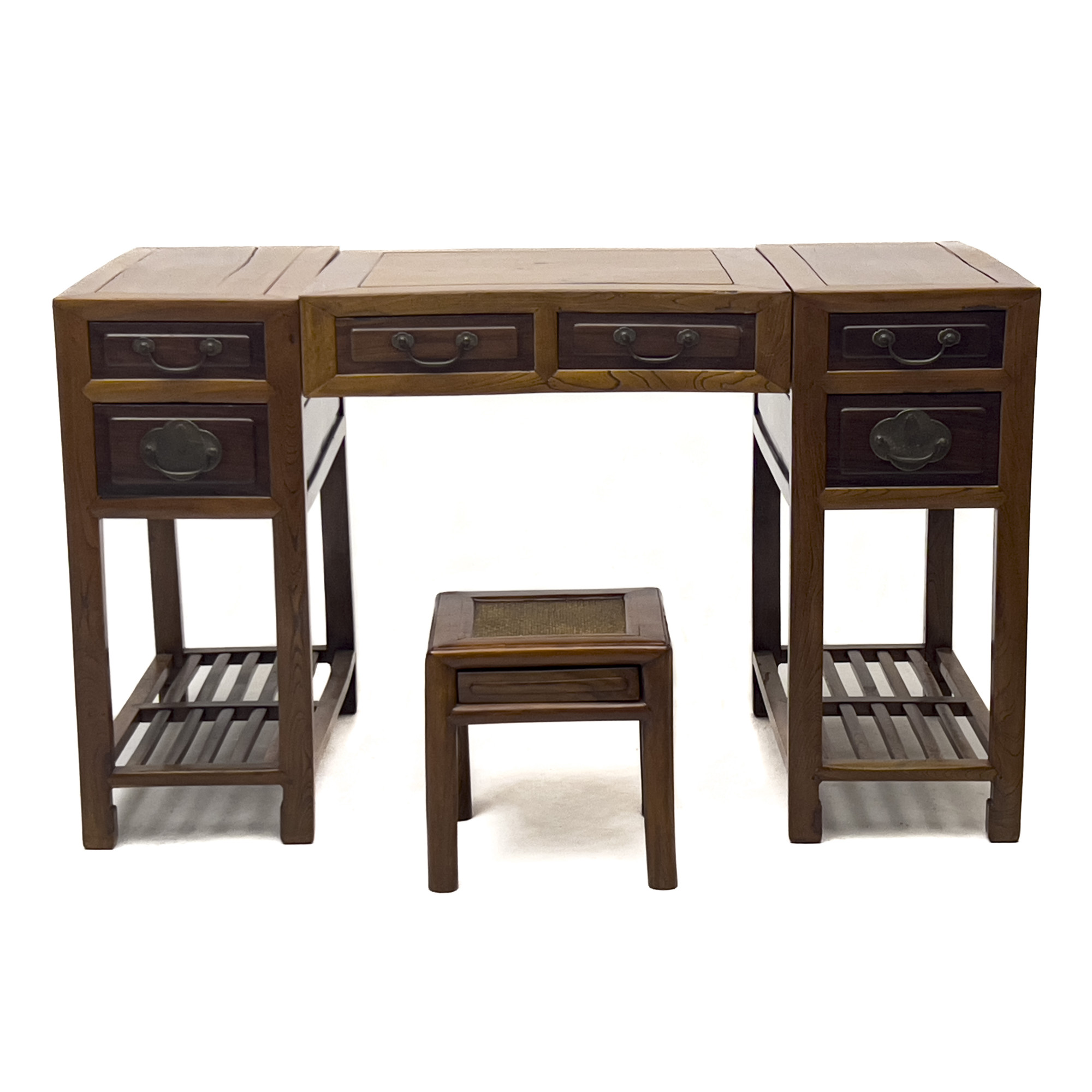 In three parts with each pedestal with one trellis openwork shelf and two drawers on each side, and central component with a pair of drawers, fitted with brass handles, along with small stool