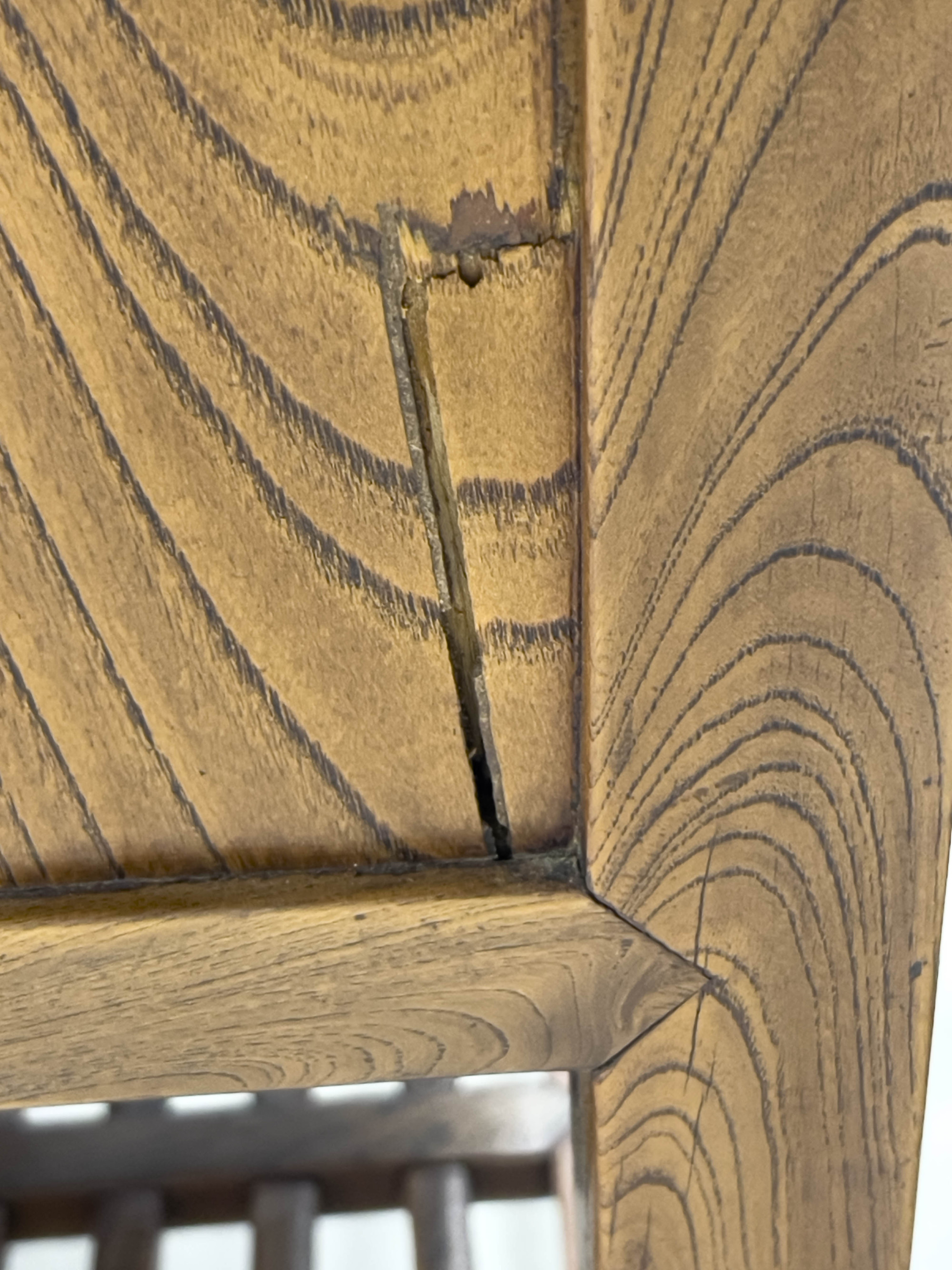 overall good condition, with some scattered areas of wood splitting, some water staining to top, one broken drawer lock, and loose joinery, lacking three of the four original pegs