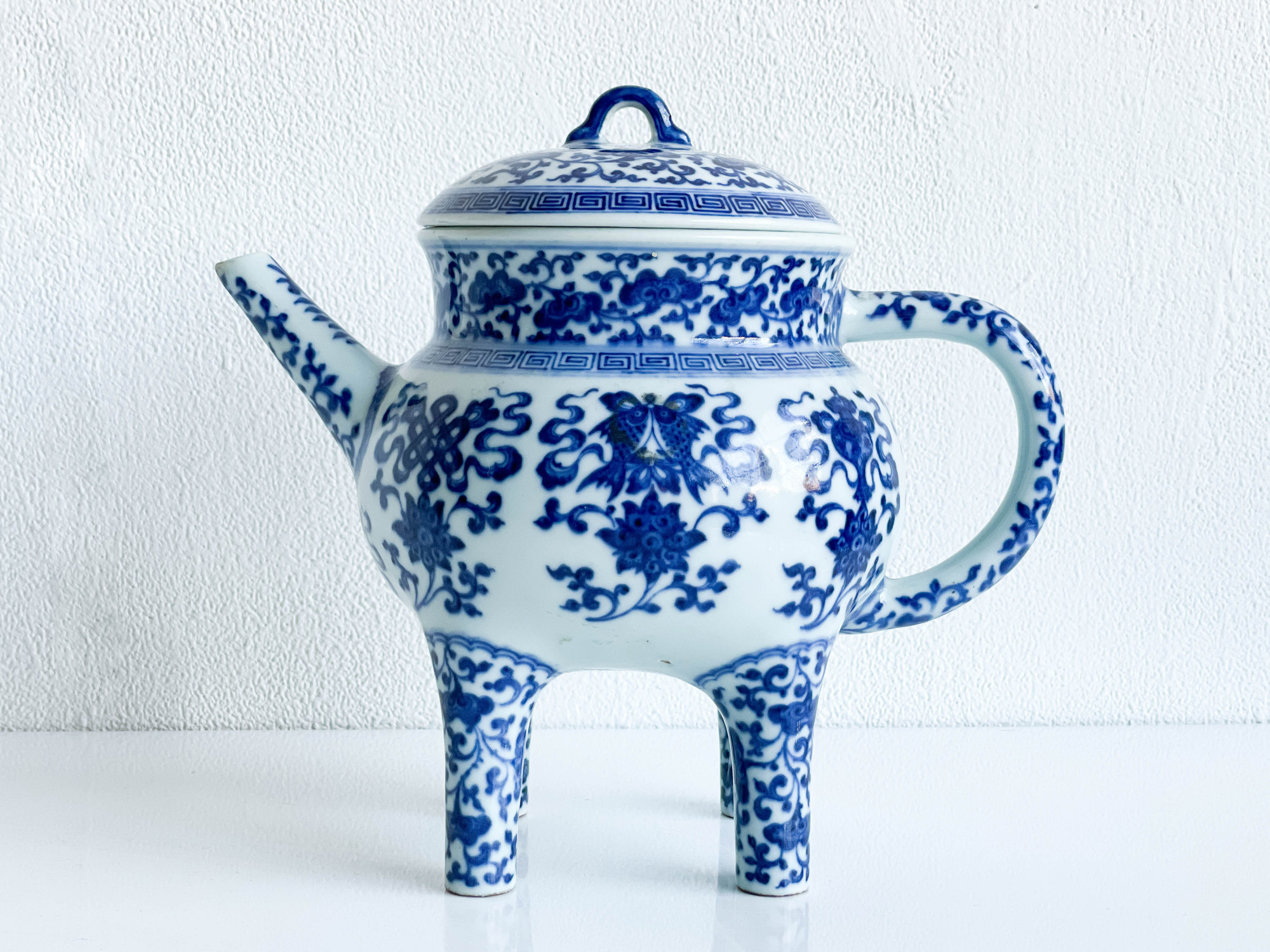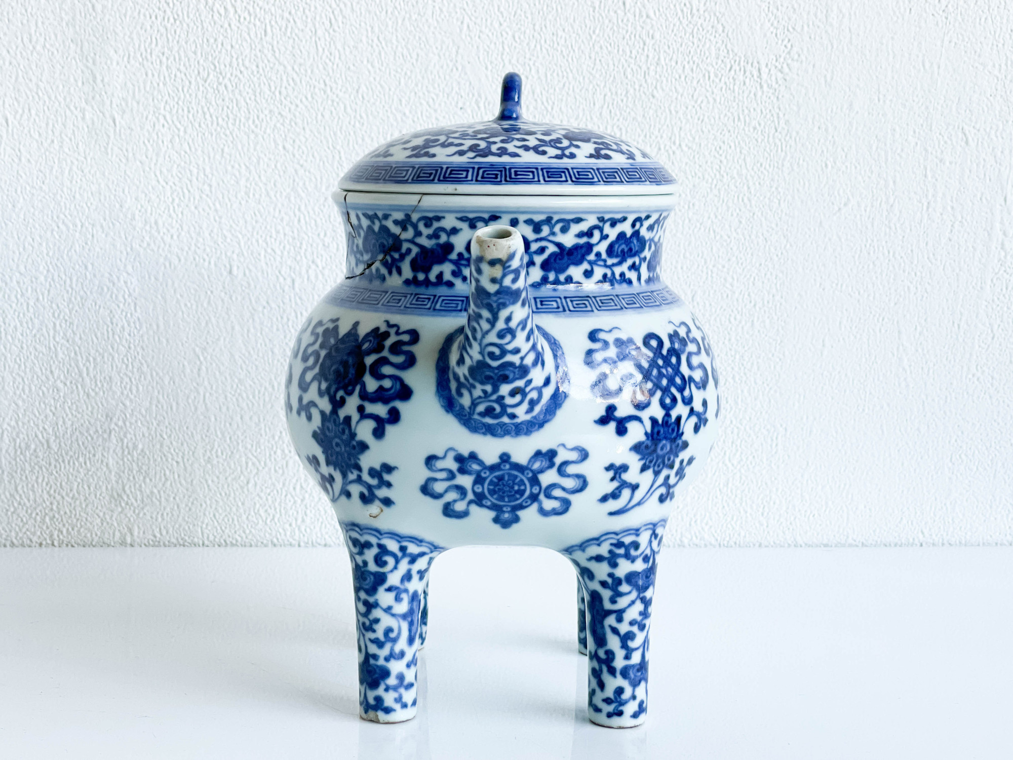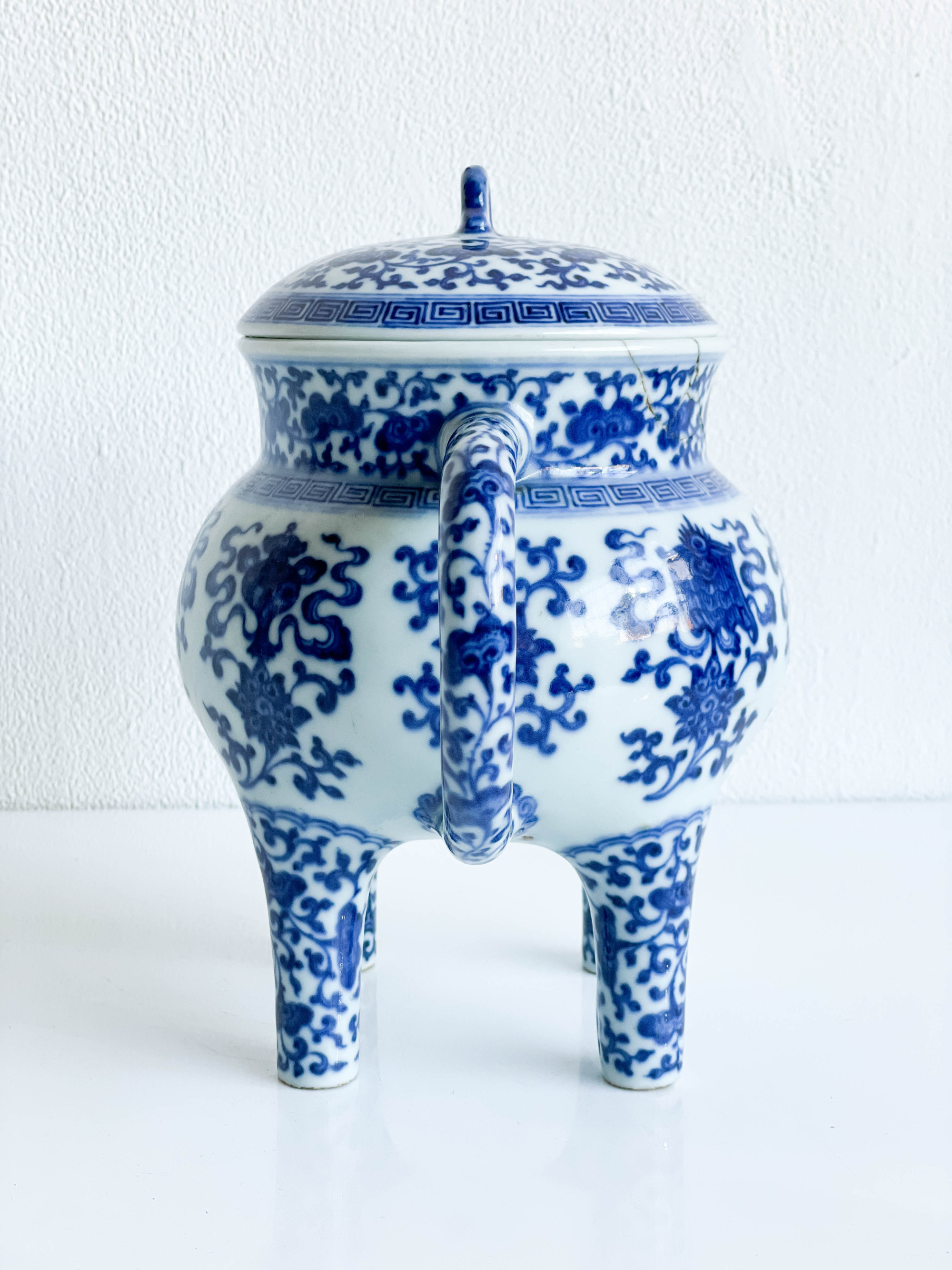 with a six character Qianlong seal mark on the underside, in the archaic bronze 'he' shape with a globular body and spout on four legs, decorated with the eight auspicious Buddhist symbols, 'Bajixiang'