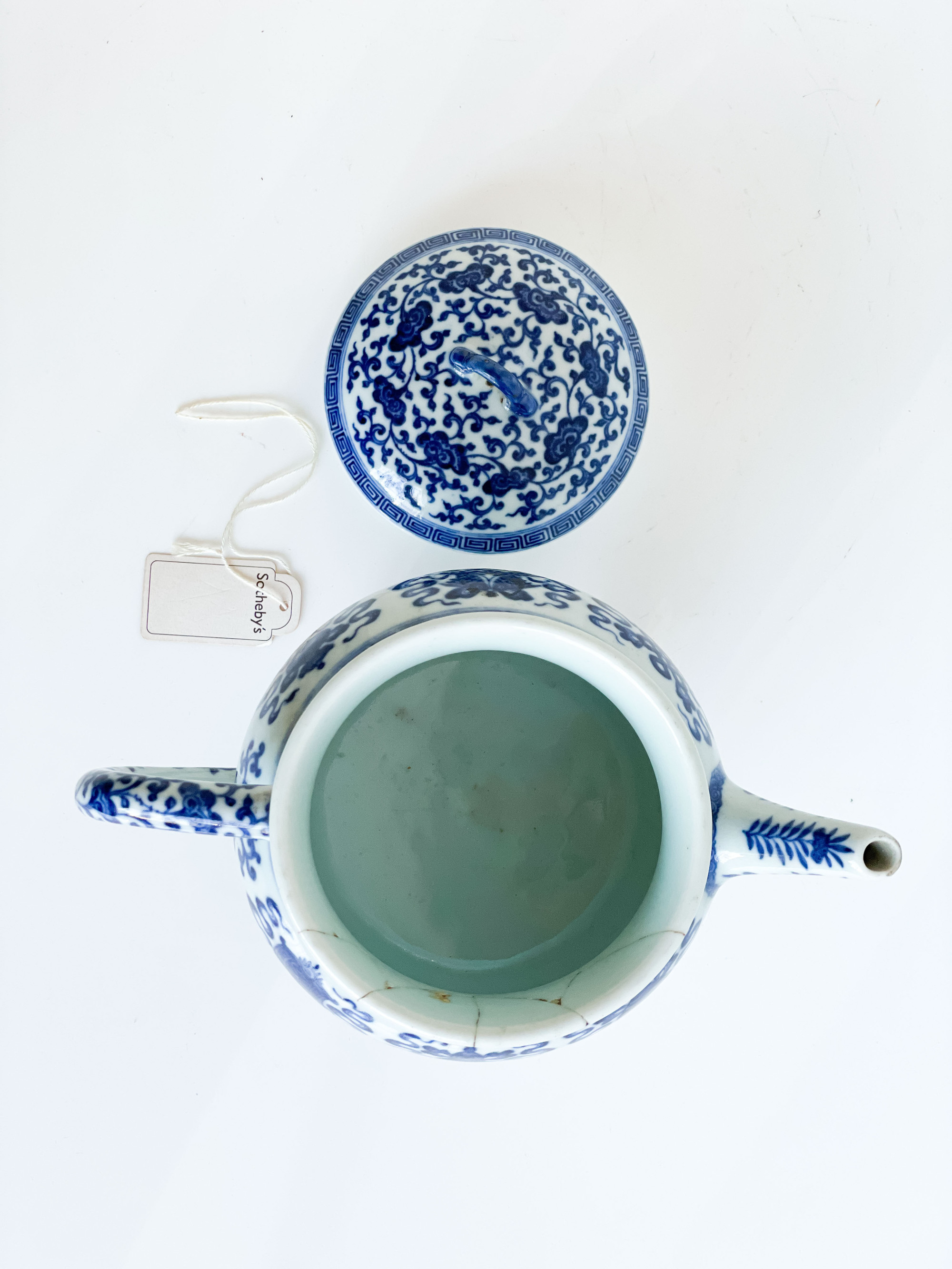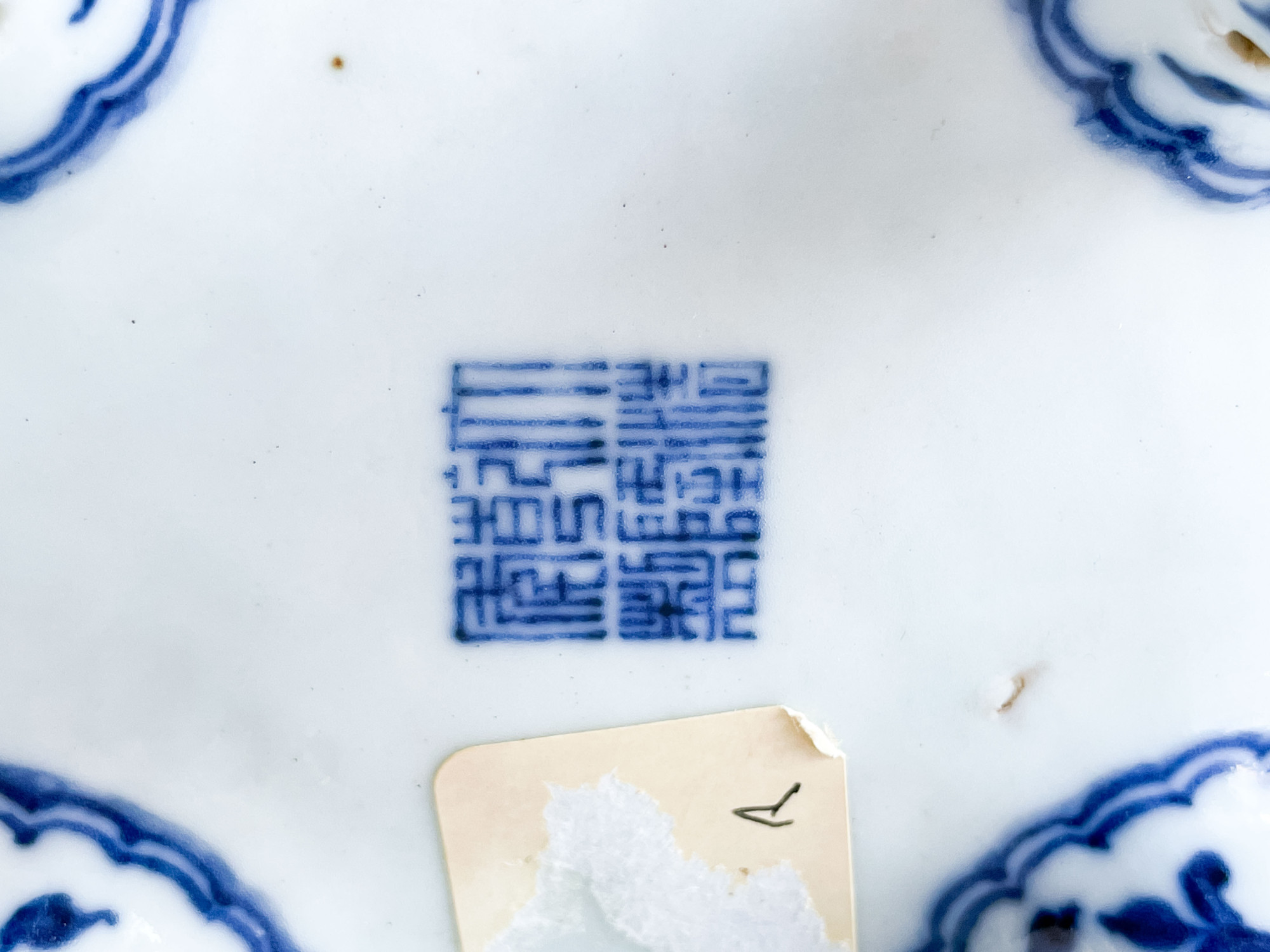 wear commensurate with age, glued repair along rim, minor chip loss near leg, minor hairline cracks, circular area of adhesive residue