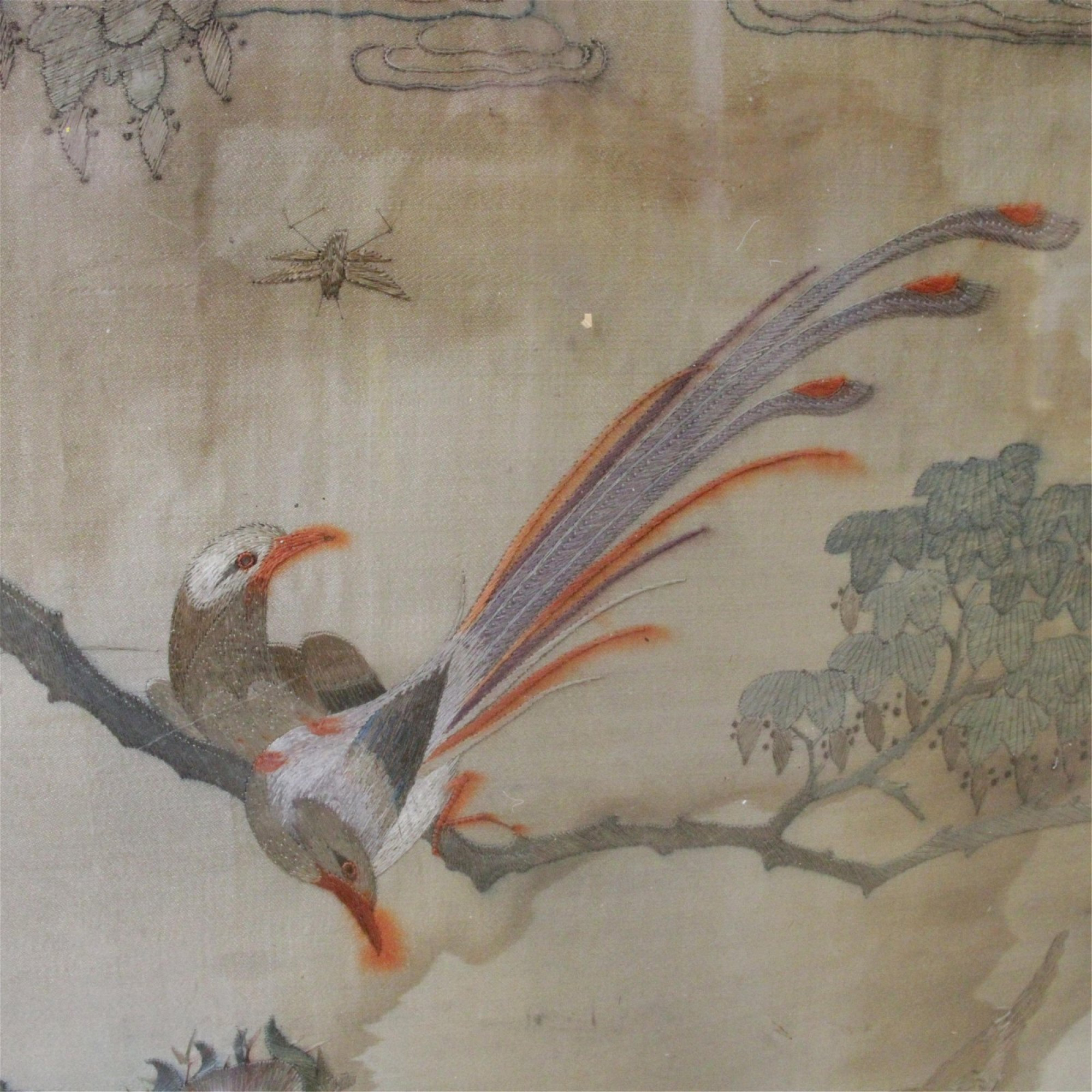 Chinese Carved Wood and Inlay Mother of Pearl Table with Embroidered Top. Square-legged low table with removable frame top inlay with mother of pearl in floral motif. Under glass top is a finely embroidered silk scene featuring Phoenix, cranes, other birds and insects in a landscape setting of blossoming trees flowers. Possibly was originally an older large table screen and made into a table at a later date. 22" x 35" x 29" Property from a longtime Connecticut Collector