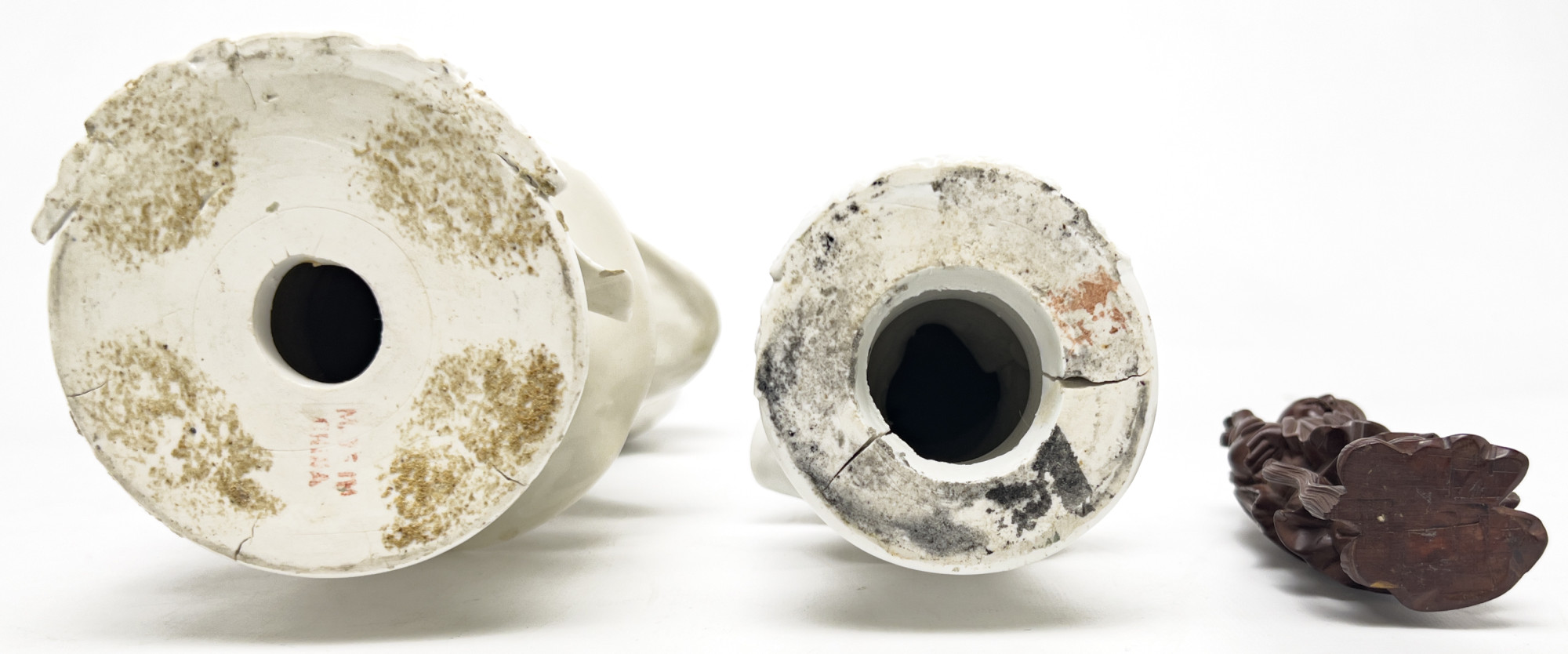 Comprising wood carved Chinese statue of Buddha, two porcelain Chinese Guanyin statues