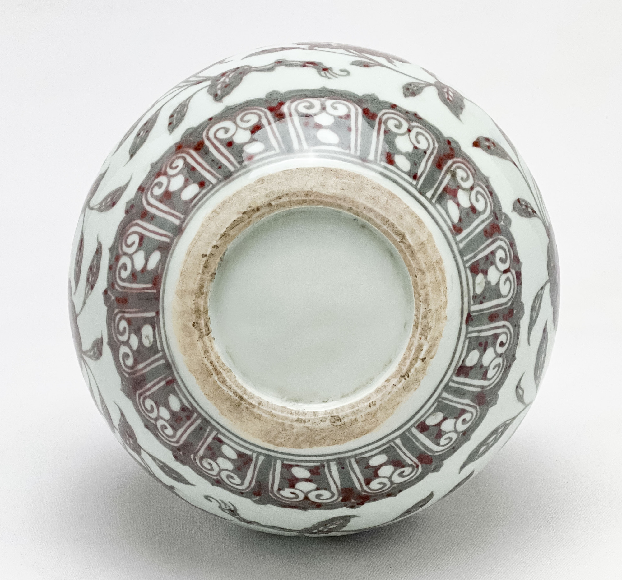 with custom wood stand, the body decorated in underglaze red lotus blossoms with scrolling foliage, the shoulder of the lower portion with a spurious Xuande mark in underglaze blue