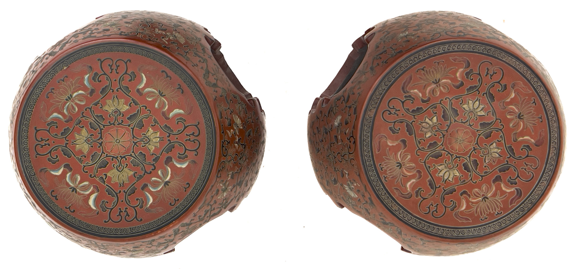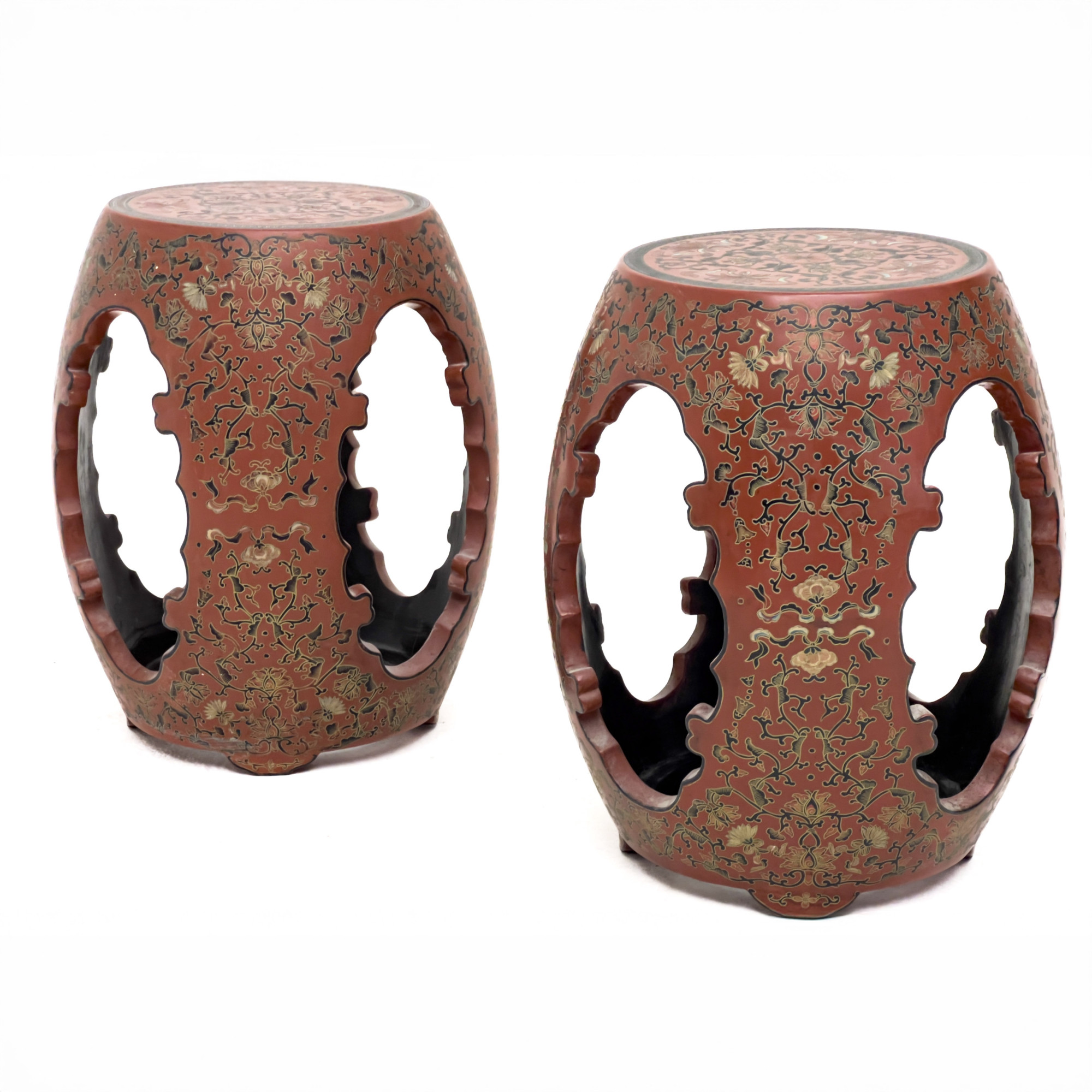 Pair of Chinese red lacquer openwork stools decorated with scrolling flowers