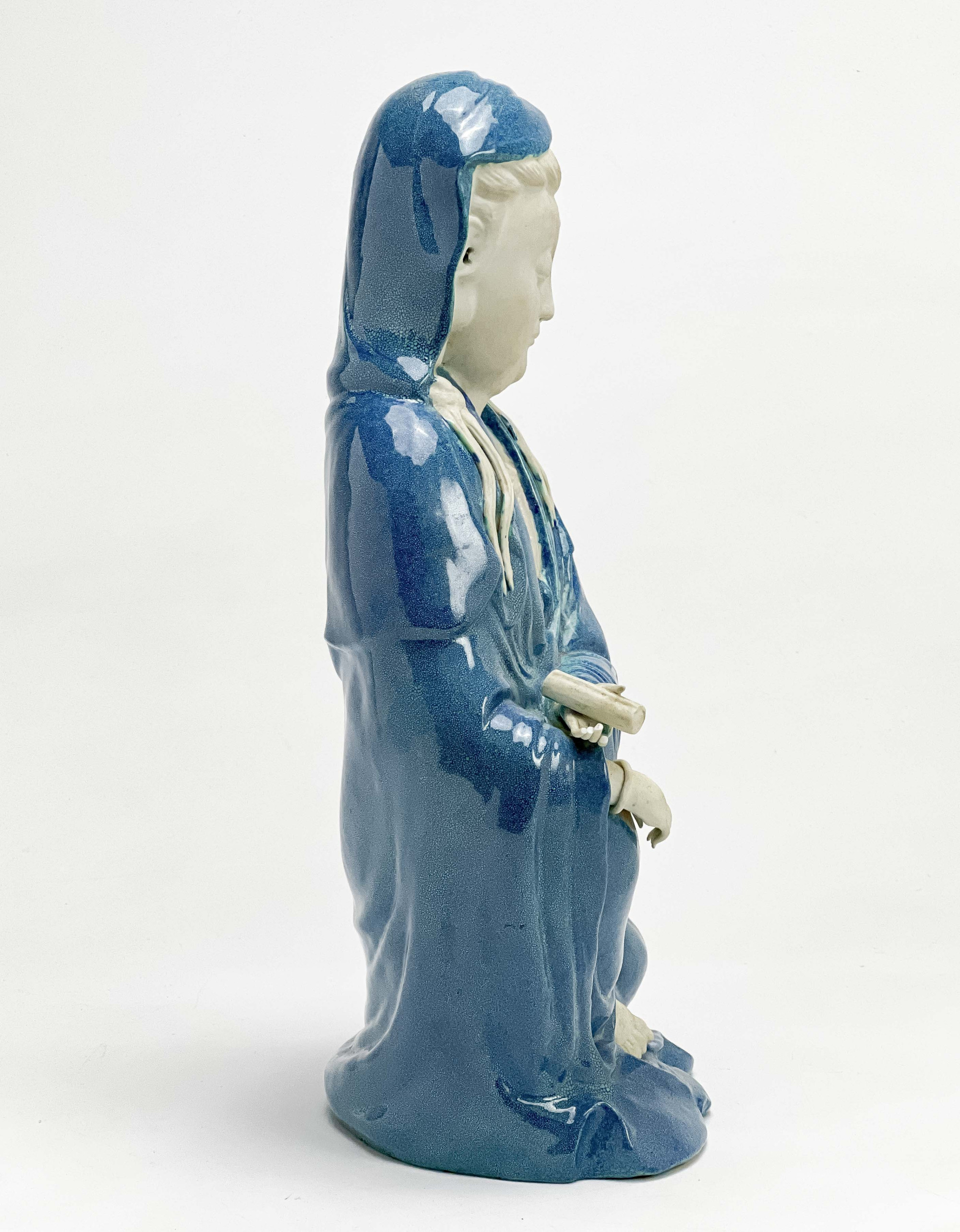 Guanine shown seated and holding a scroll, the robe glazed a robin's egg blue and the skin left unglazed