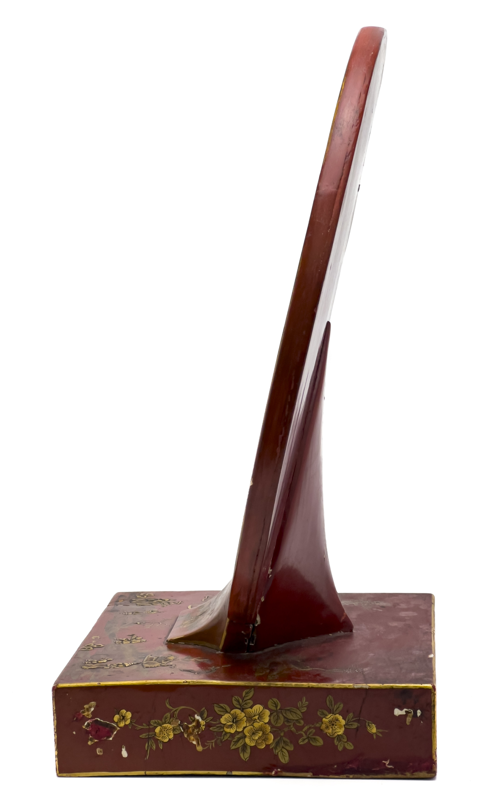 Red lacquer chinoiserie dressing mirror with gilt figures to base and floral details to frame