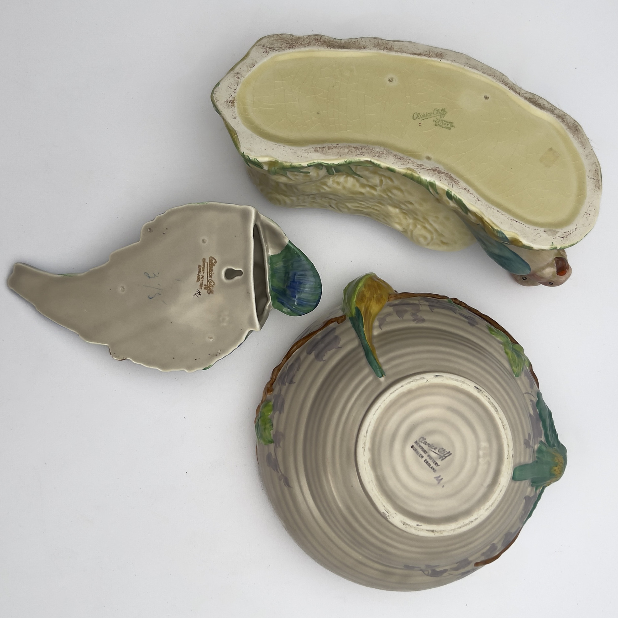Comprising of a ceramic bowl, planter, and wall pocket each with an enameled relief of budgies for Newport Pottery