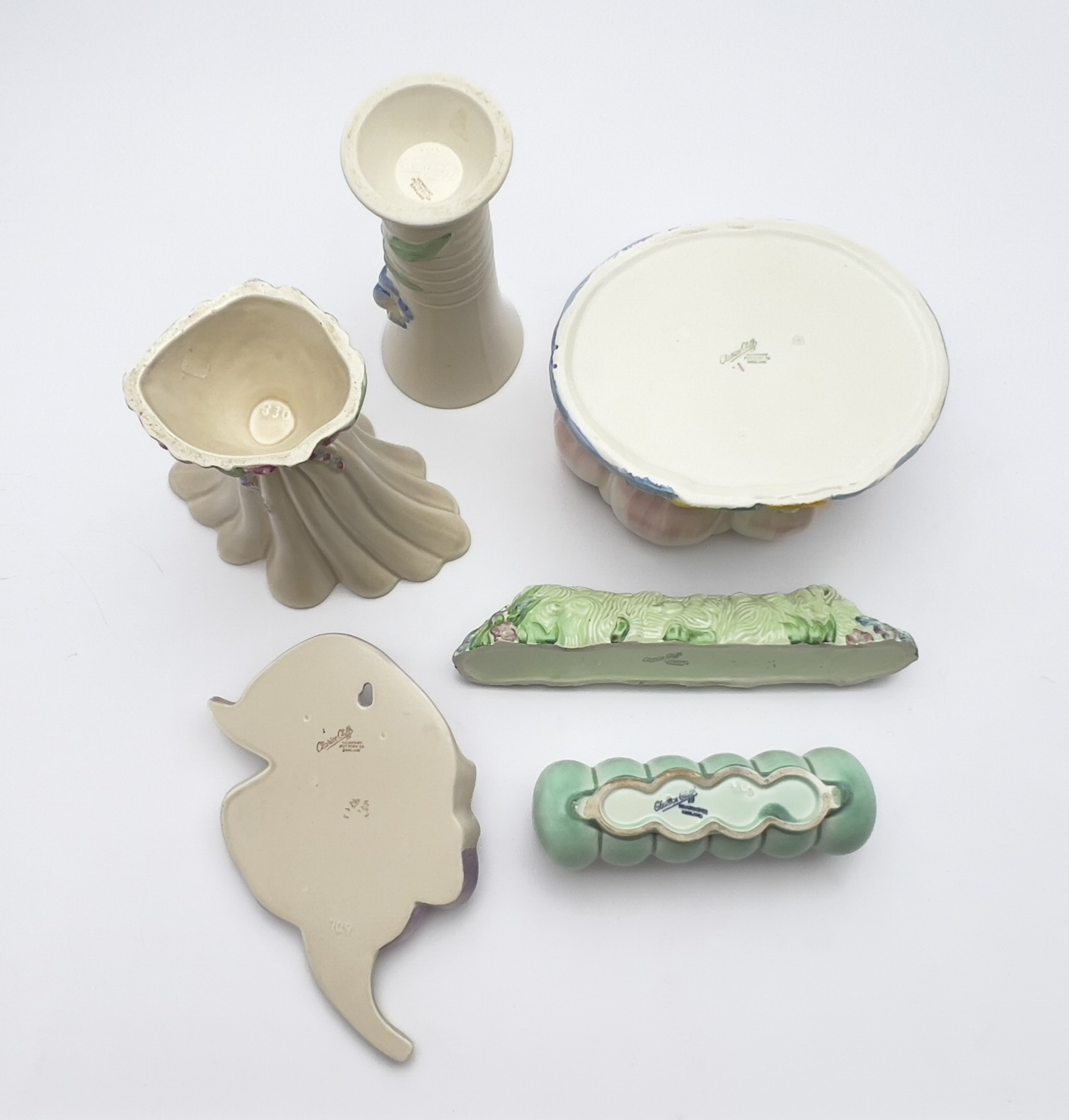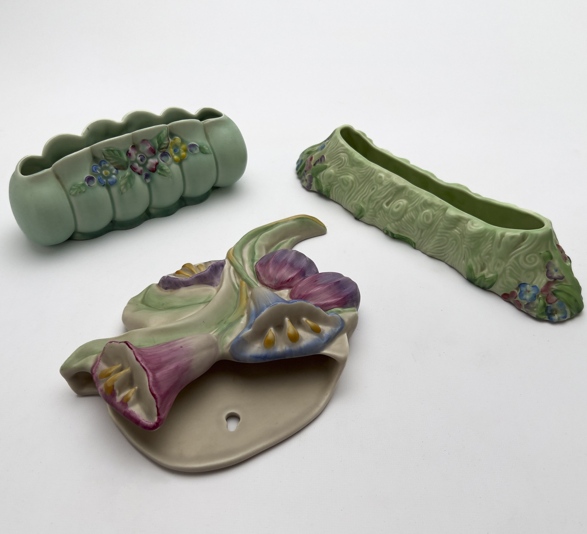 Comprising of two vases, two posy troughs, a water lily bowl, and a wall pocket all featuring various floral motifs