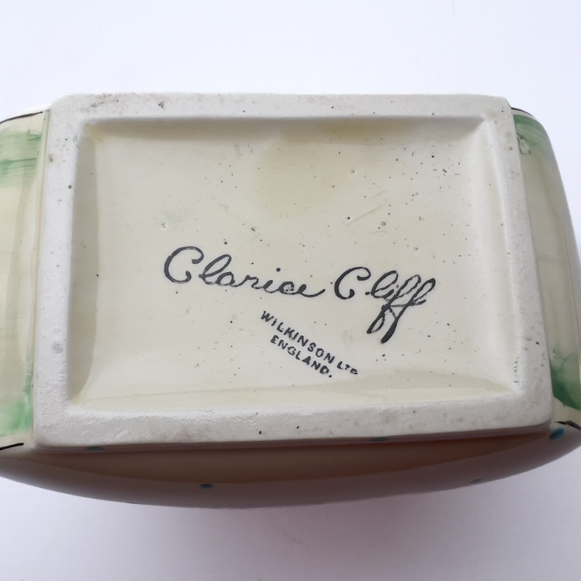 Comprising of a teapot, sugar bowl, and creamer in a floral and polka-dot pattern with a Bizarre covered serving dish in the pattern "Islands"