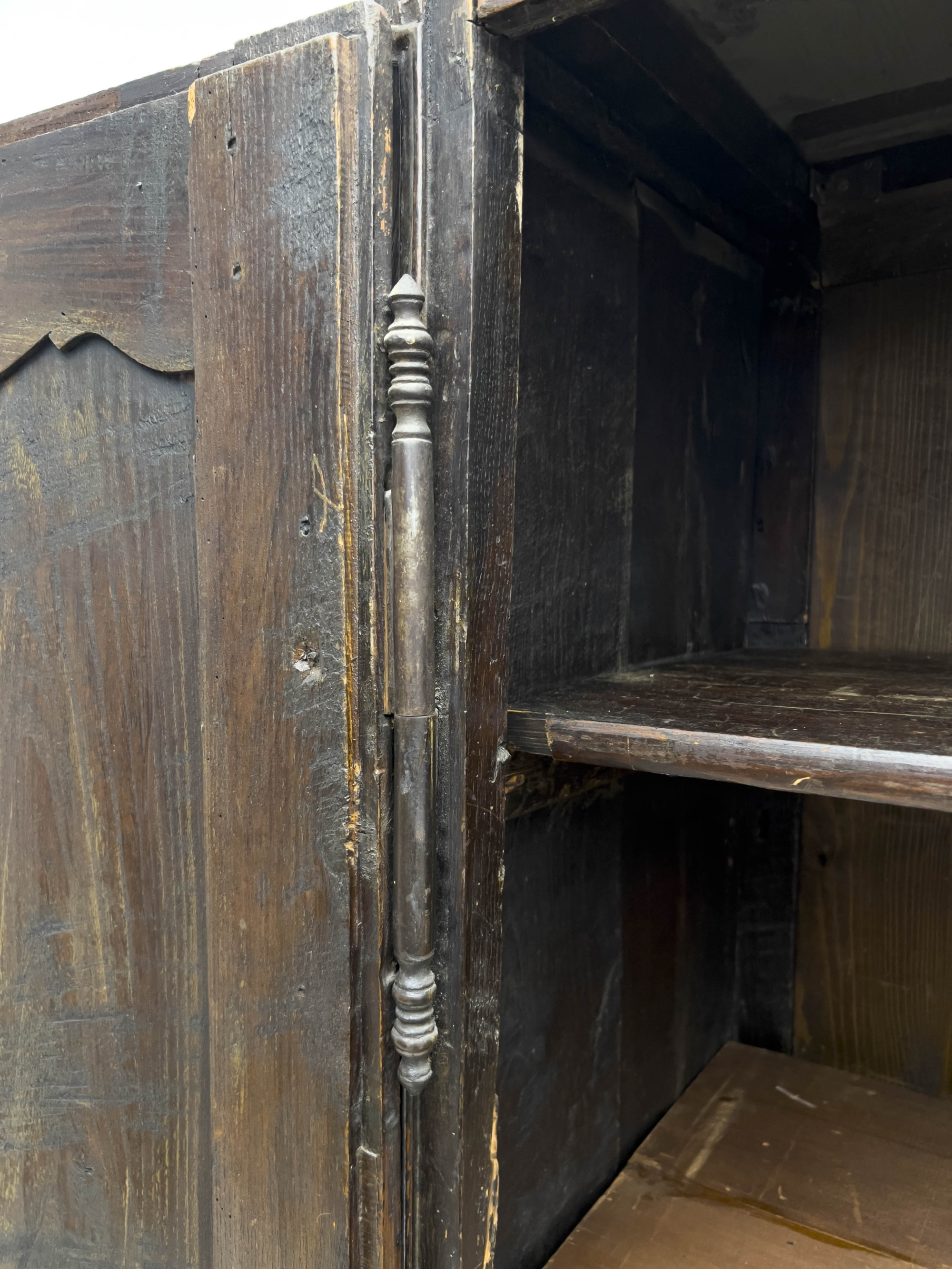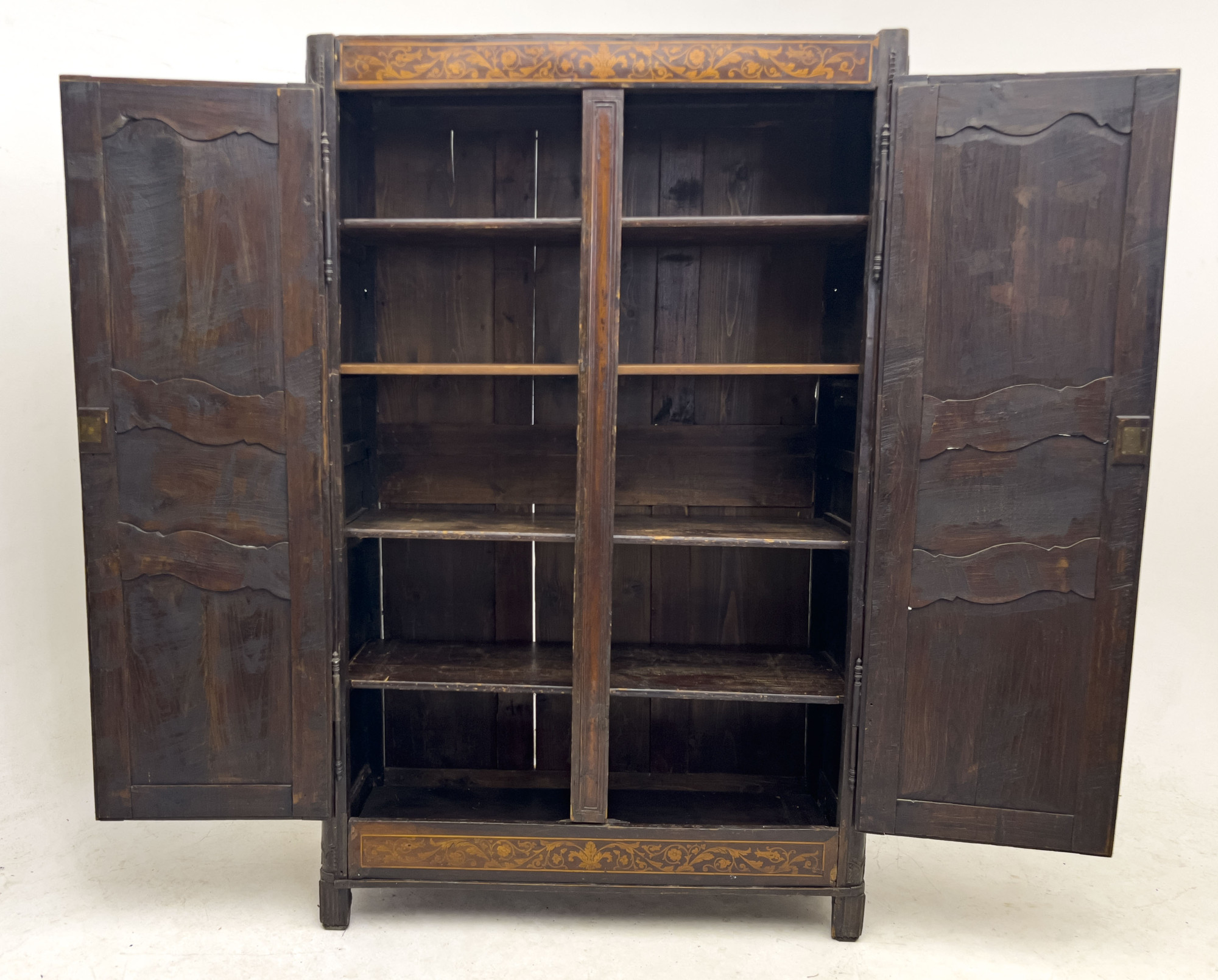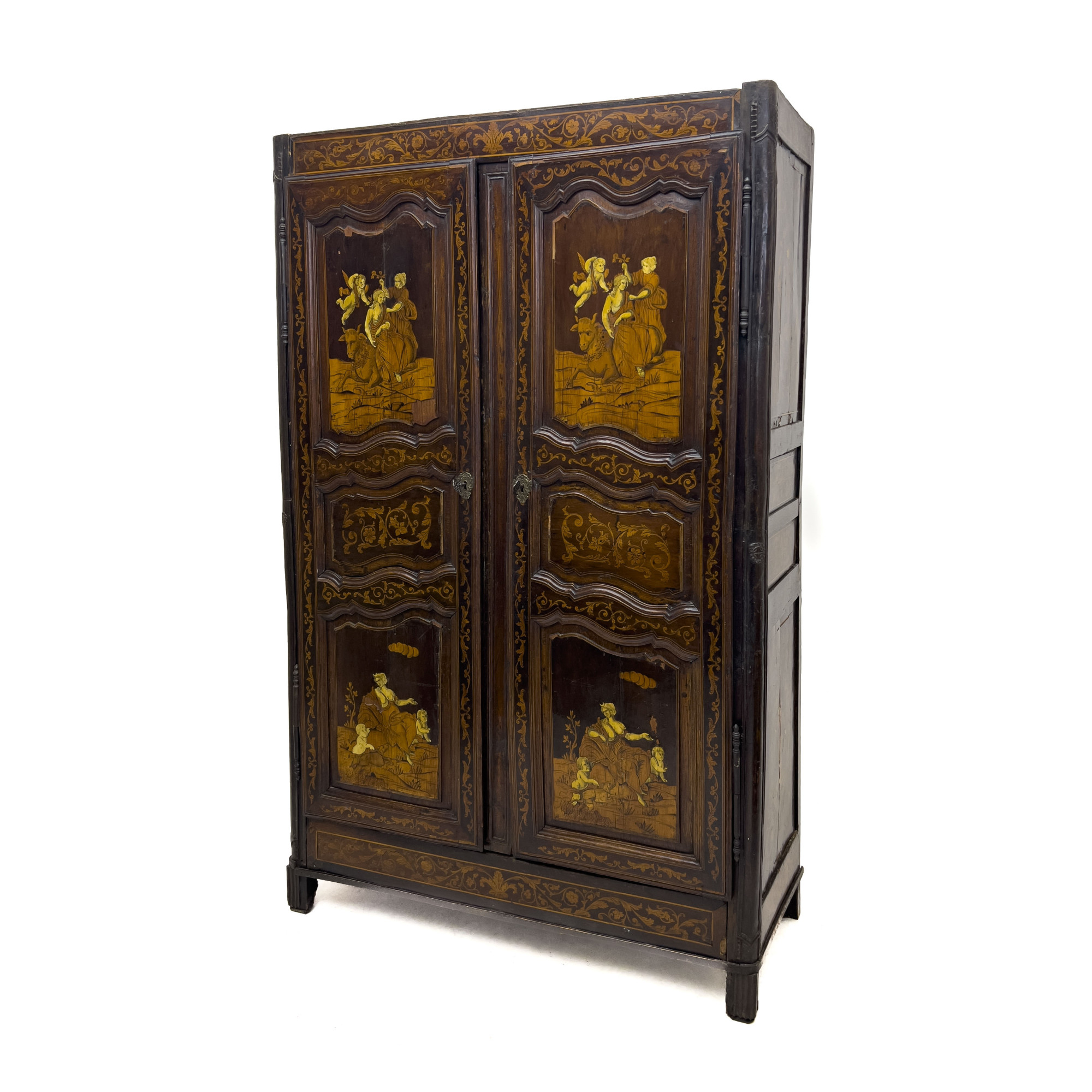 Cabinet with two doors opening onto five shelves, each door featuring two panels with classical scenes