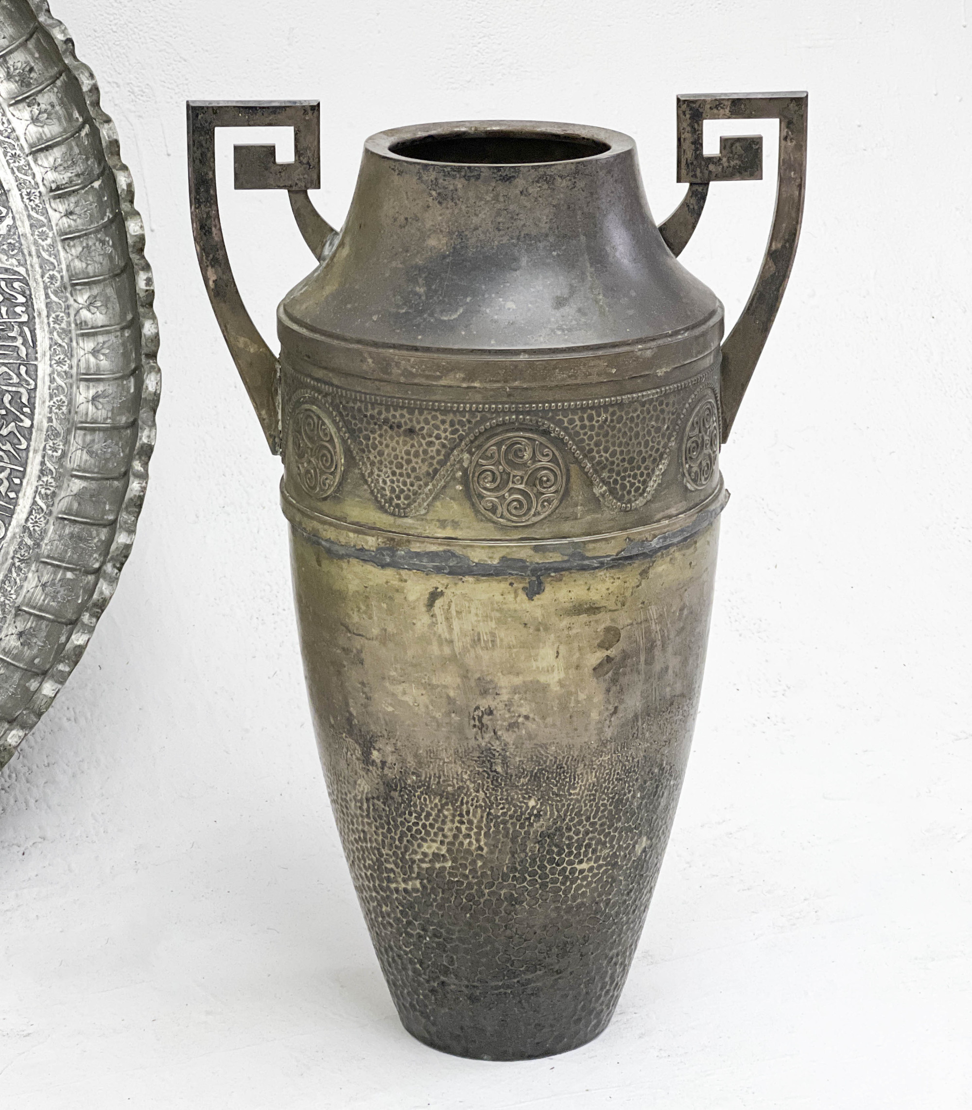 each in overall good condition, some minor losses to lacquer, oxidation and dents to vase, oxidation to brass charger