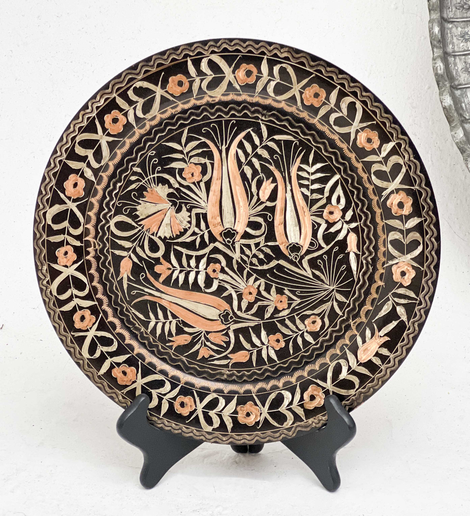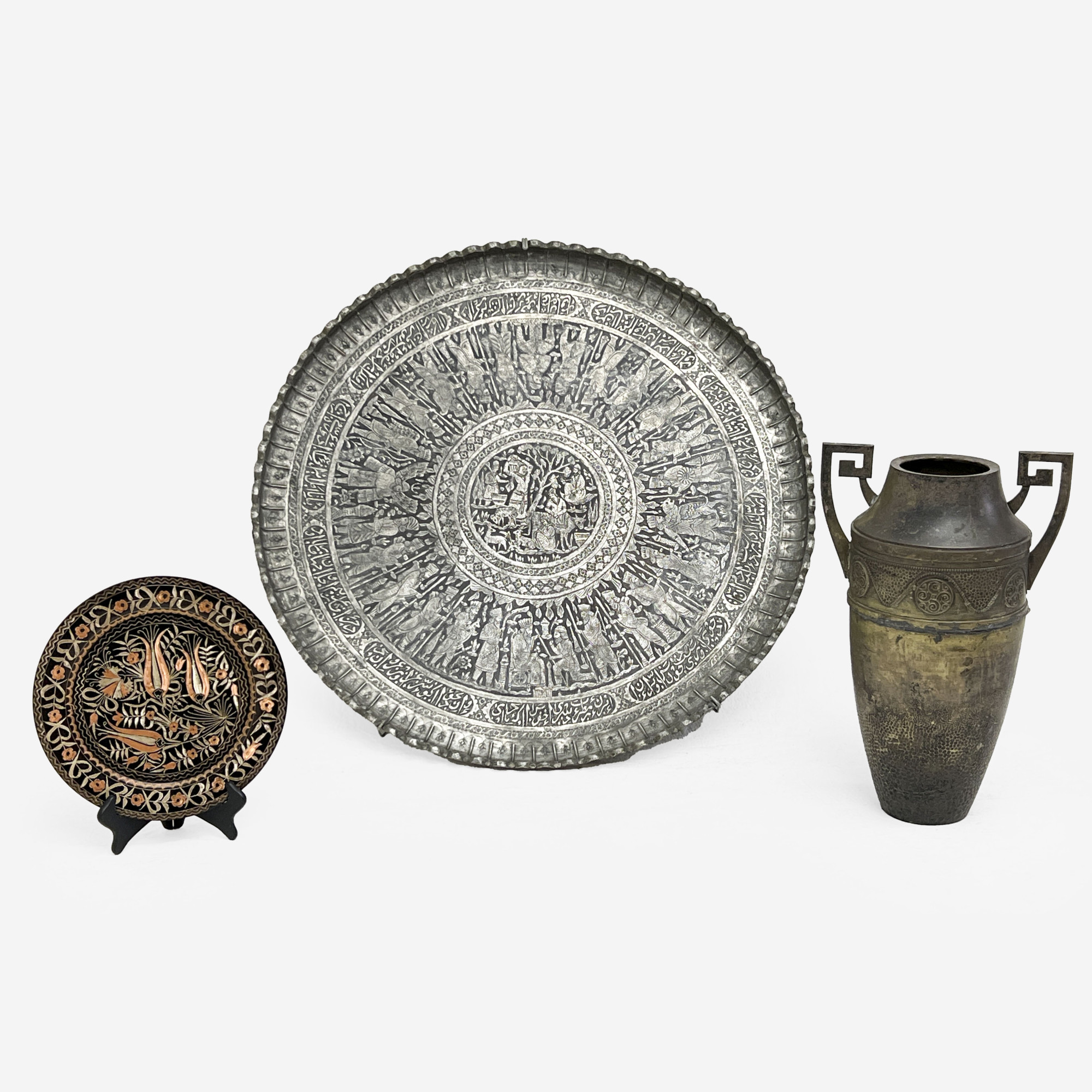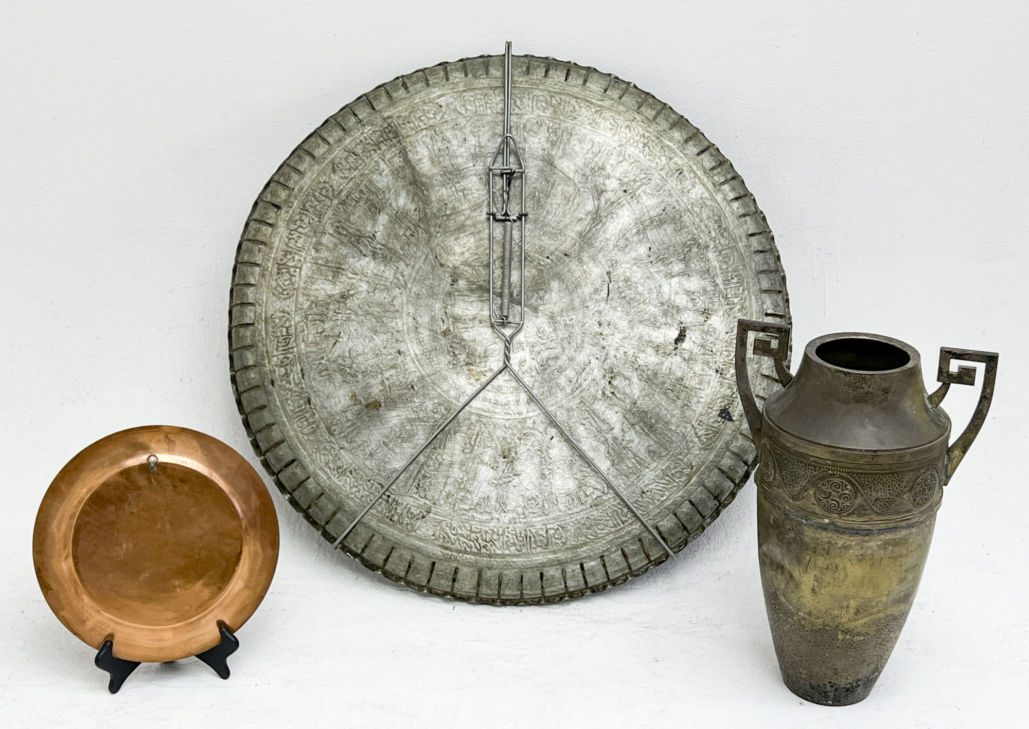 Copper Wall Hanging, Tinned Brass Charger and Brass Vase, Group of 3