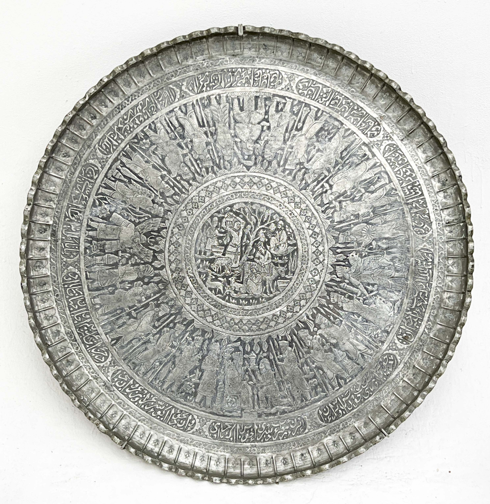 comprising one lacquered etched copper wall hanging, one tinned brass charger fitted as wall hanging, and one brass double handled vase