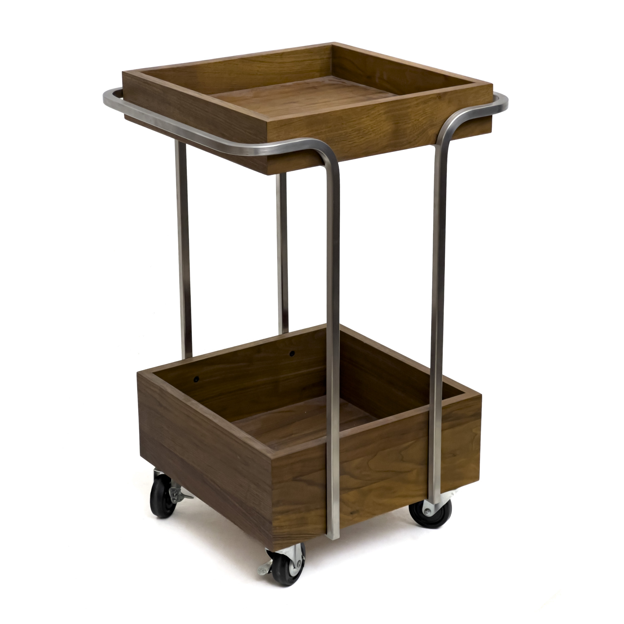Rolling wood and steel bar cart, with upper and lower tray, all raised on casters