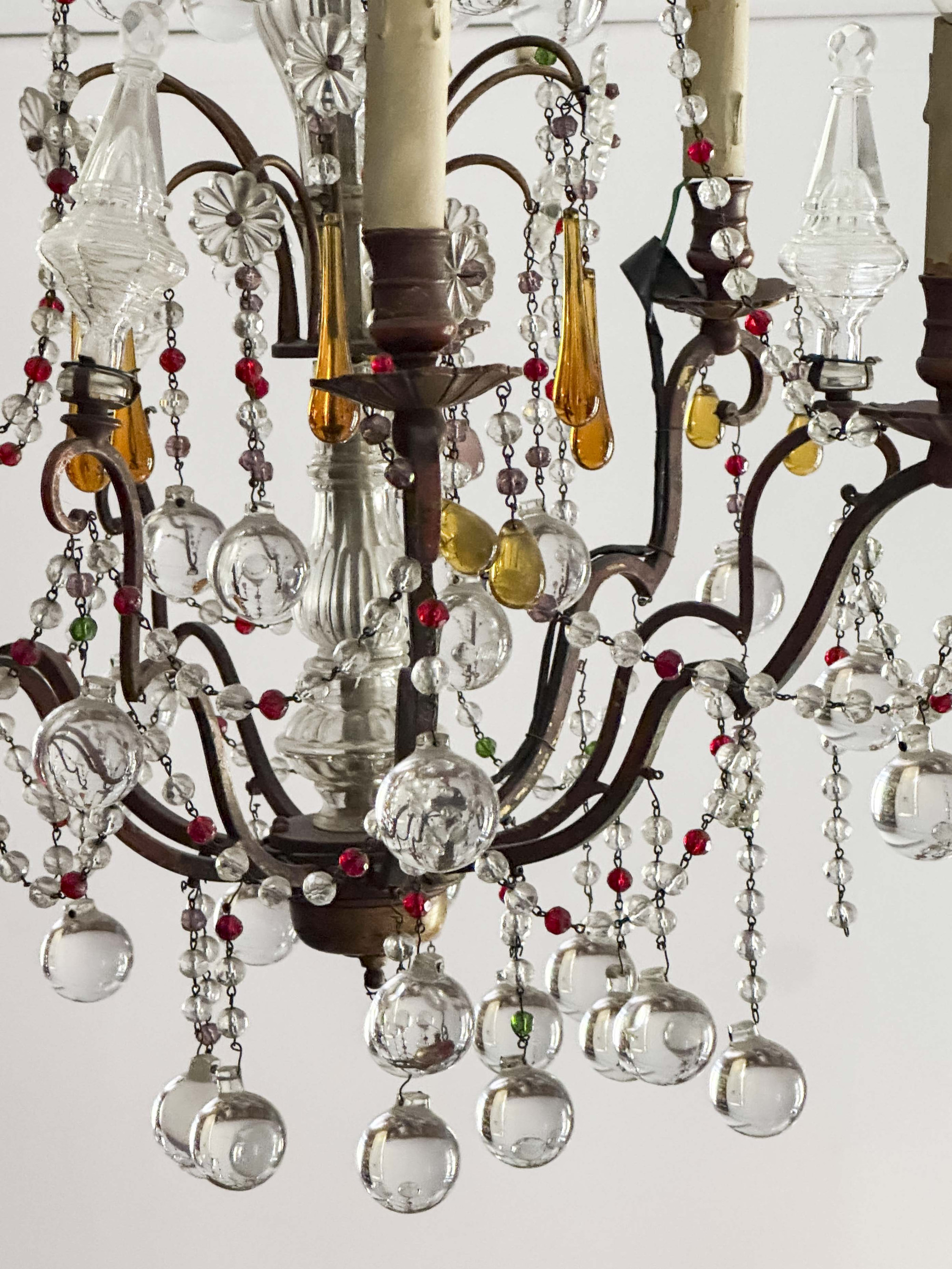 Brass and crystal six light chandelier, with clear crystal drops, and multicolored bead strands