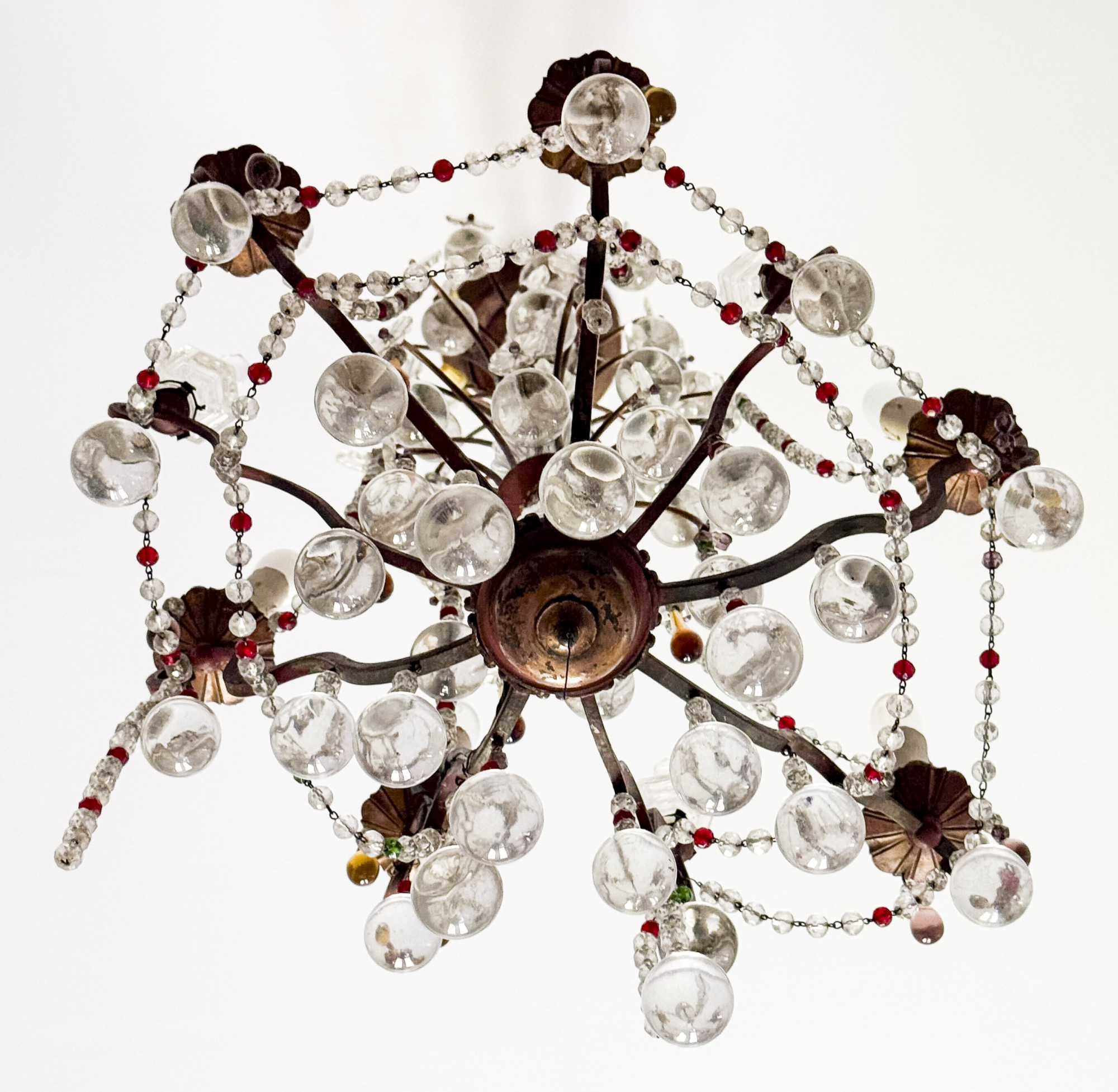 Brass and crystal six light chandelier, with clear crystal drops, and multicolored bead strands