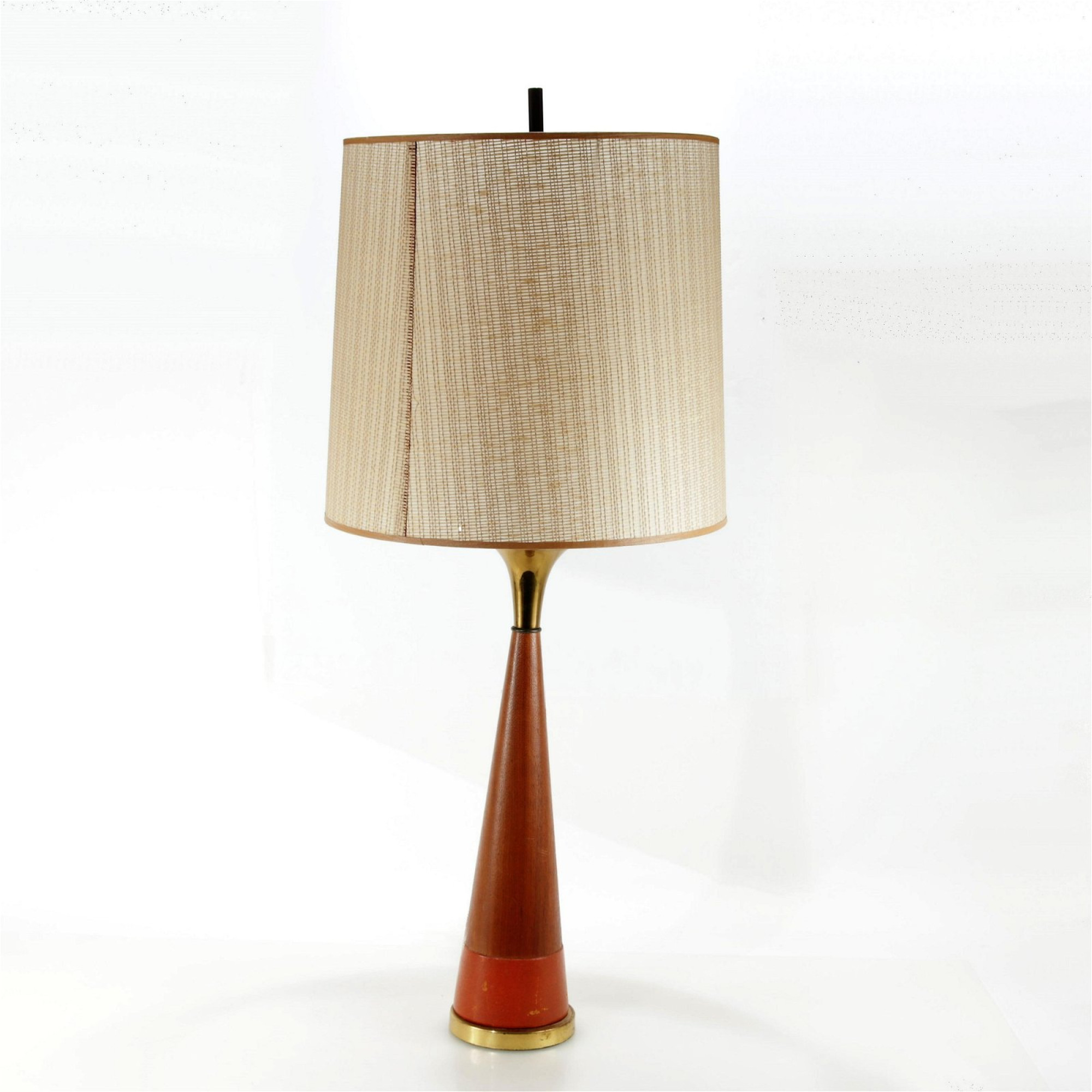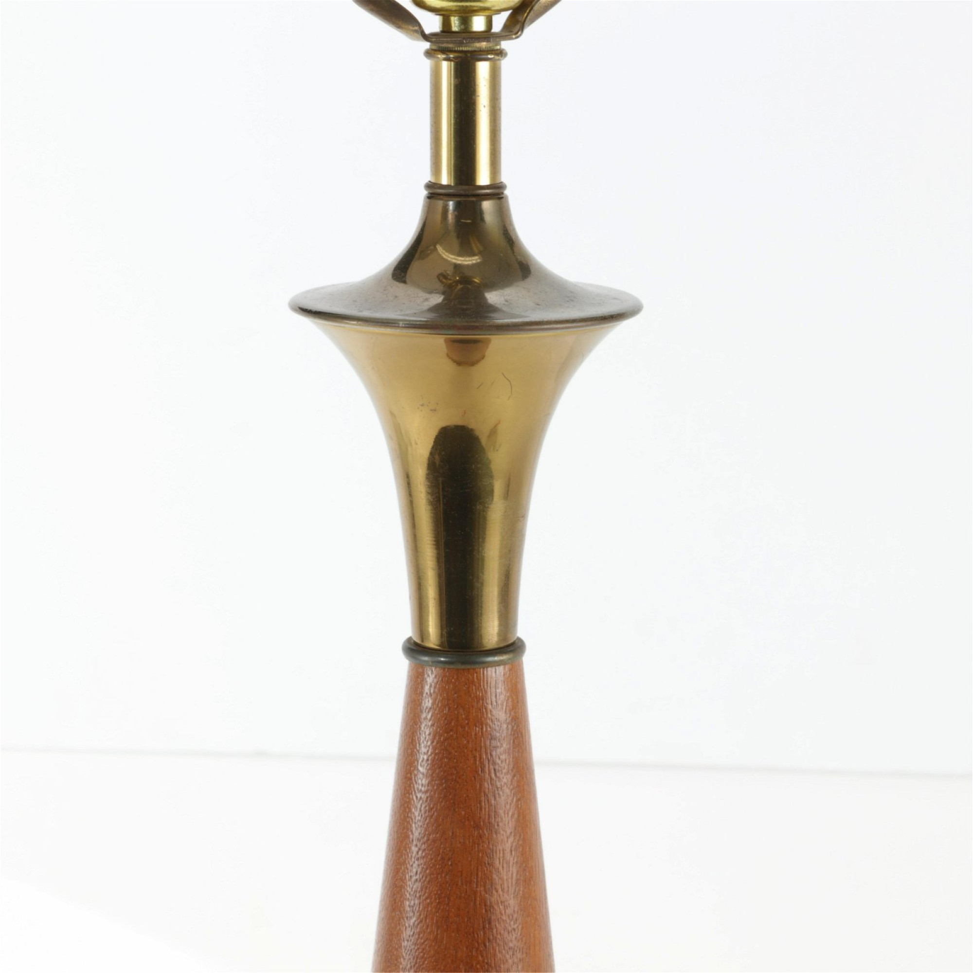 Danish Mid Century Style Table Lamp, burnt orange leather, faux wood veneer, brass base. 27" H to top of socket, overall 41" H. Property from the Litchfield unit of Connecticut Volunteer Services for the Blind and Handicapped, founded by Margaret ‘Peggy’ Reventlow, to record books, pamphlets, and magazines as digital talking books for those who cannot hold or read printed material.