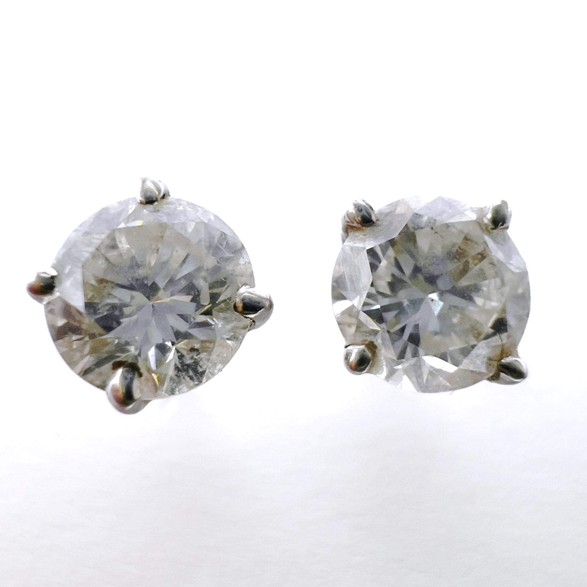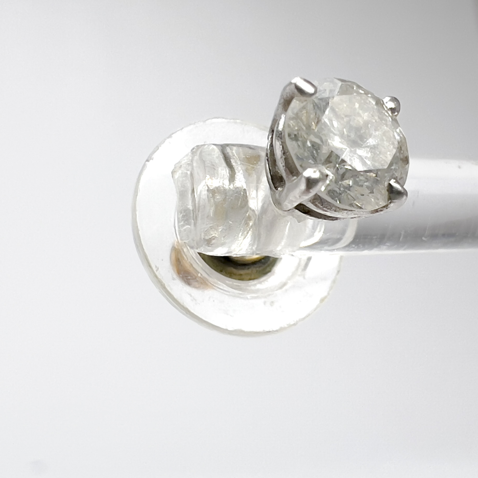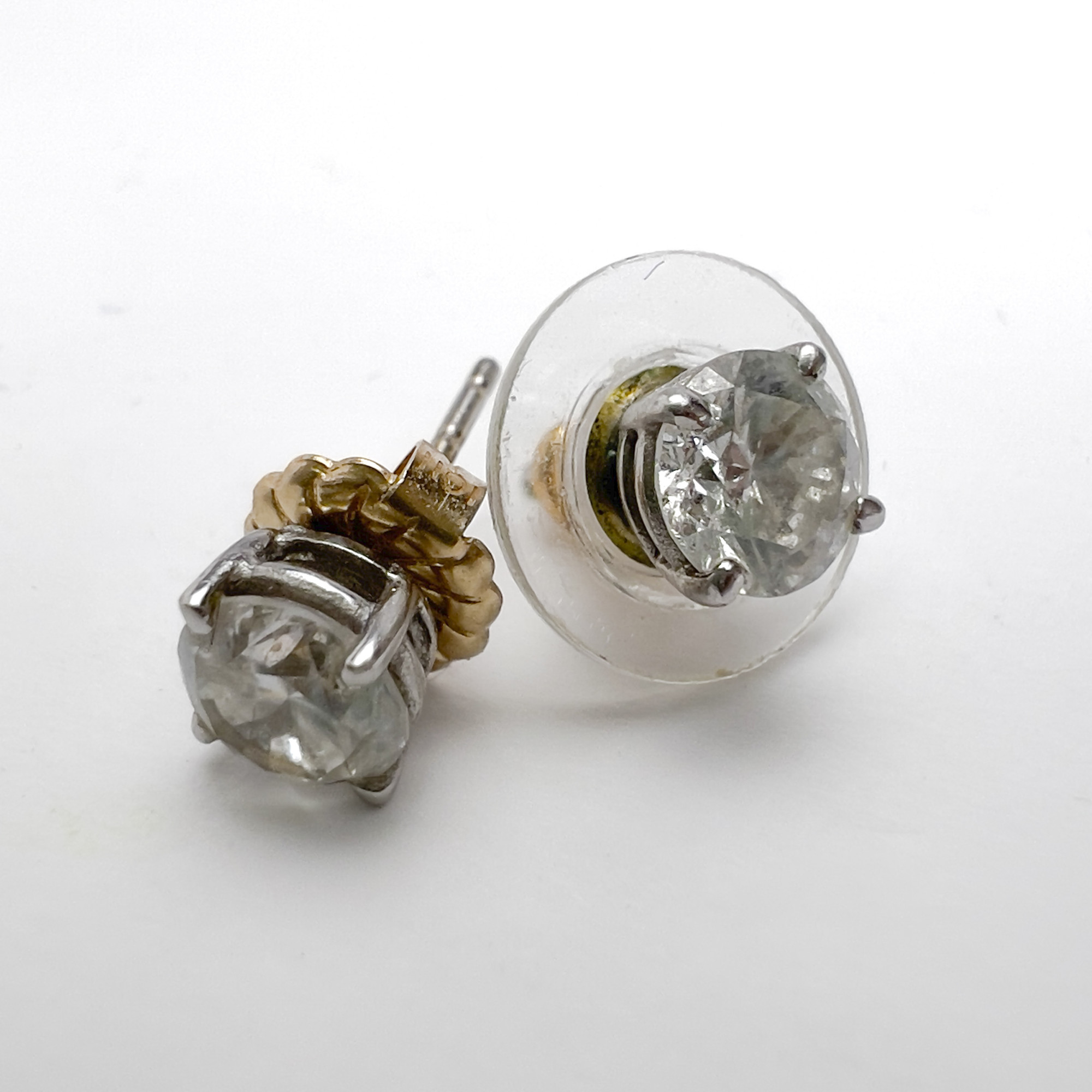 A pair of diamond solitaire stud earrings in 14k white gold four prong settings, one stone with no florescence, SI clarity and G color, the other with strong florescence, SI clarity and H color. Each diamond approximately .9 carat