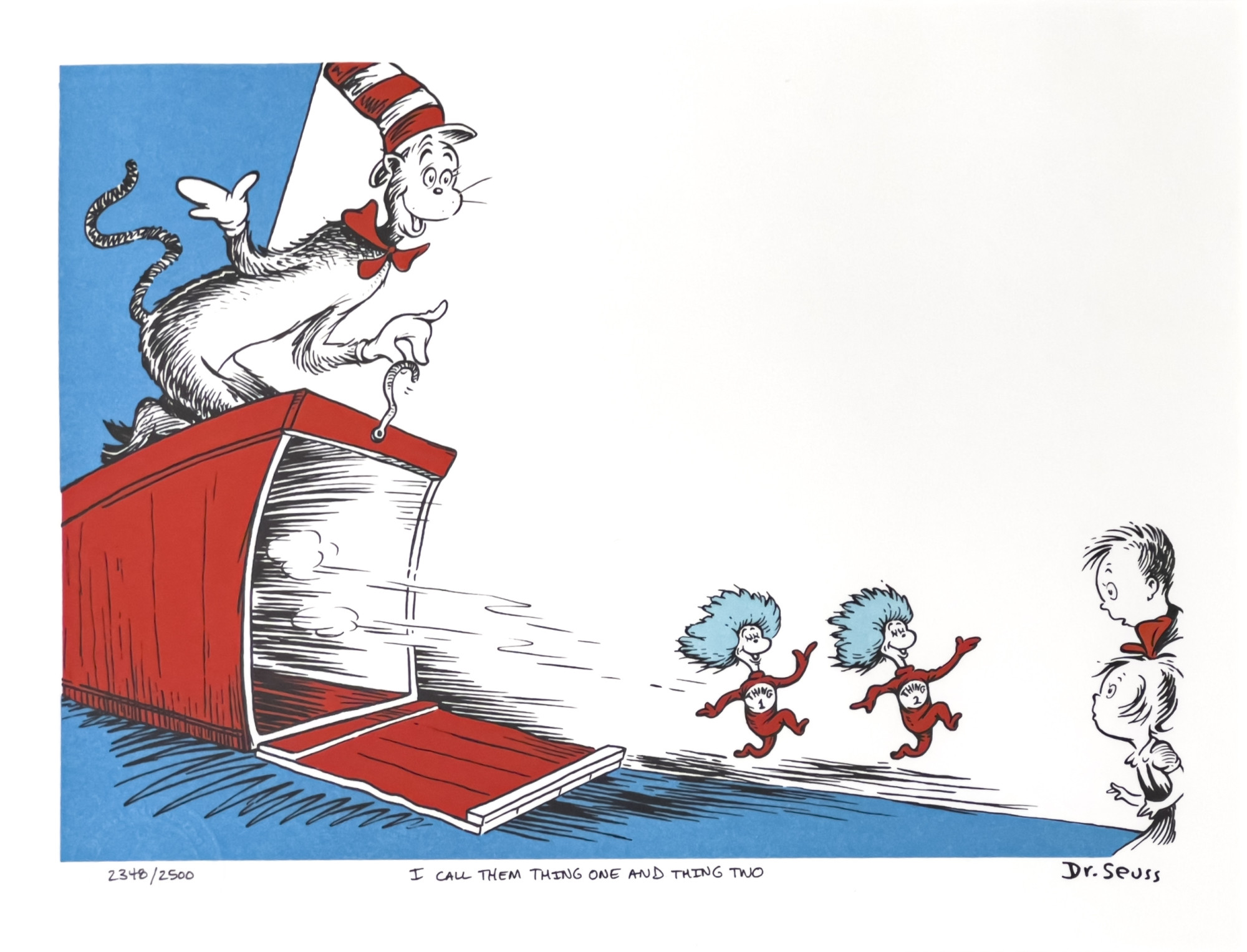 Comprising of two framed prints, one Green Eggs and Ham, editioned 1235/2500, one titled I Call Them Thing One And Thing Two, editioned 2348/2500, both signed in plate lower right, with blind stamp Dr. Suess Enterprises D.P. lower left