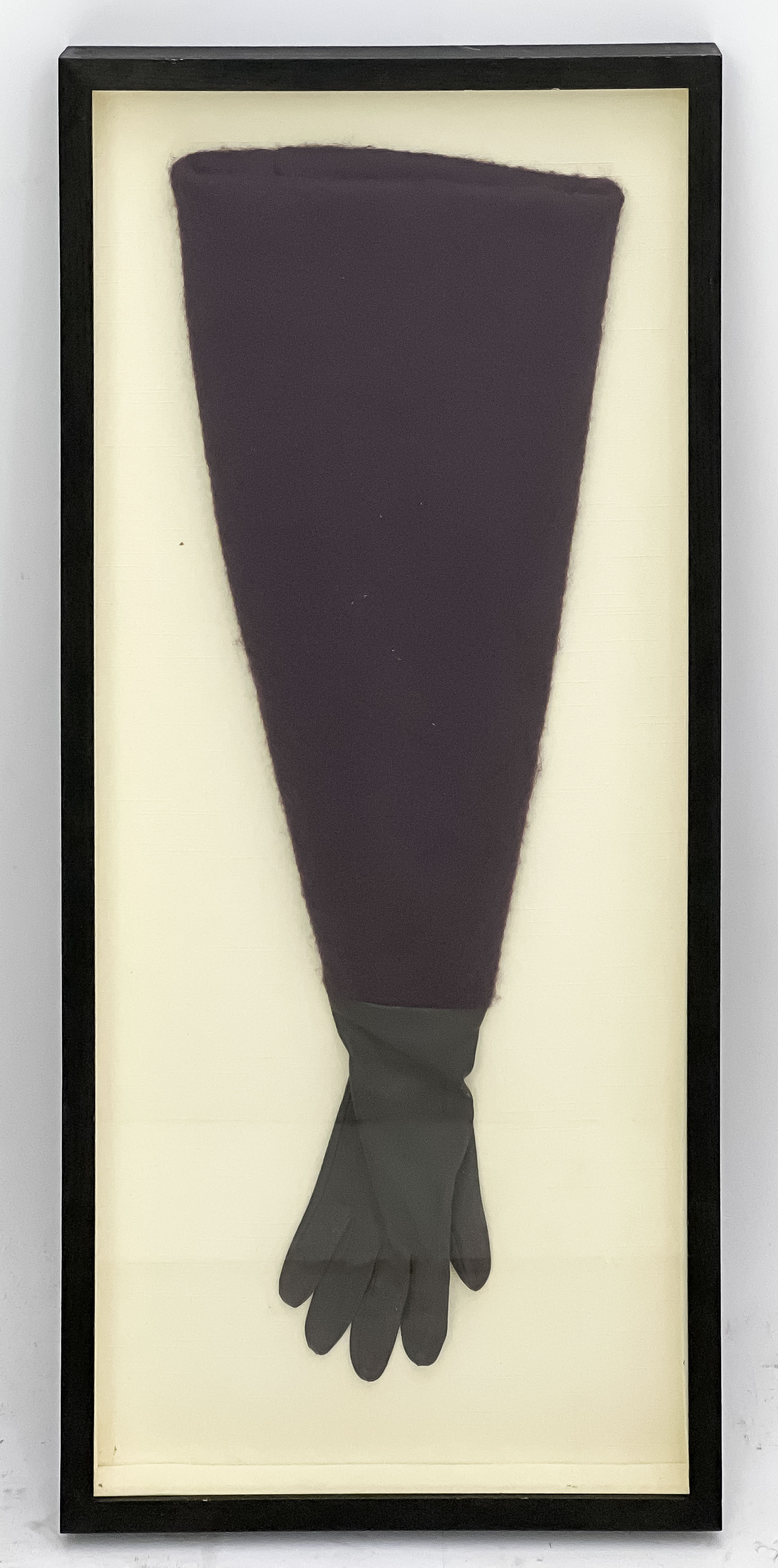 leather glove with burgundy wool extended sleeve, encased in a shadowbox frame that was displayed in the Geoffrey Beene Studio