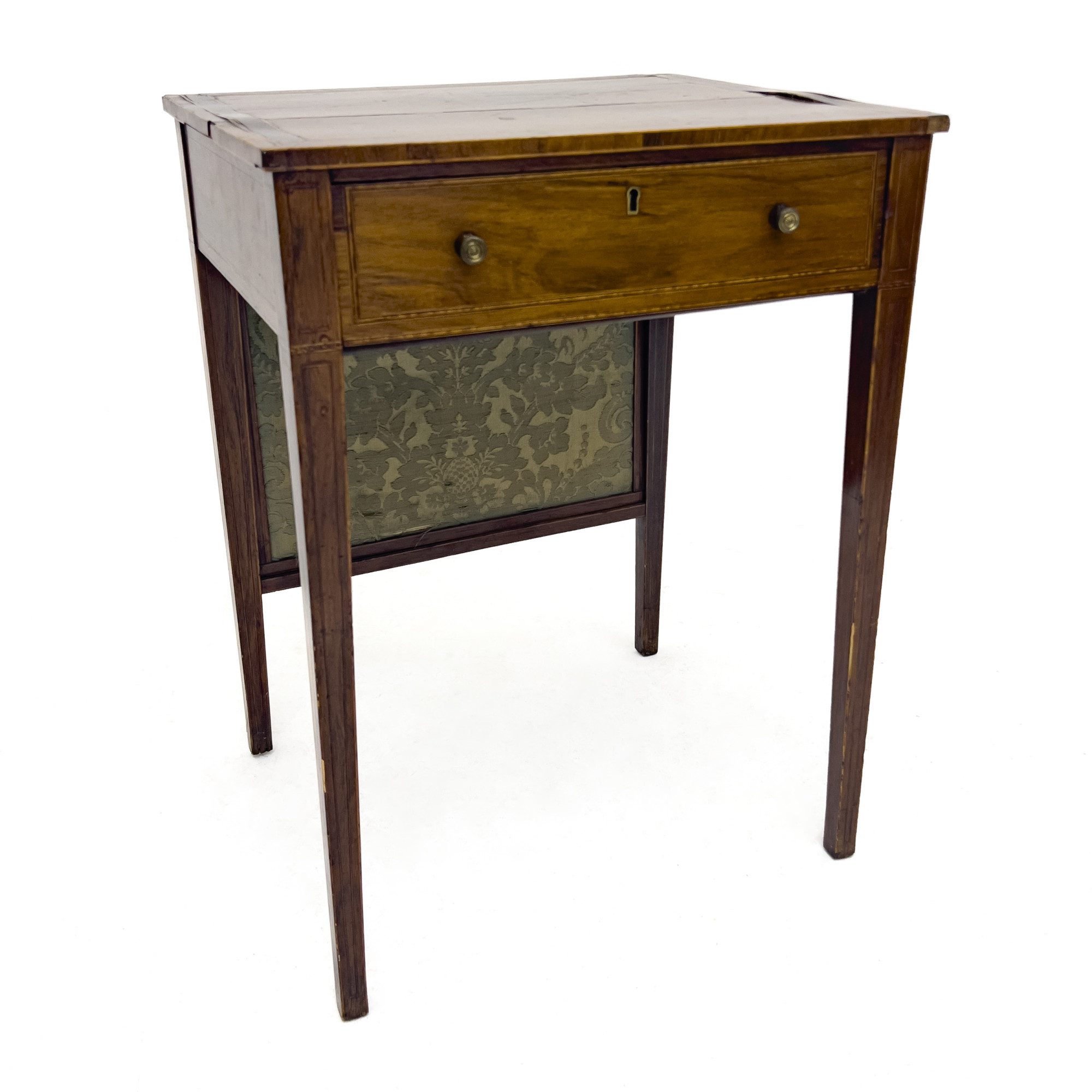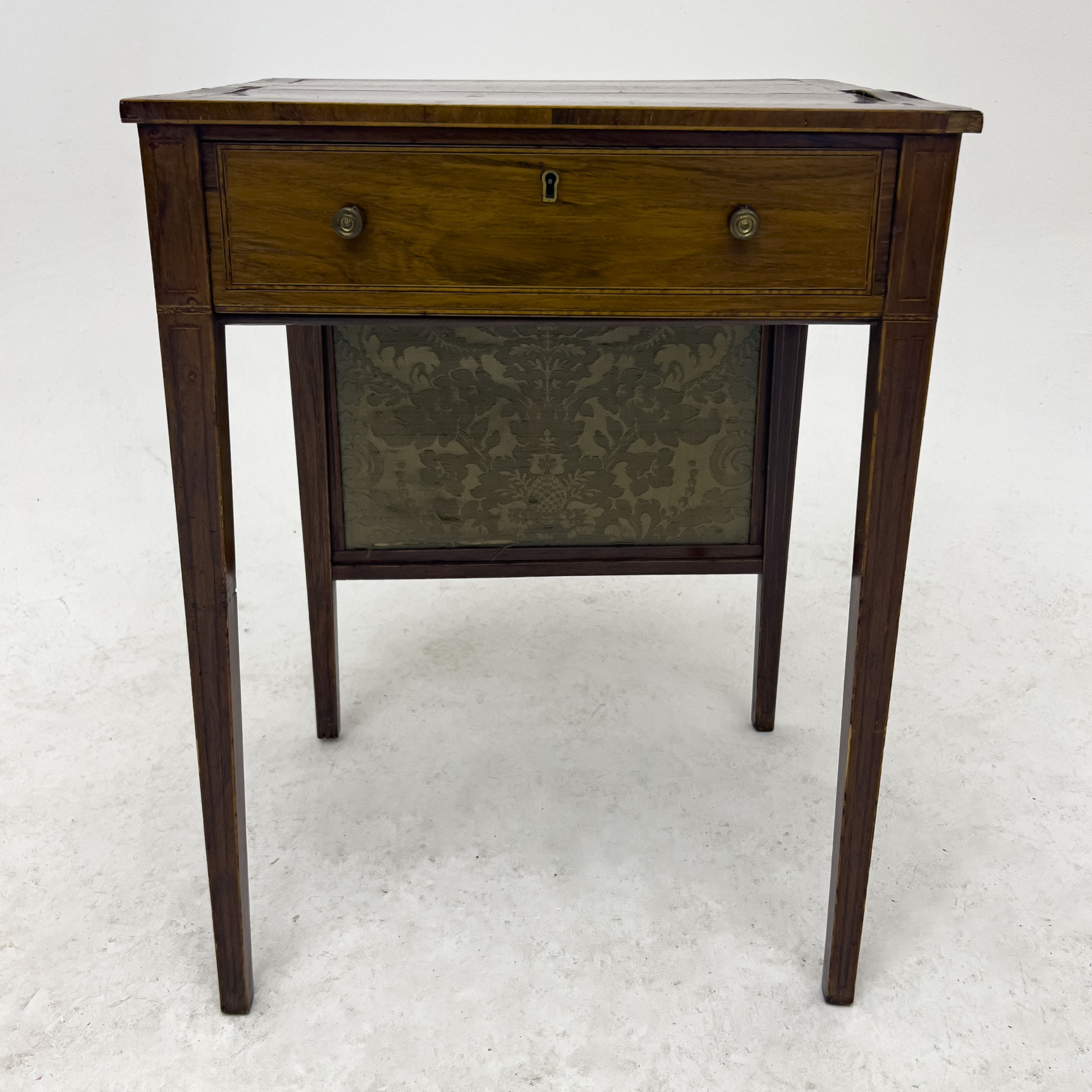 with some areas of loss to veneer and warping to top, minor losses, one detached knob, missing fabric on pull out, with wood splitting to top